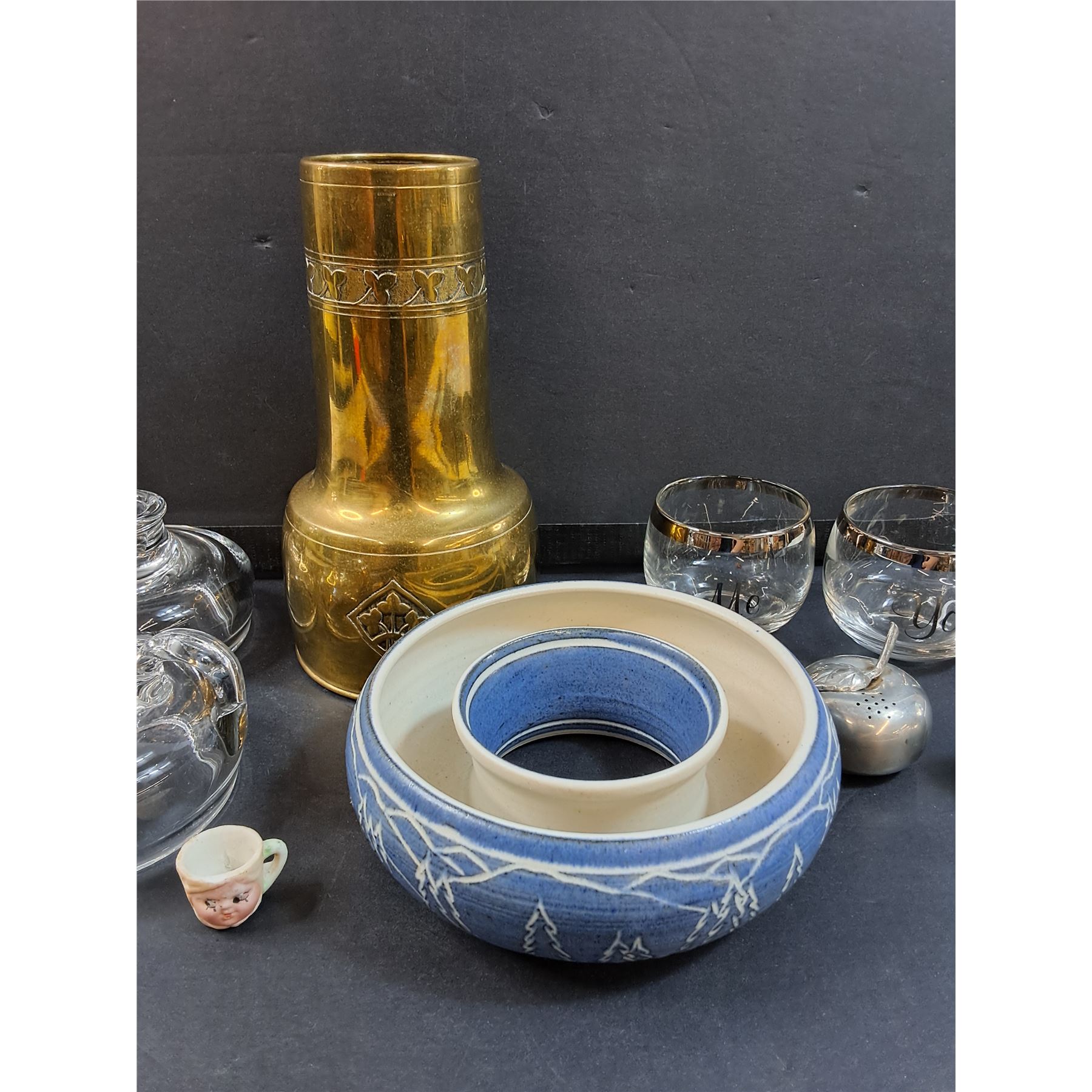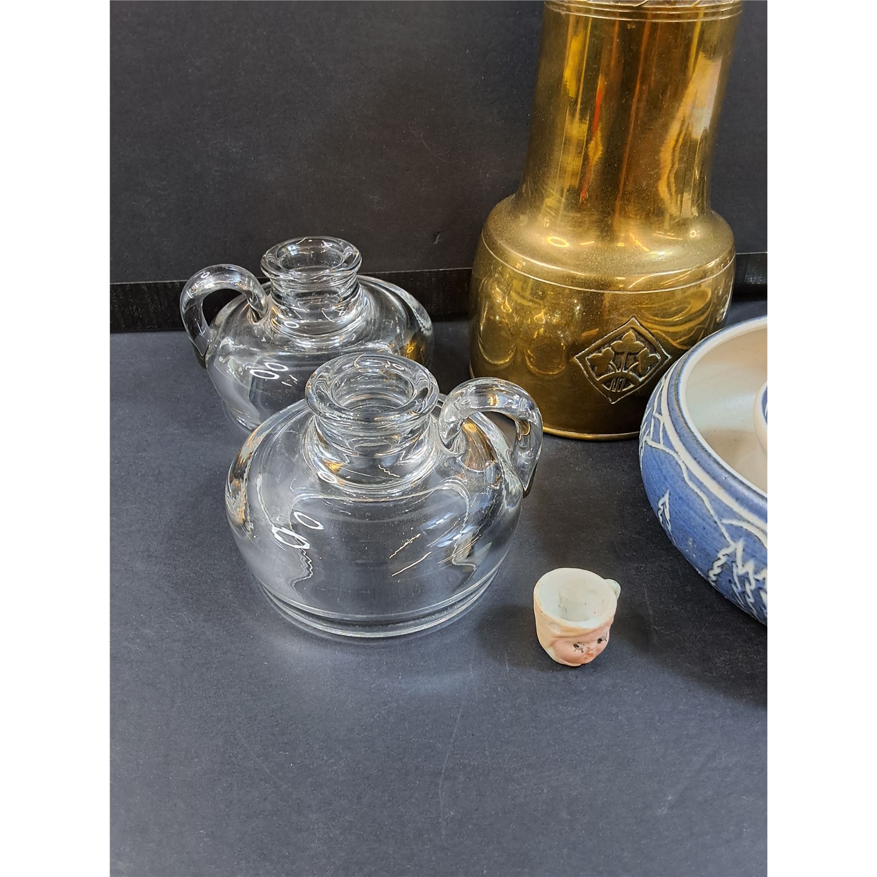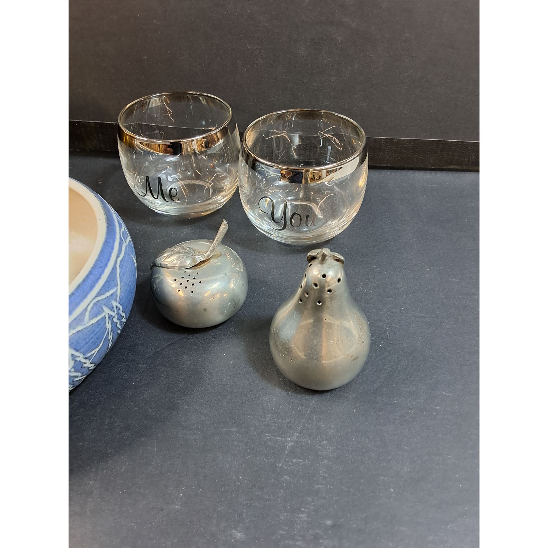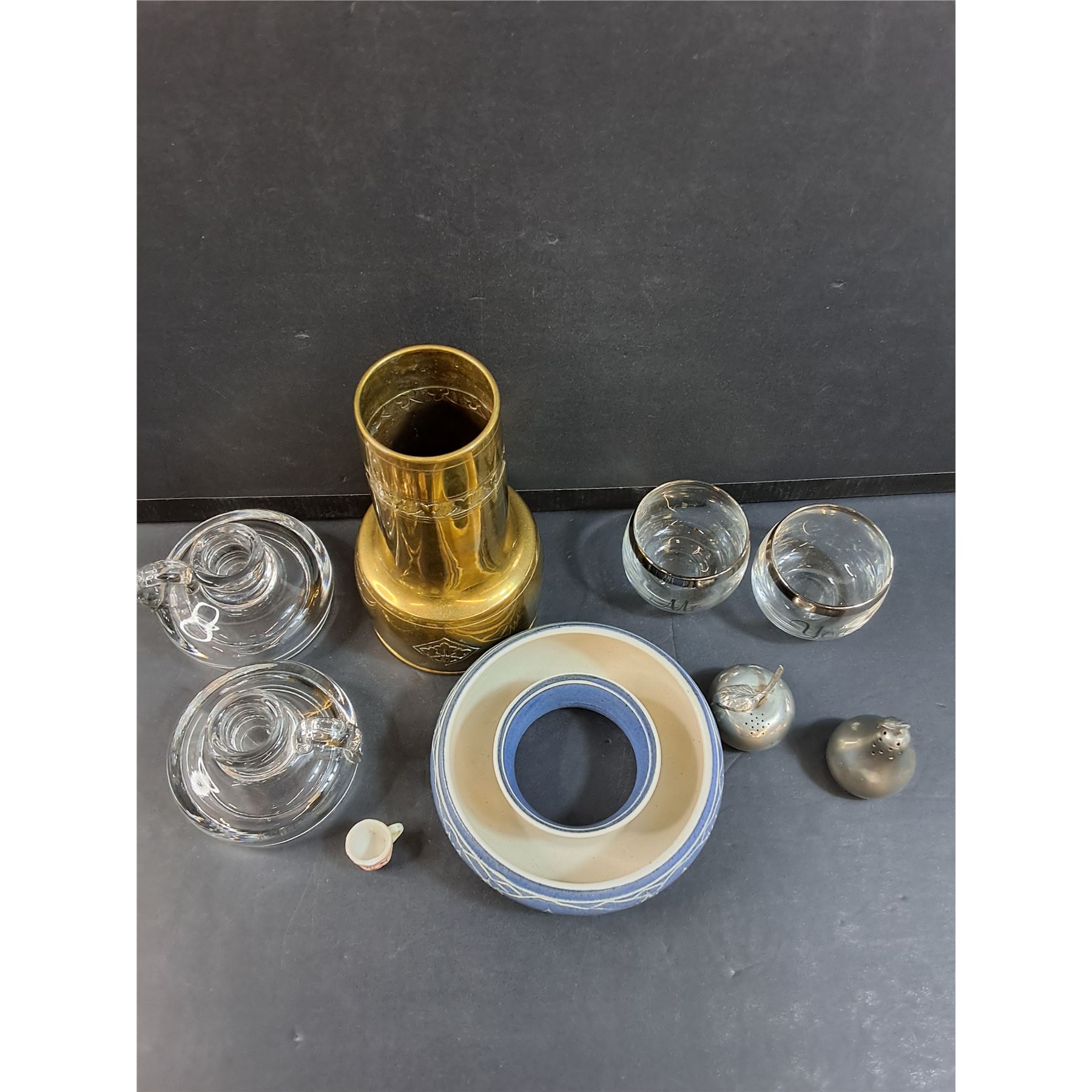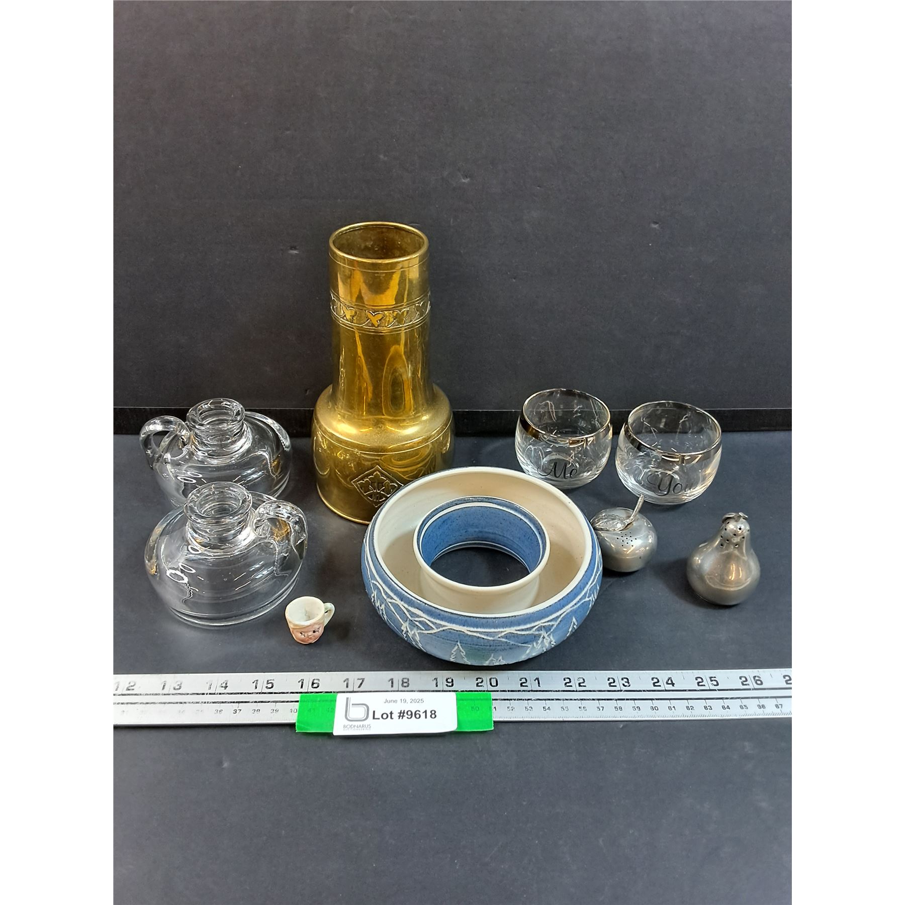 Lot: Pewter Salt & Pepper Shakers, (2) Candle Holders, Brass Plated Vase, Misc