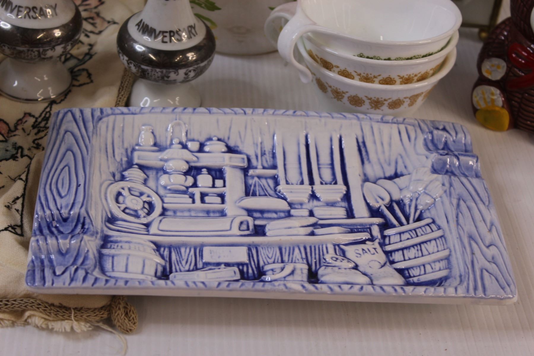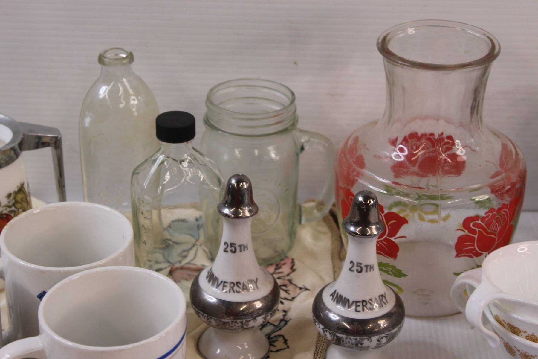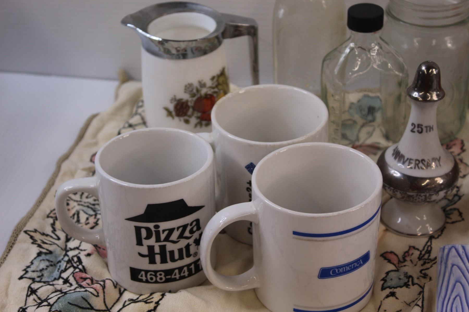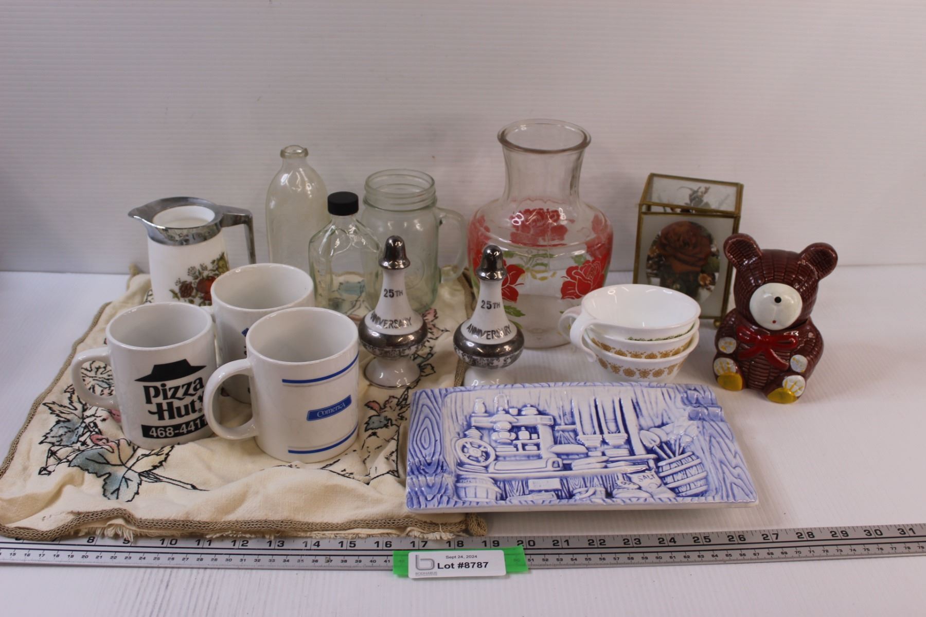 Lot: Pitcher, 25th Anniversary Salt & Pepper Shakers, (3) Mugs, Blue Ashtray, (3) Corelle Tea Cups, Misc.