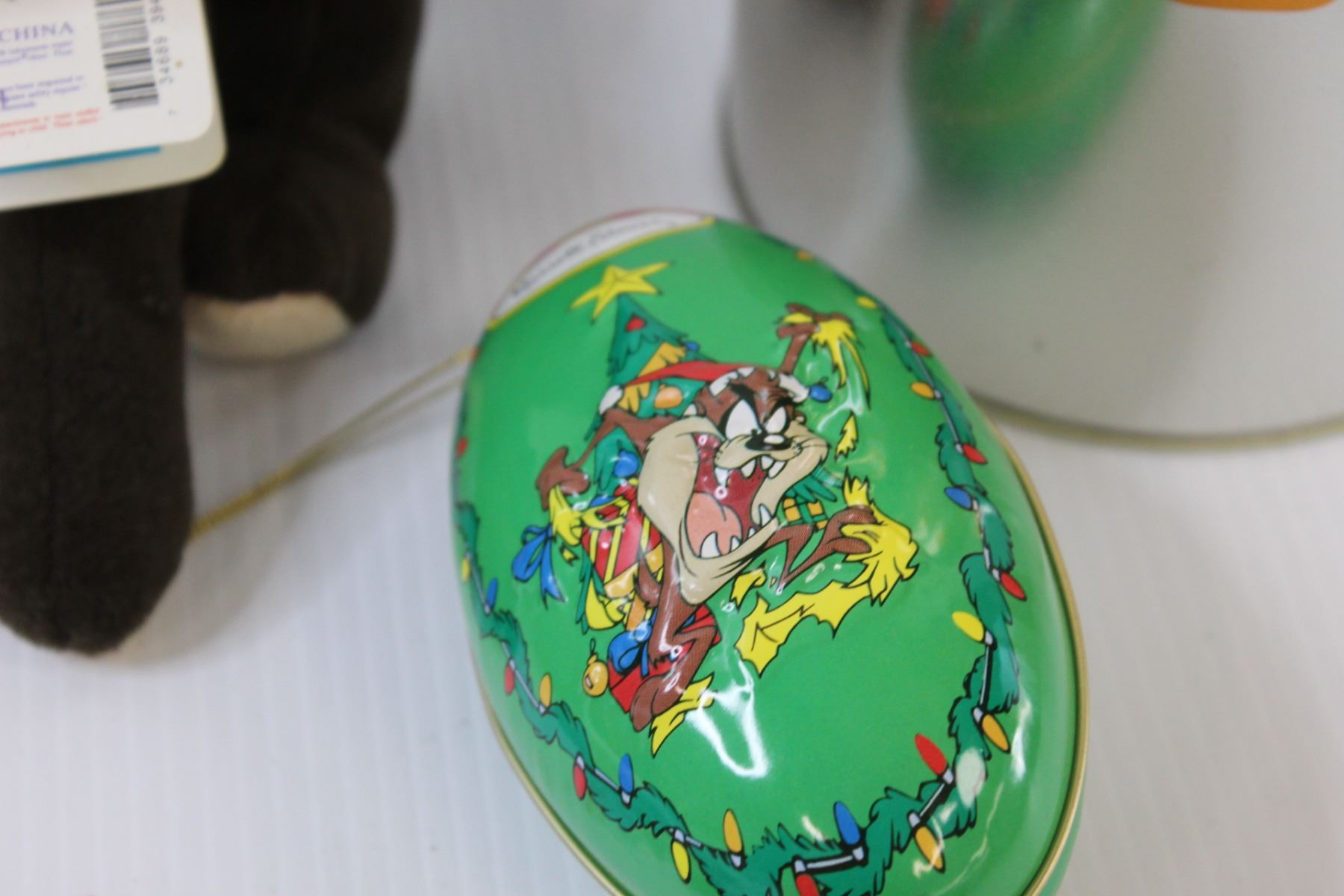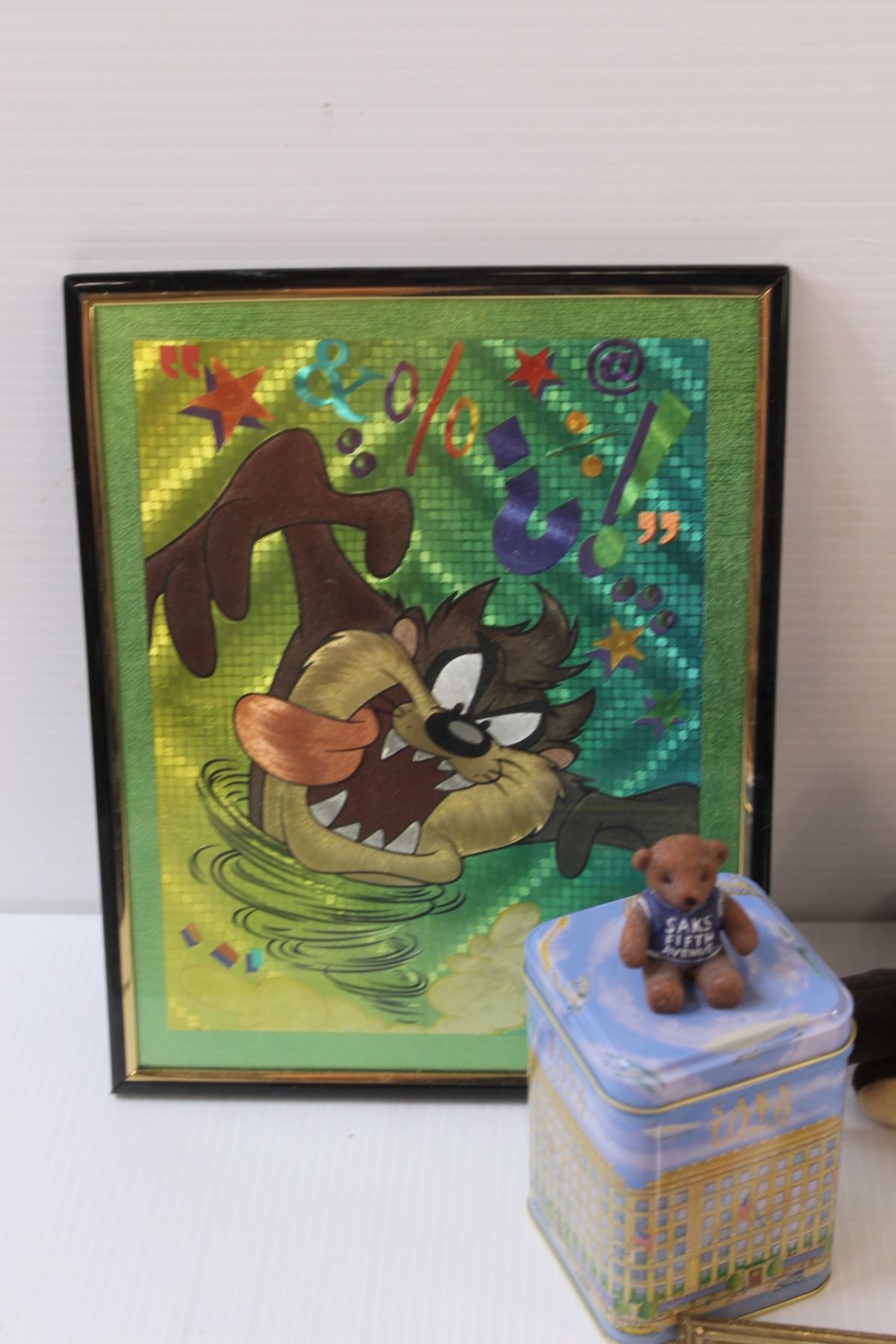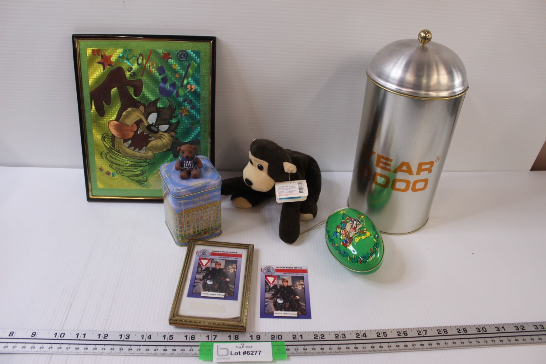 Lot: Tasmanian devil Picture & Ornament, Year 200 Tin, Monkey Plush