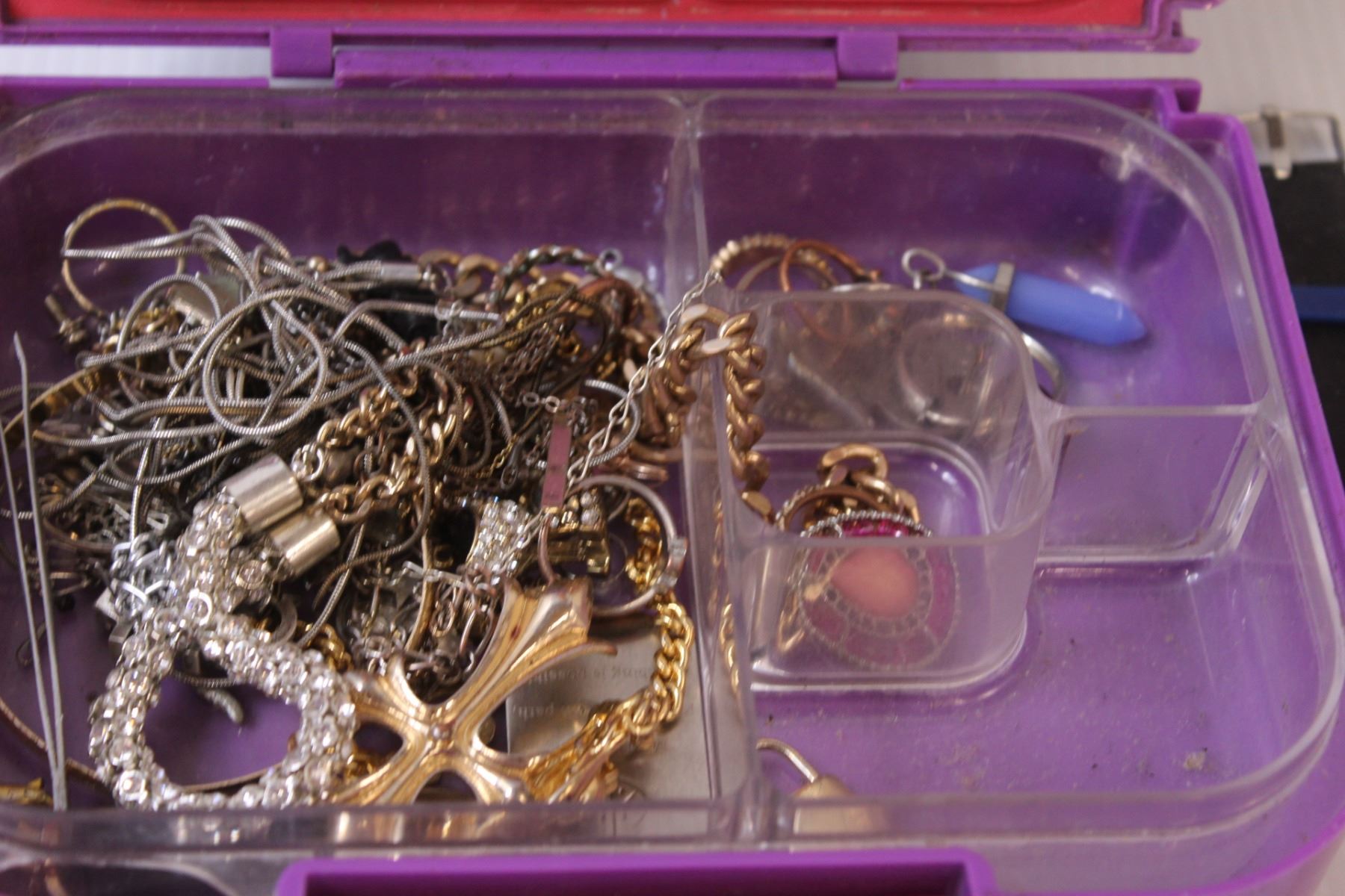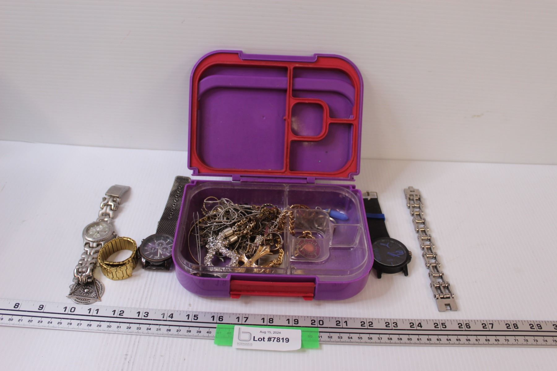 Lot: Watches, Costume Jewelry & Misc. in Lunch Container