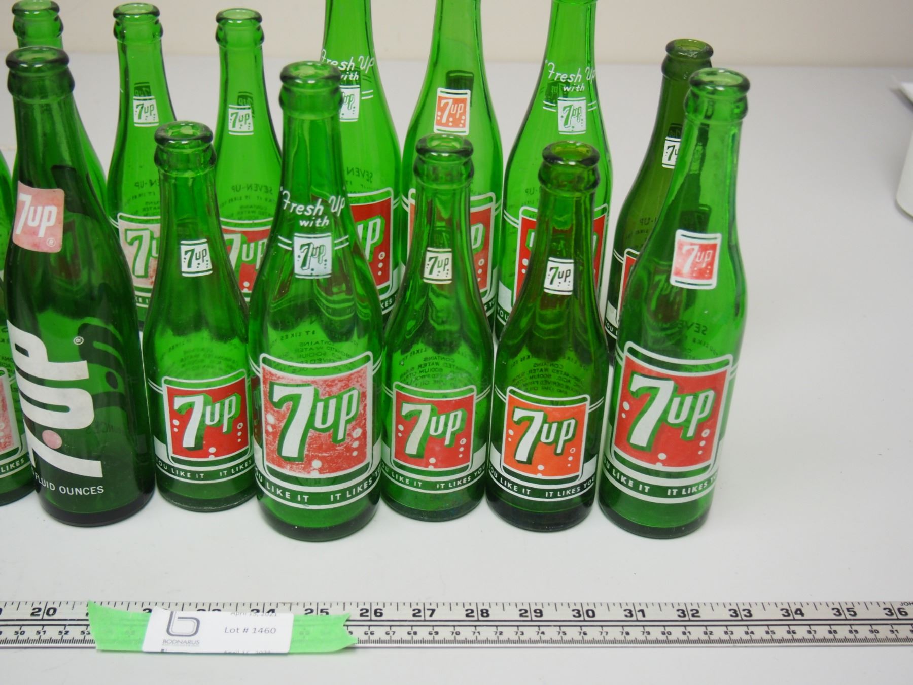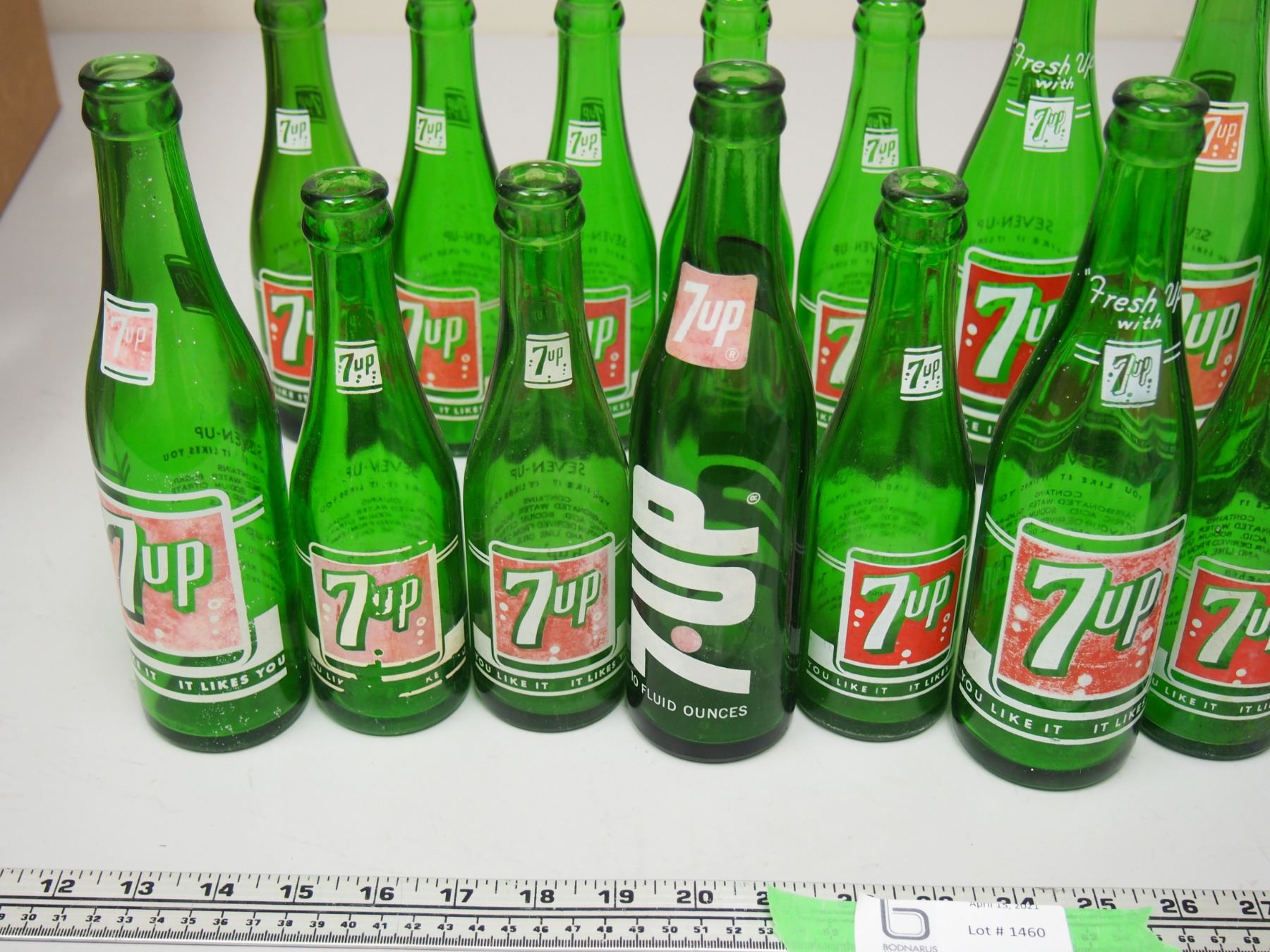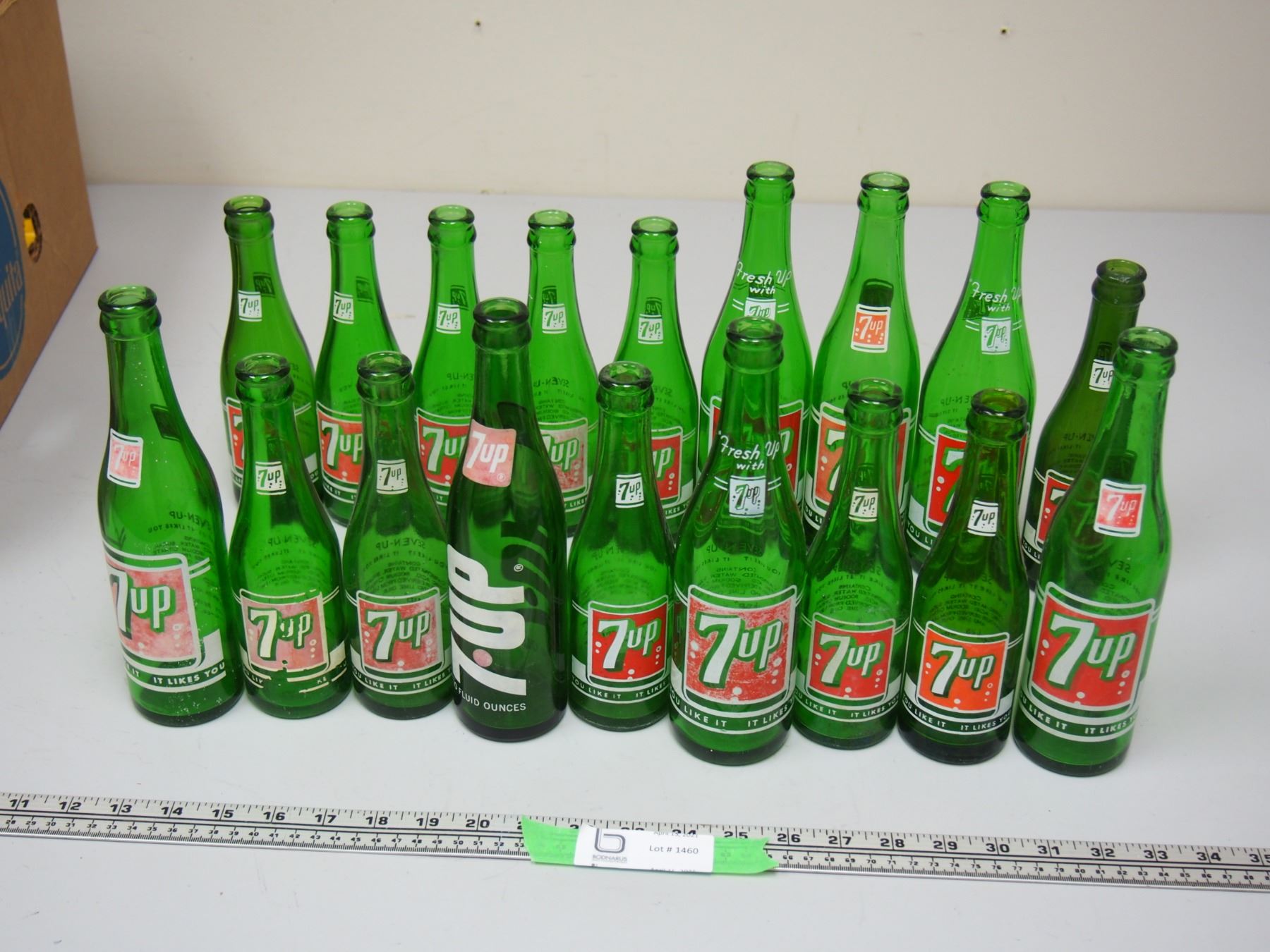 Lot of 18 Vintage 7oz, 10oz, and 12oz 7Up Pop Bottles