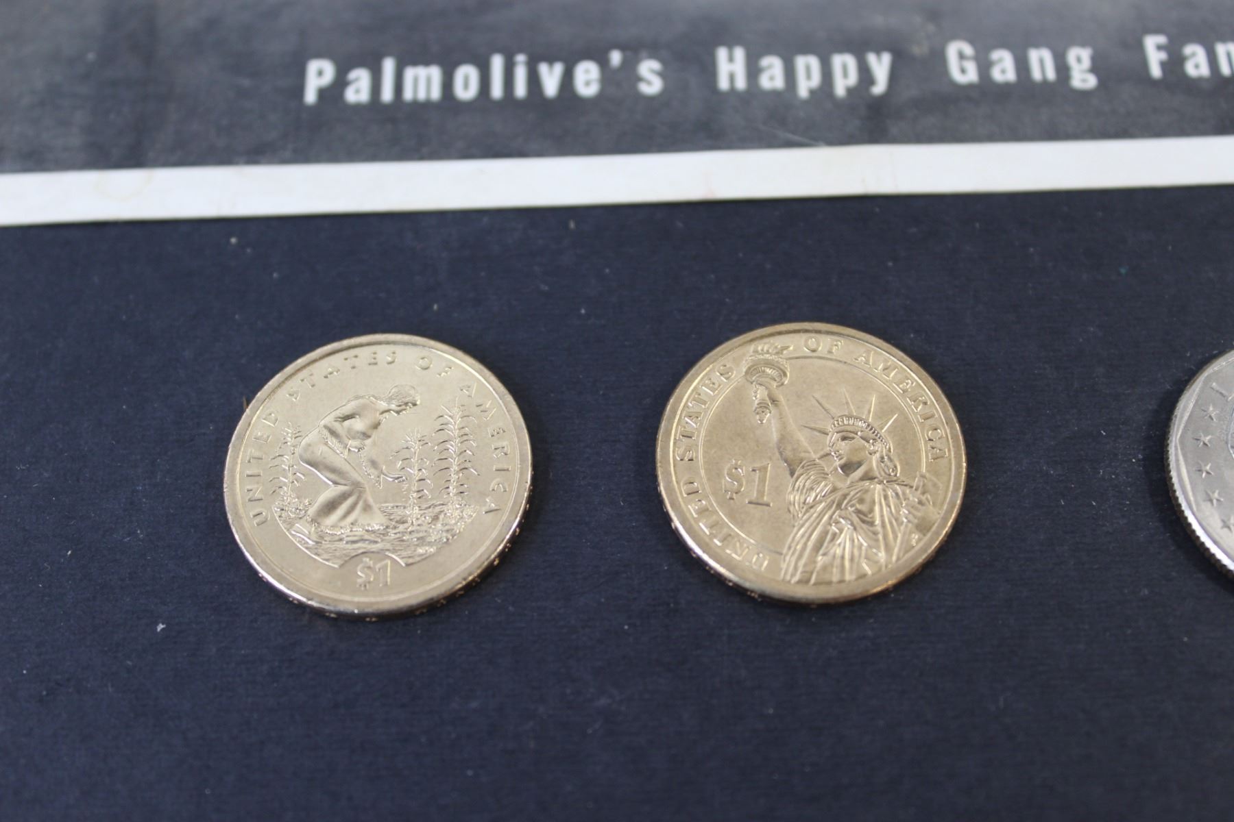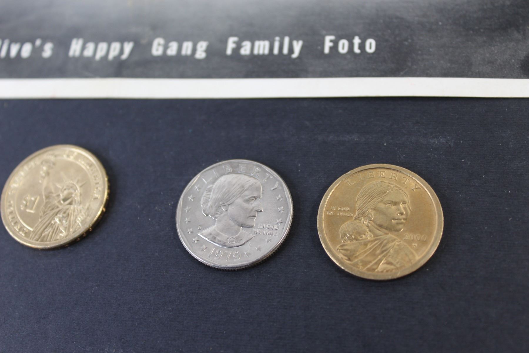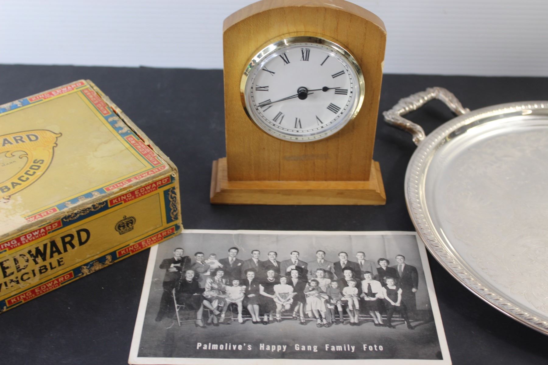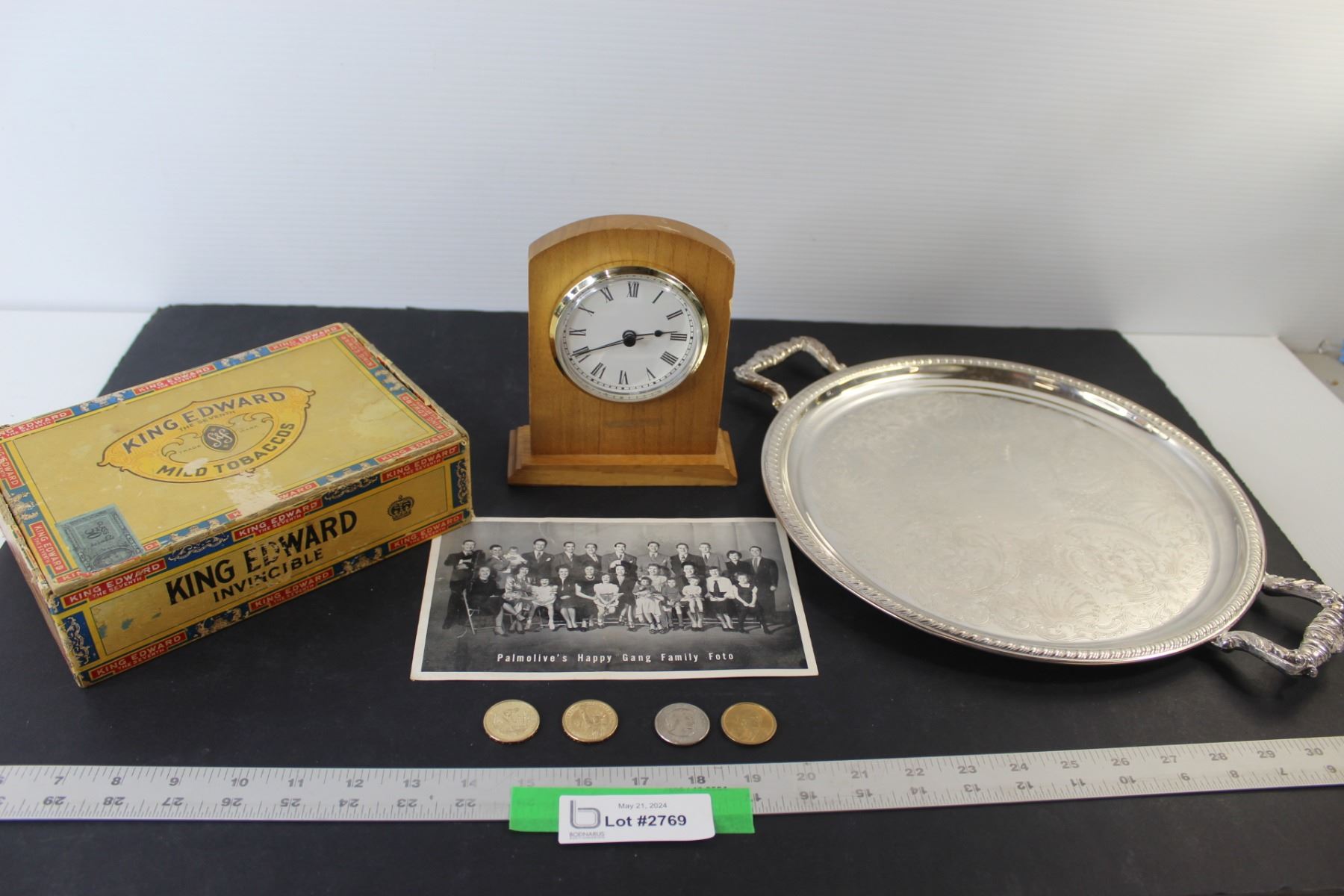 Lot of: (2) American Dollar Coins (1979 & 2000) (2) American Dollar Coins (No Year - Unauthenticated), Metal Serving Tray, Clock, Tobacco Box