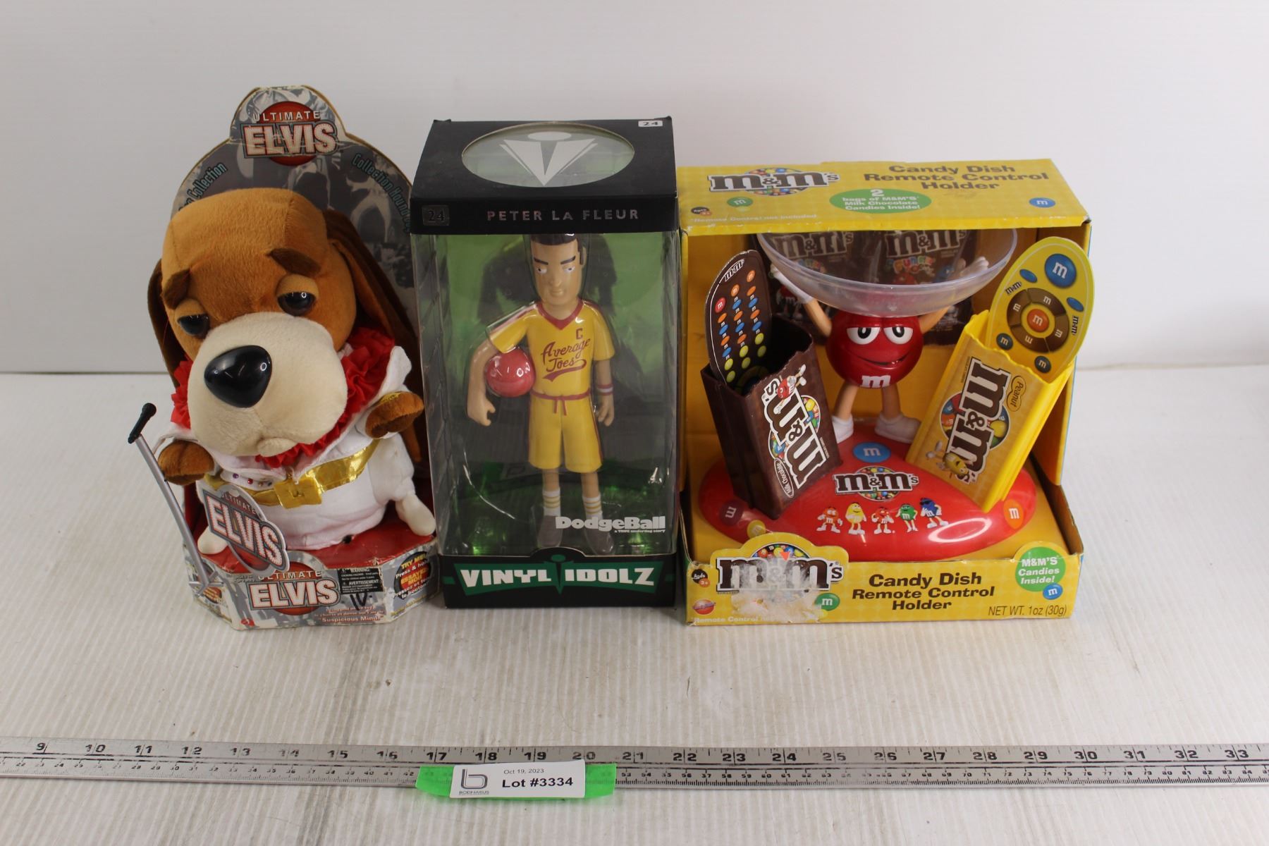 Lot of (3) Vintage Toys in Original Boxes - M&Ms Candy Dish Remote Control Holder, Ultimate Singing Elvis Hound Hog, Vinyl Idolz Peter LaFleur Dodgeball Action Figure