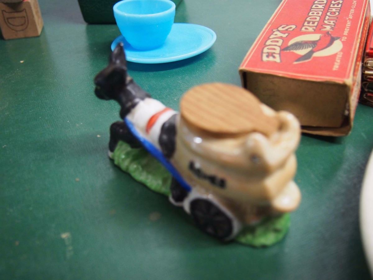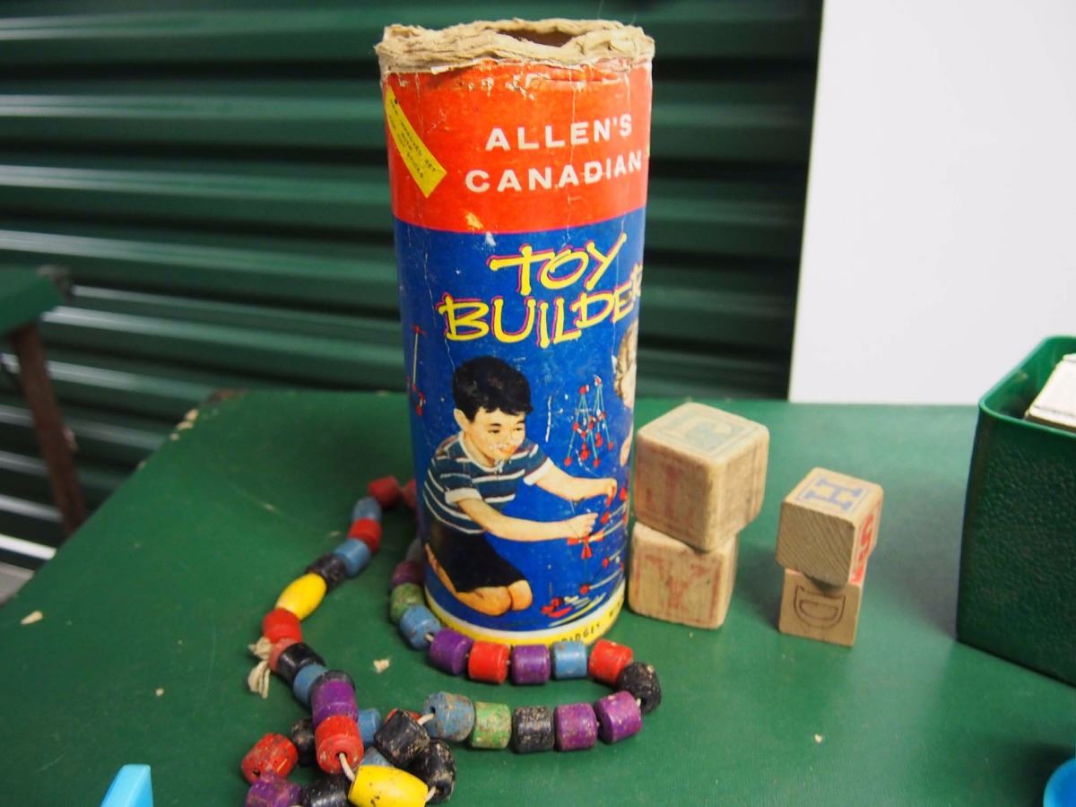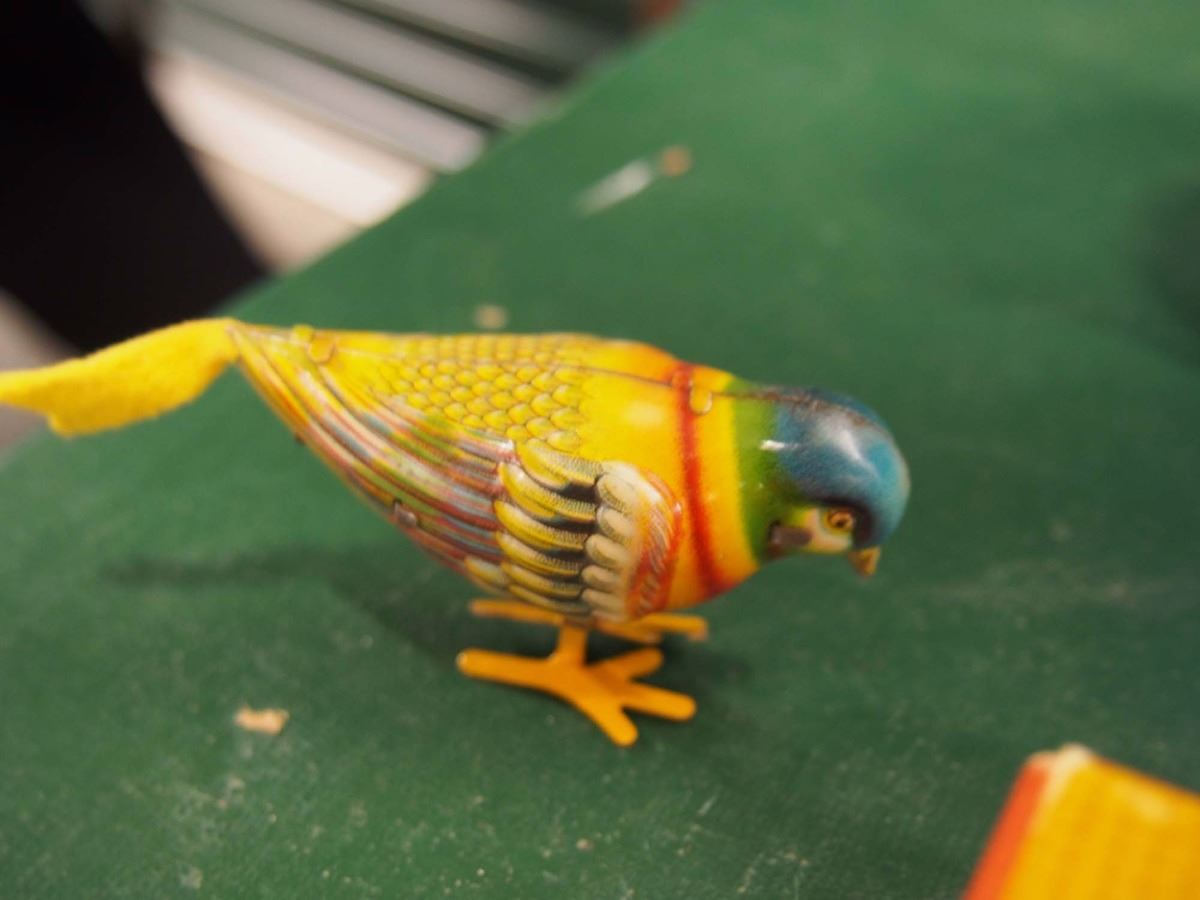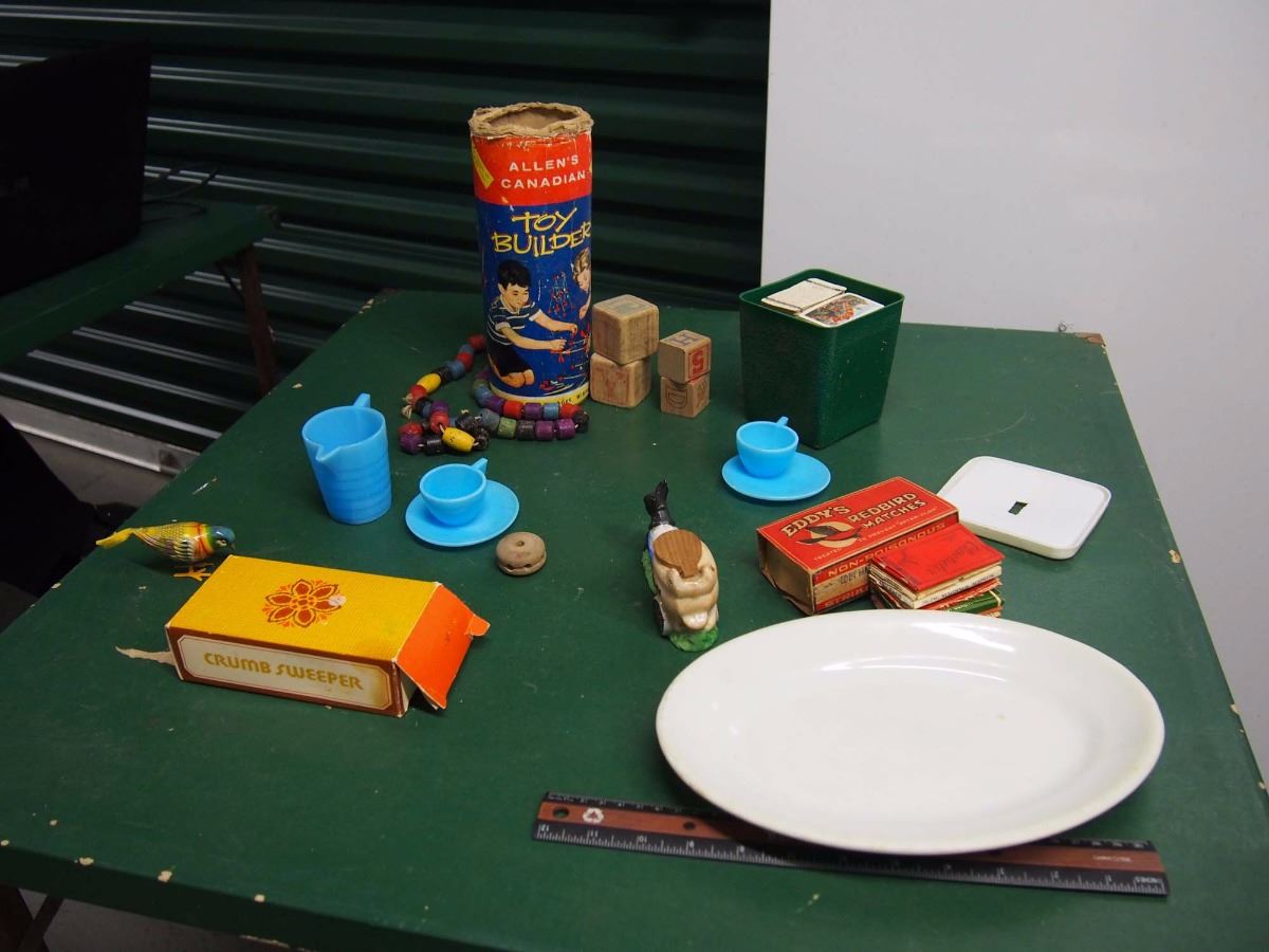 Lot of Assorted Toys (Tin Bird, Dinosaur Cards, Crumb Sweeper, Tea set)