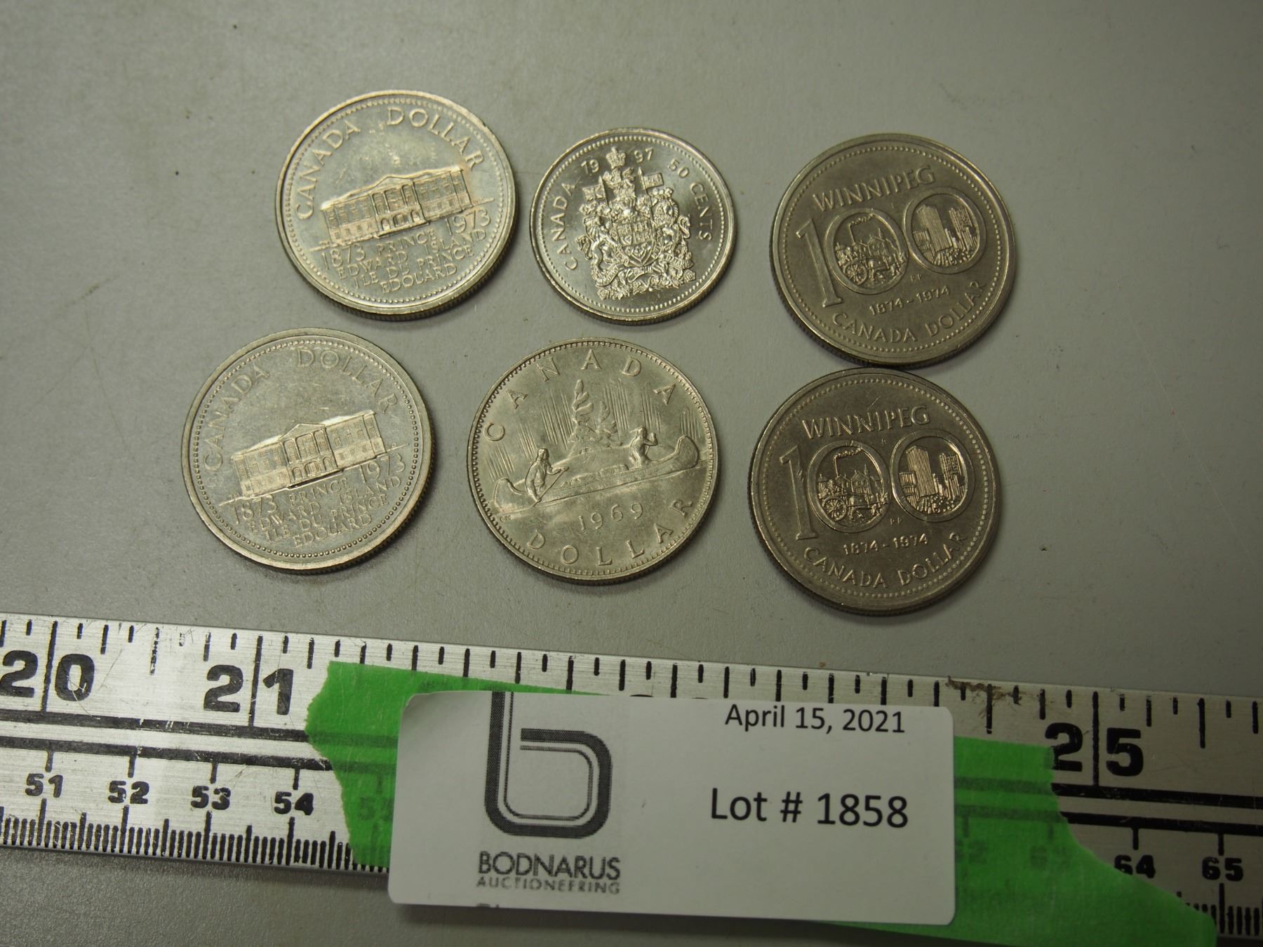 Lot of Canadian 1 Dollar Coins 1873-1973, 1874-1974, 1969 and 1997 50 Cent Coin