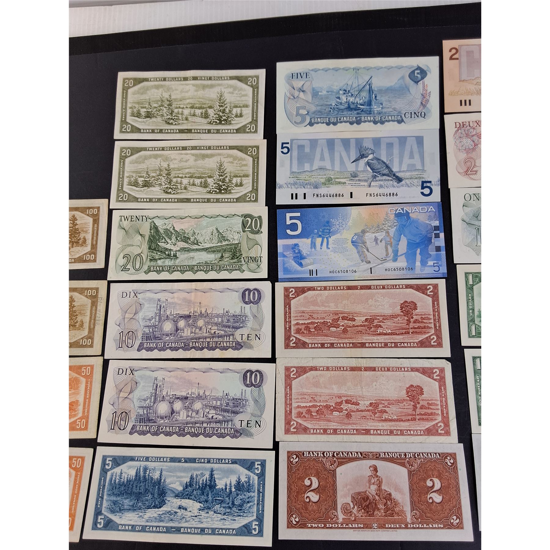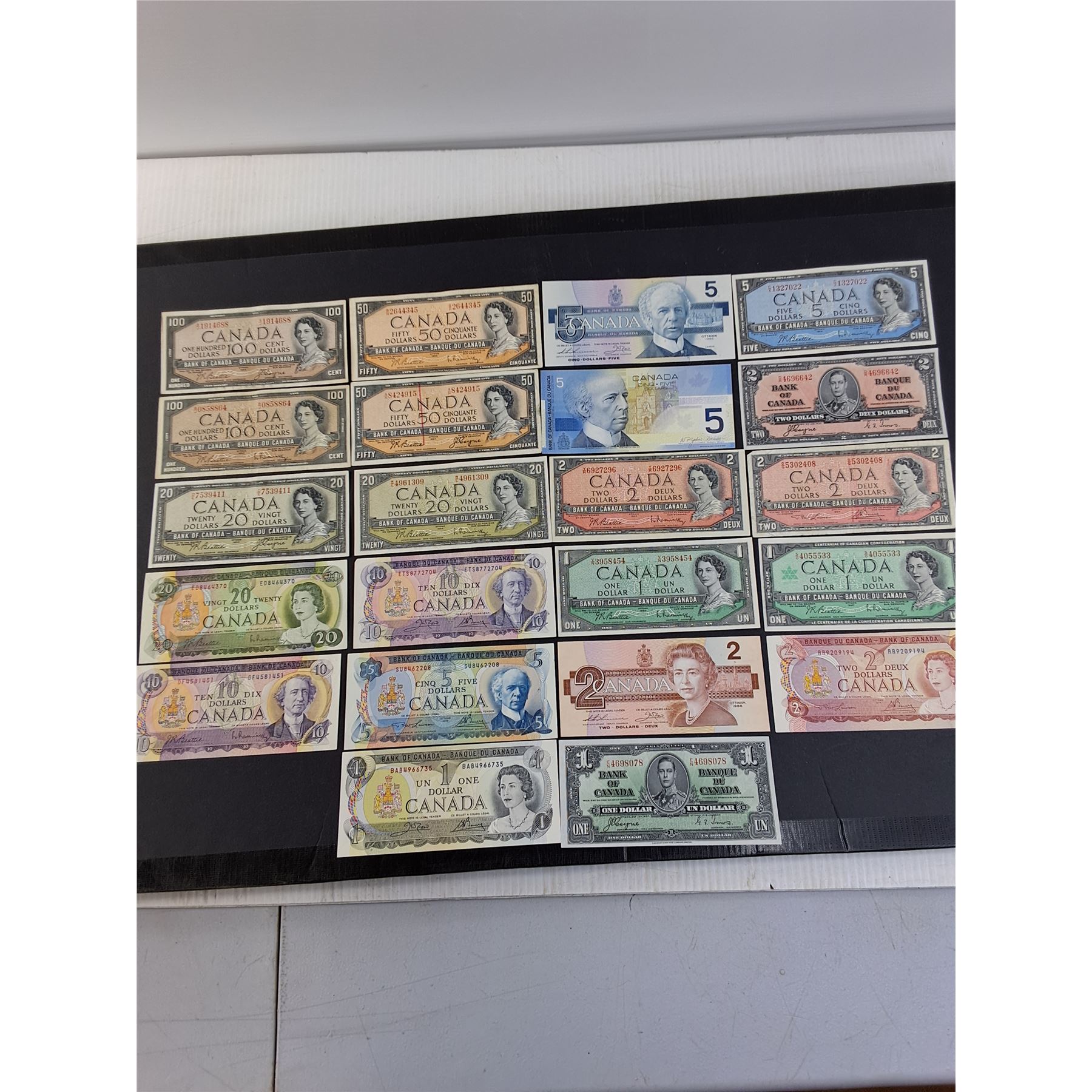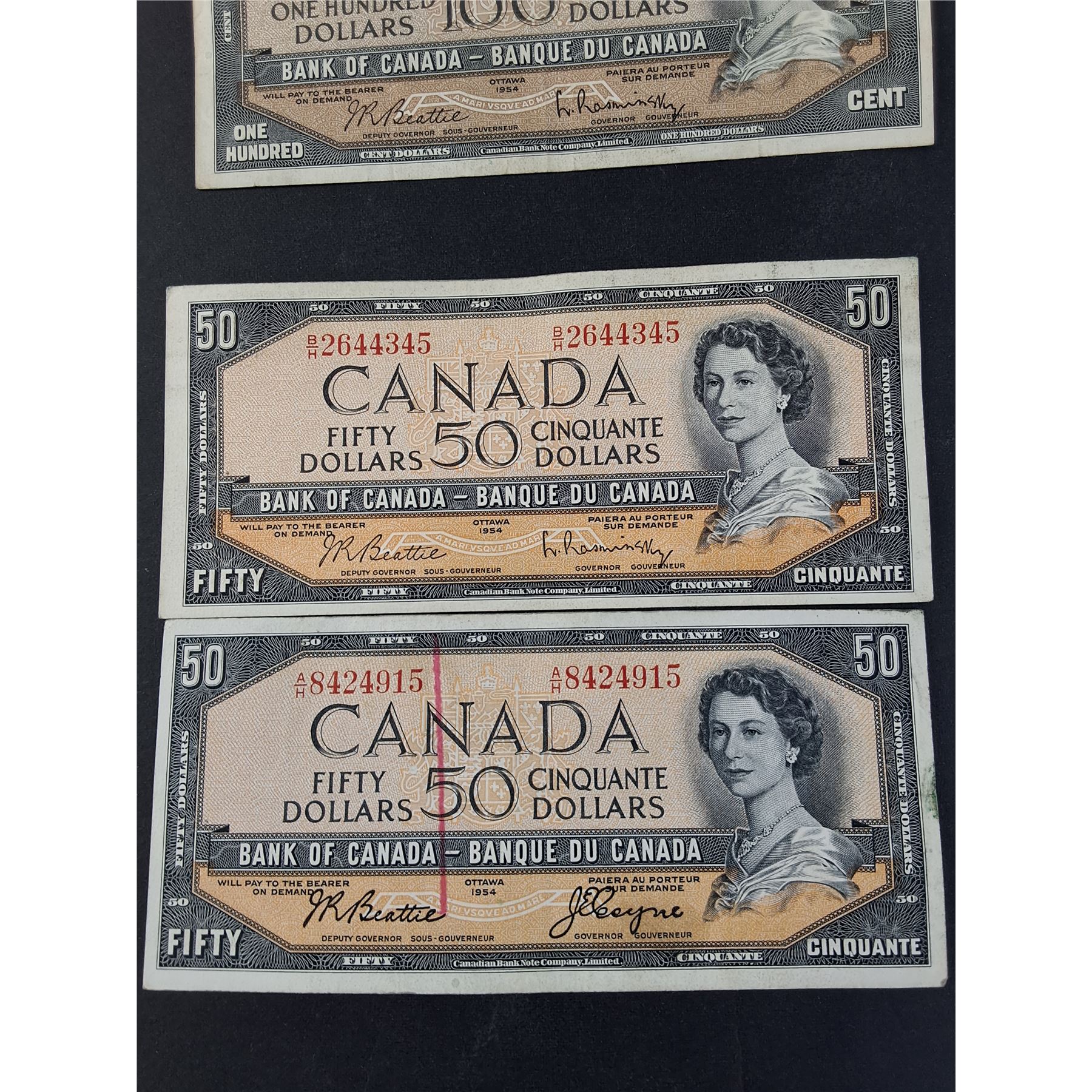 ^Lot of Canadaian Older Currency. Highlights are the Devil Face100, 50, and 20 Denominations. Face value 414 Dollars. All bills are in good shape.