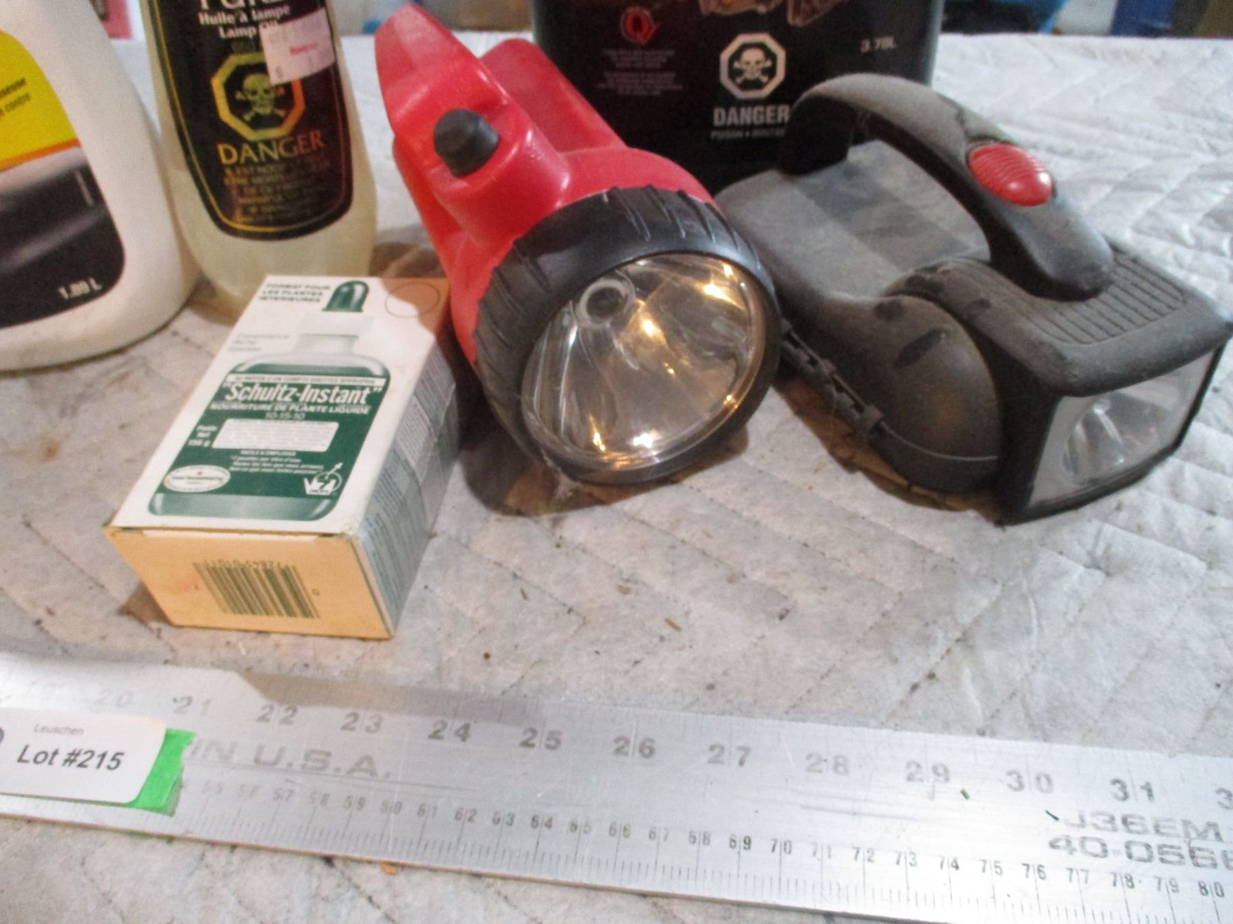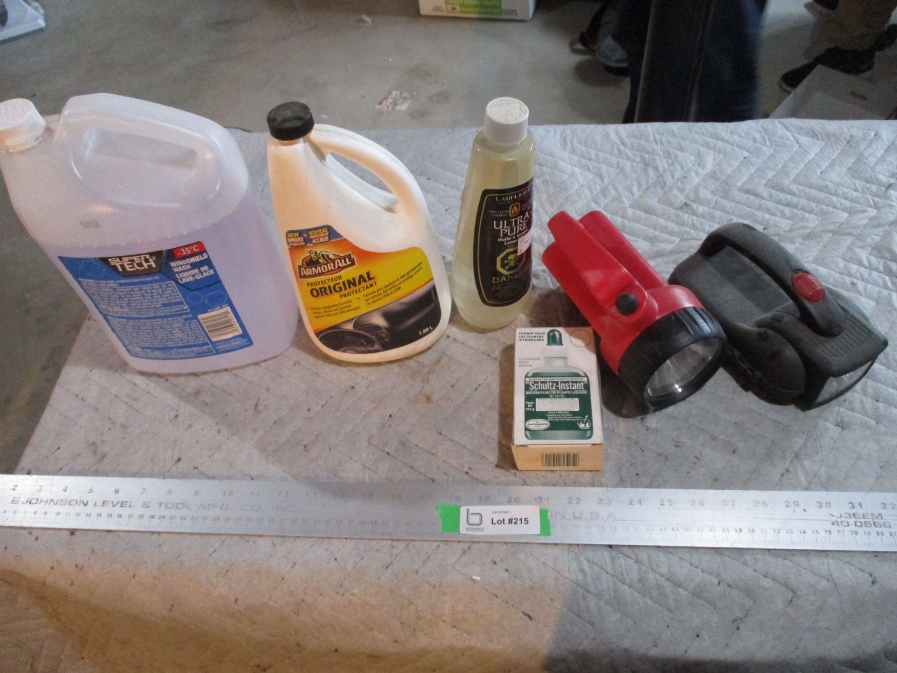 Lot of Flashlights, Armour All, Windshield Washer Fluid, Lamp Oil, Misc.