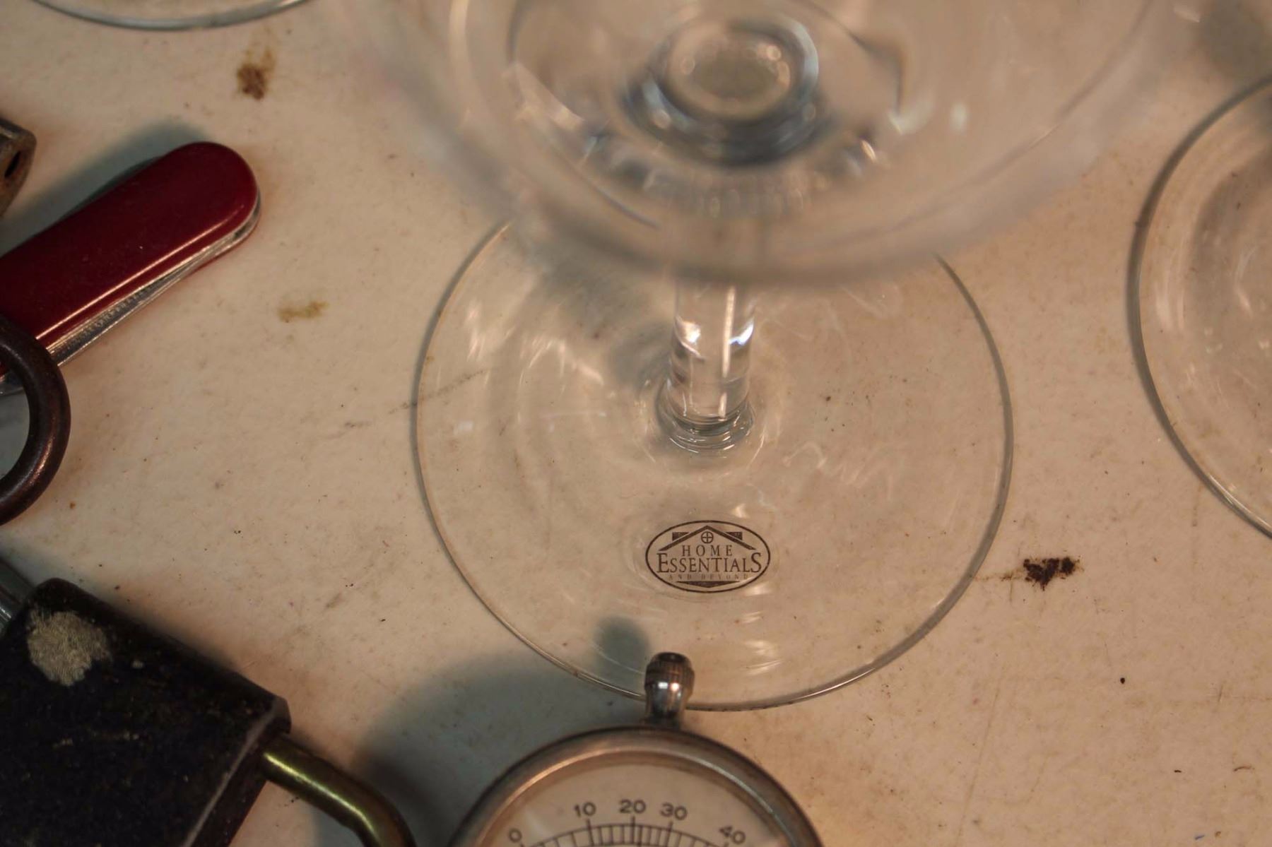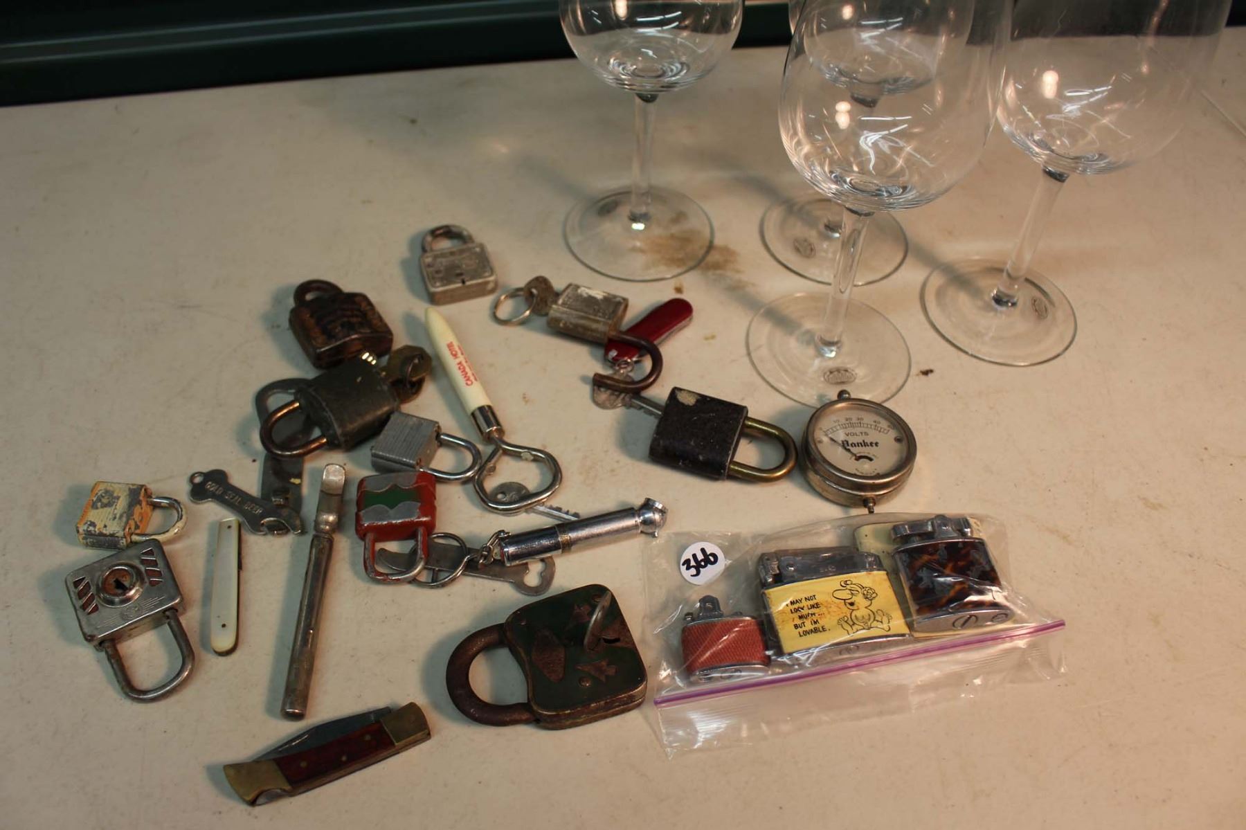 Lot of Lighters, Locks, Keys, Pocket Knives,Etc & 4 Wine Glasses