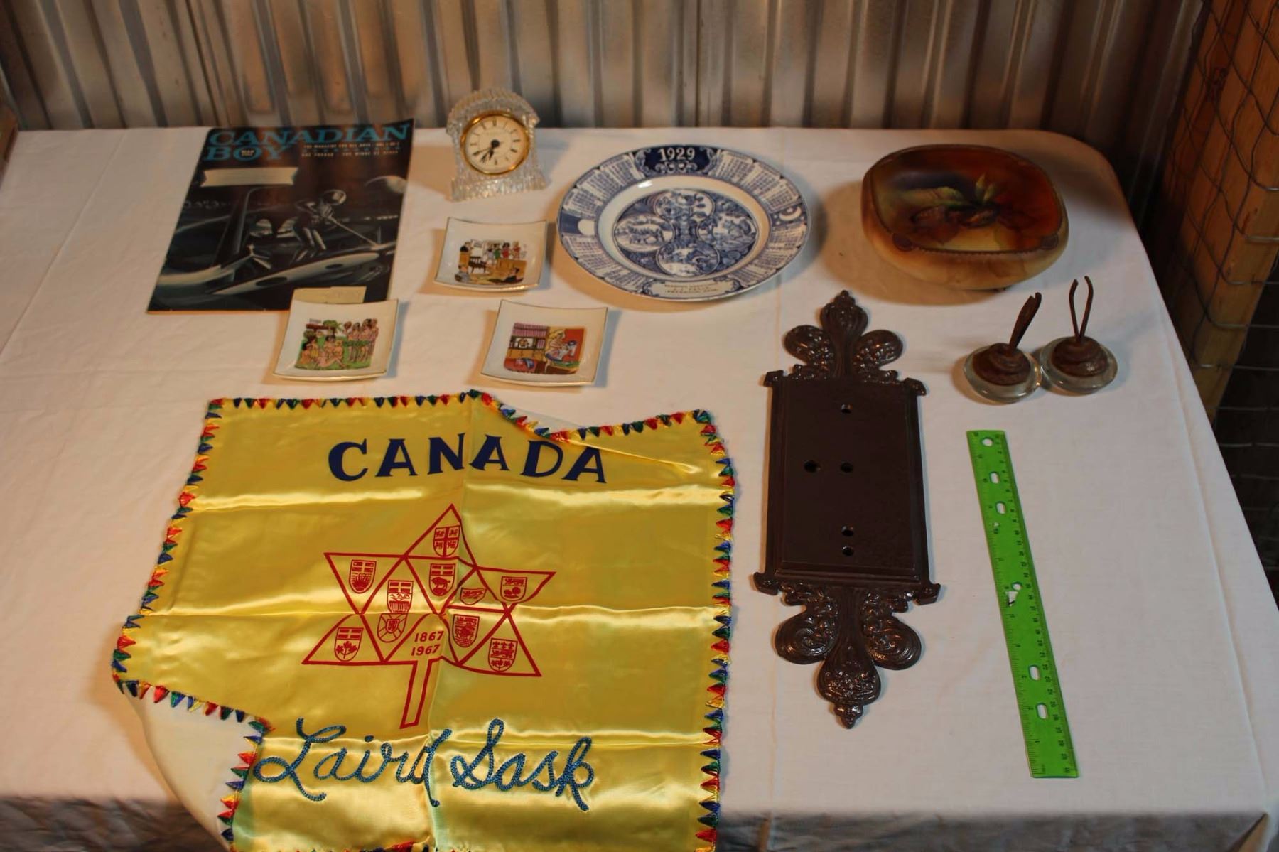 Lot of Misc. Adult Joke Ashtrays, Canadian Boy Magazine, 1965, 1929 Plate, Centennial Fabric