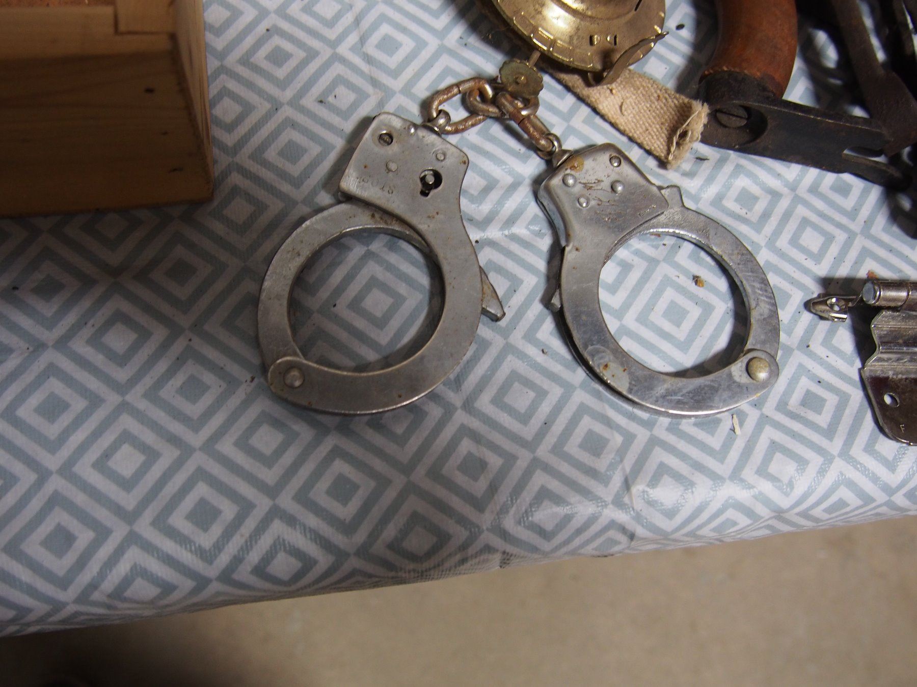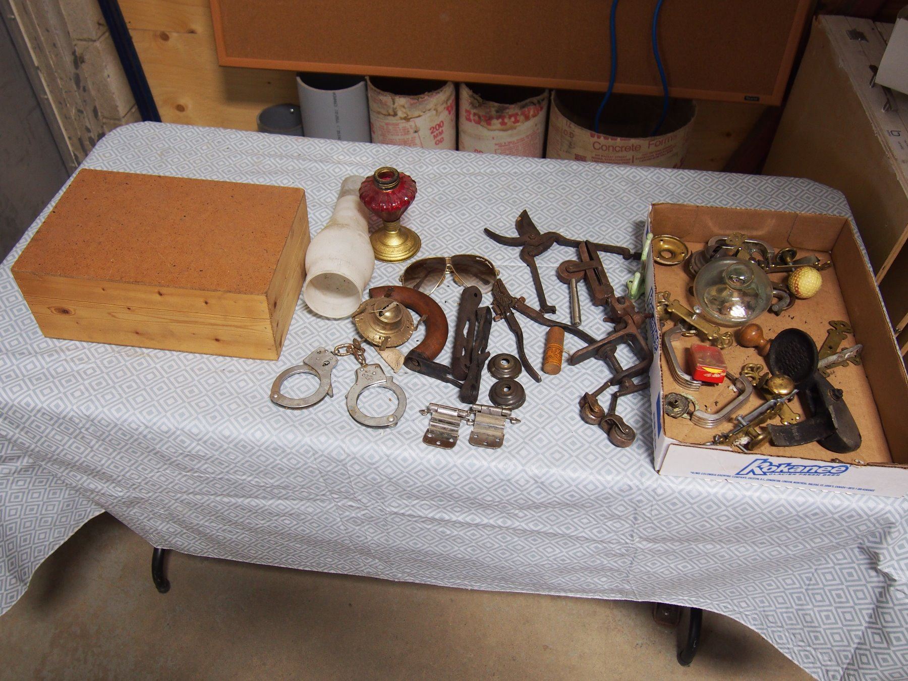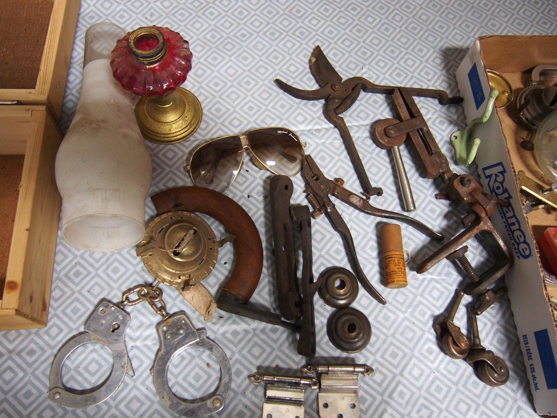 Lot of Misc Items: handcuffs, lamp chimney, vintage tools, hardware