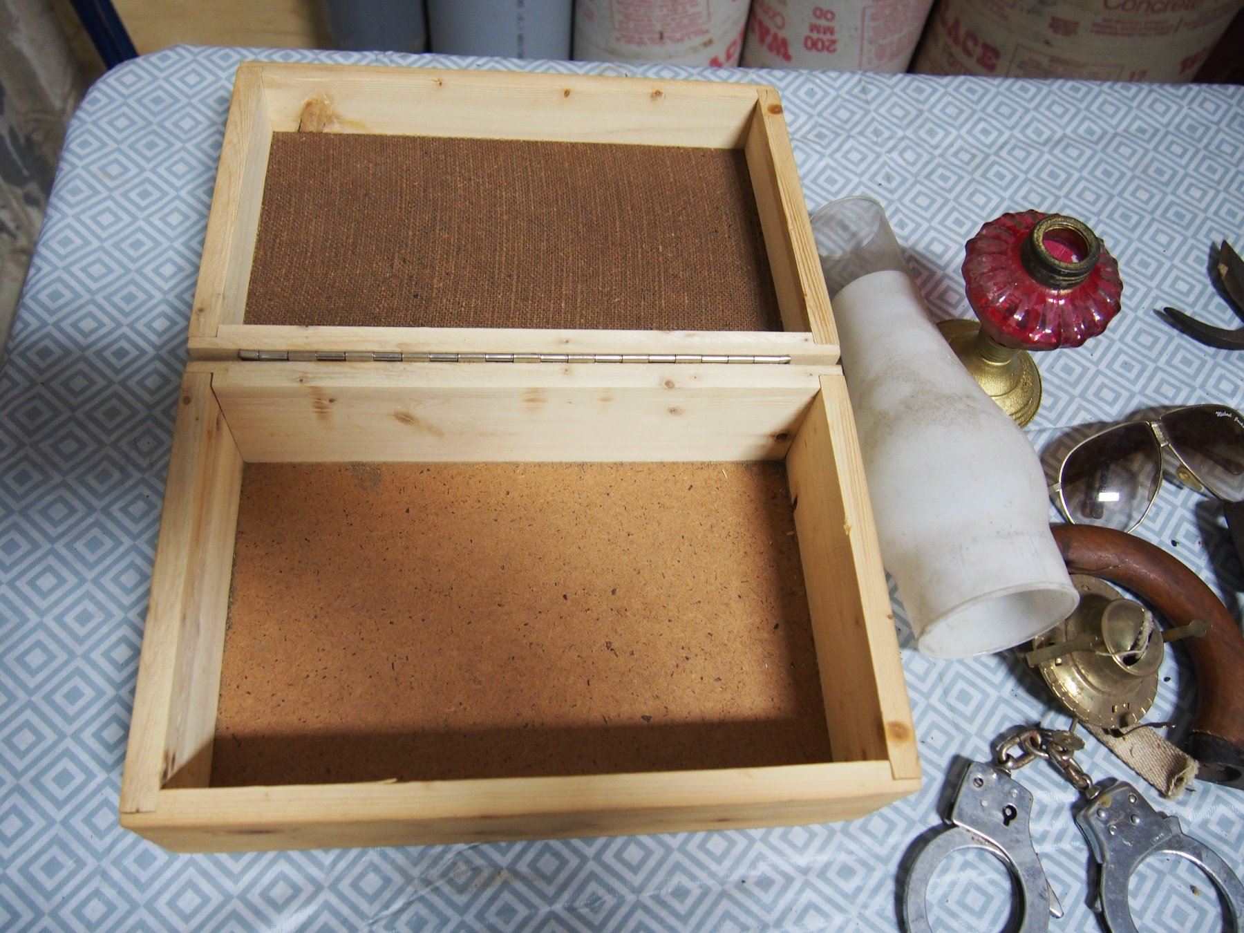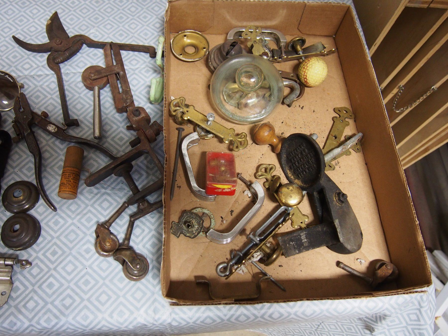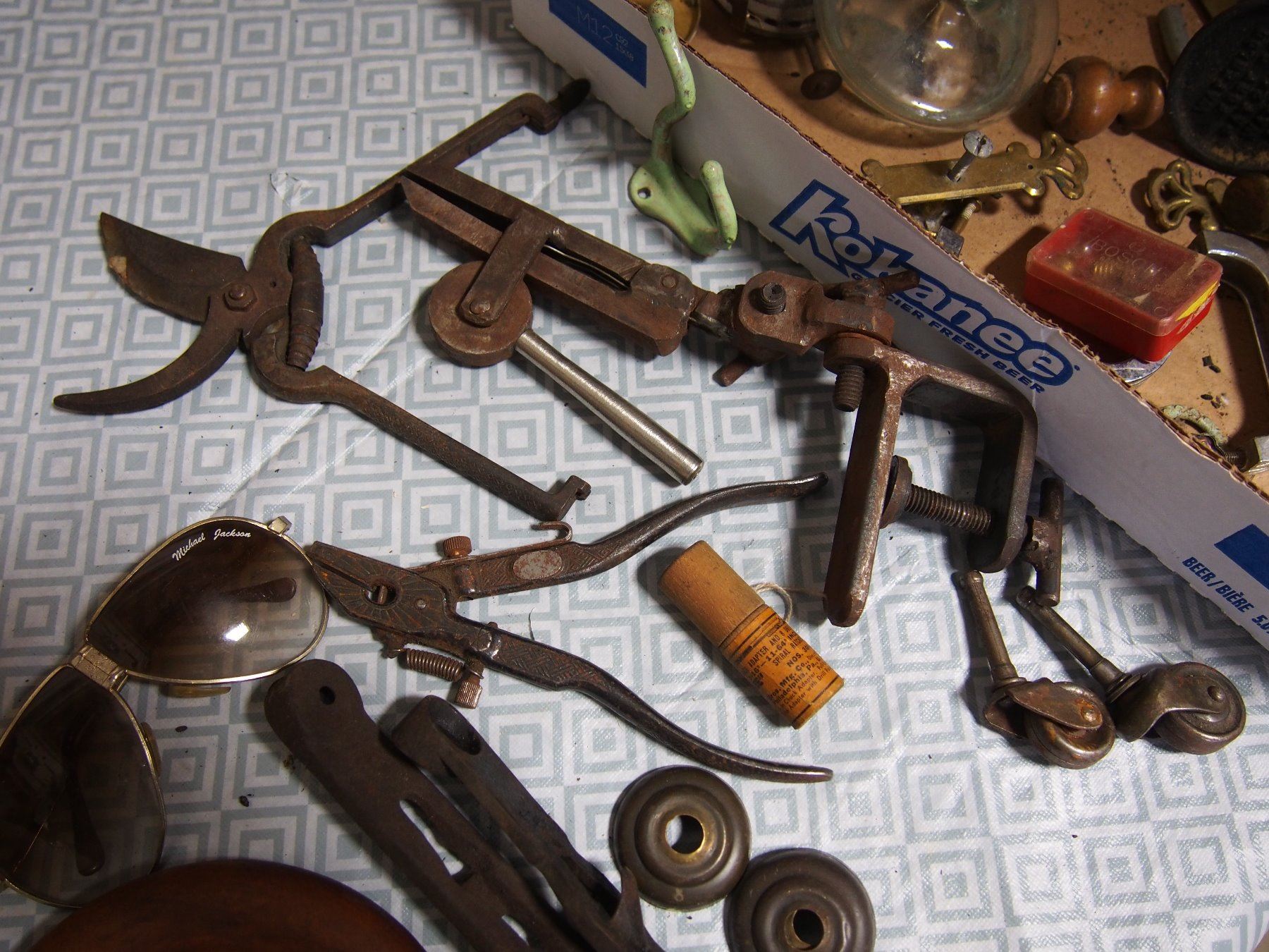Lot of Misc Items: handcuffs, lamp chimney, vintage tools, hardware