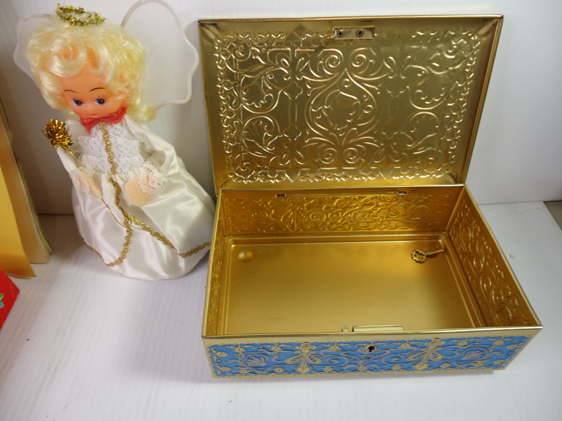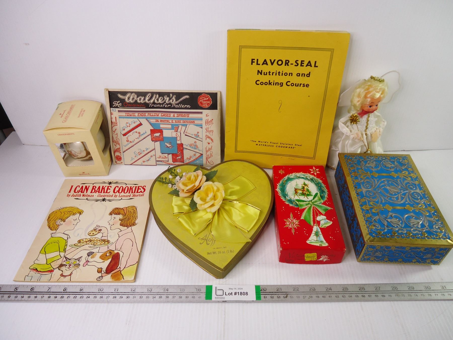 Lot of Misc.-Patterns, Christmas Ornament, Empty Tin, Box, Doll Books