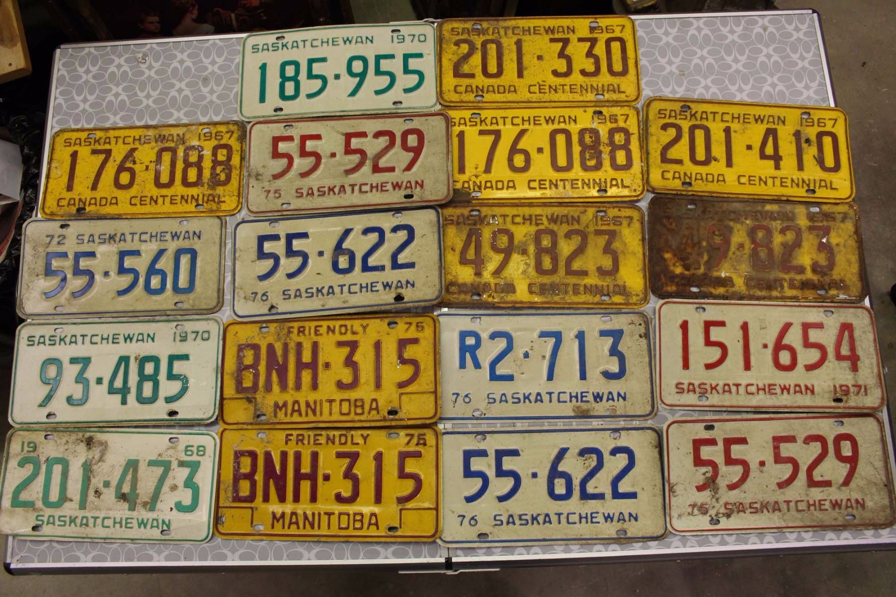 Lot of Saskatchewan License Plates (16)(Dated 1967,1968,1970,1971,1972, 1975,1976)& 1976 Manitoba Li