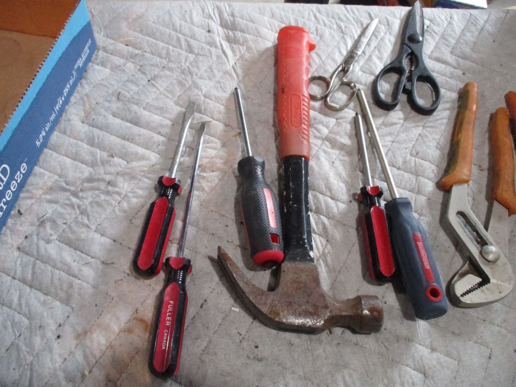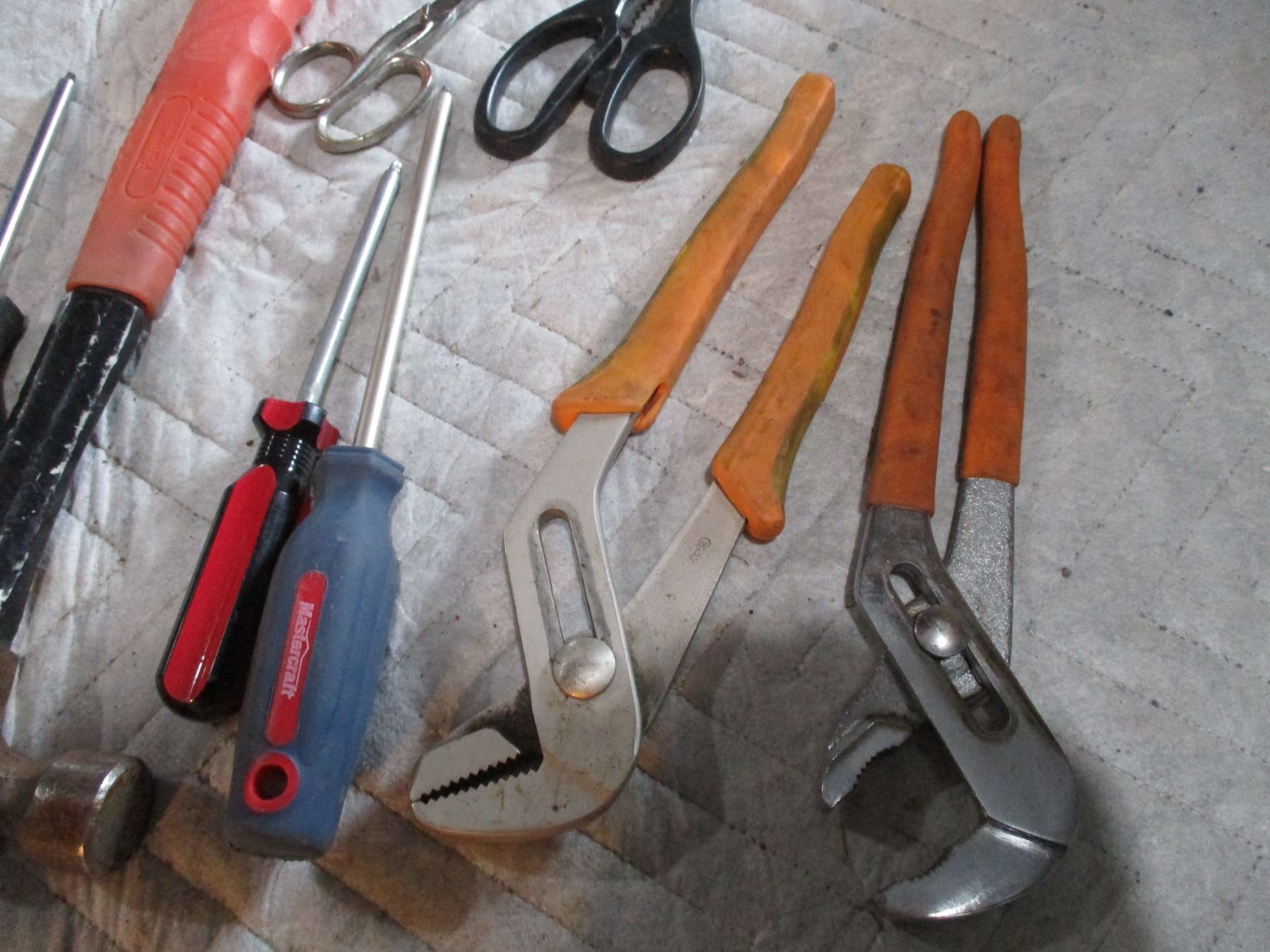 Lot of Screw Drivers, Hammer, Water Pump Pliers, Scissors