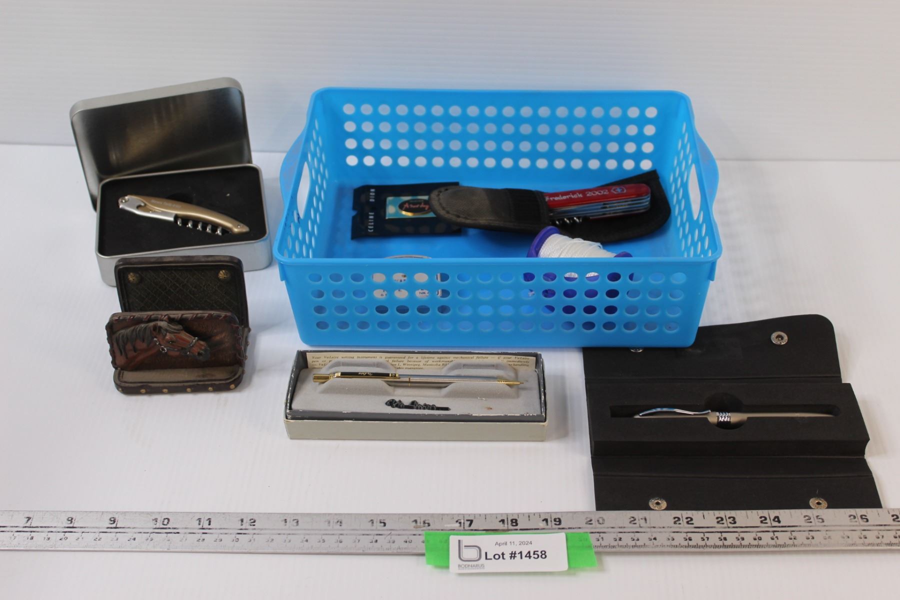 Lot of: Swiss Army Knife, (2) Collectors Pens, Money Clip, Horse Card Holder, Misc. in Blue Plastic Basket