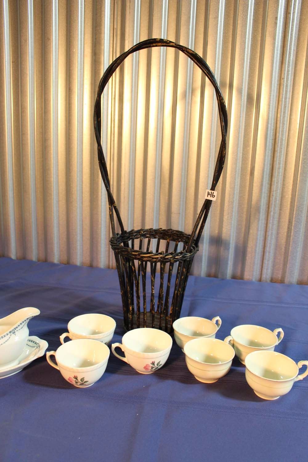 Lot of Tea Cups (2 Sets), Antique Losol Ware Gravy Boat & Wicker Basket