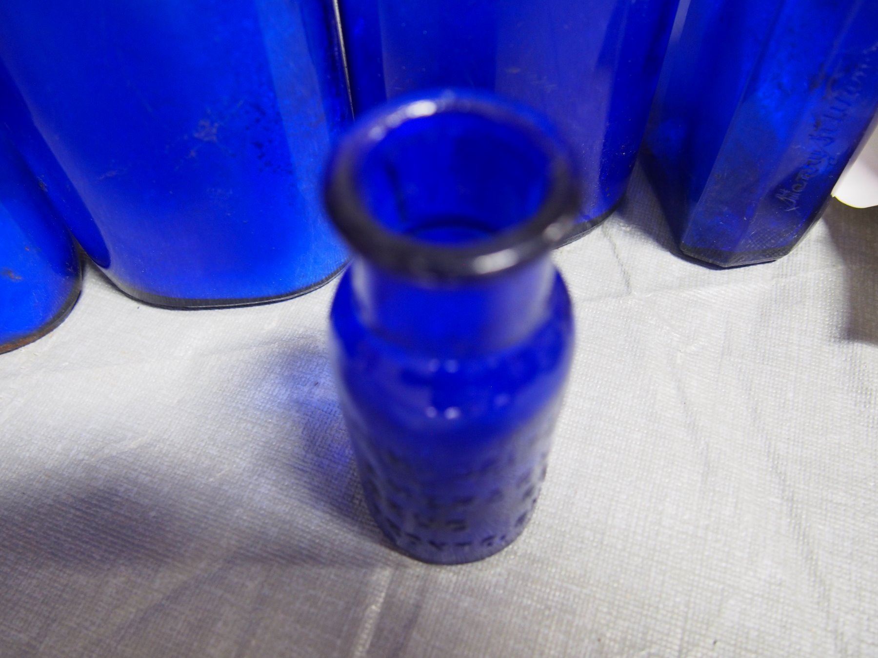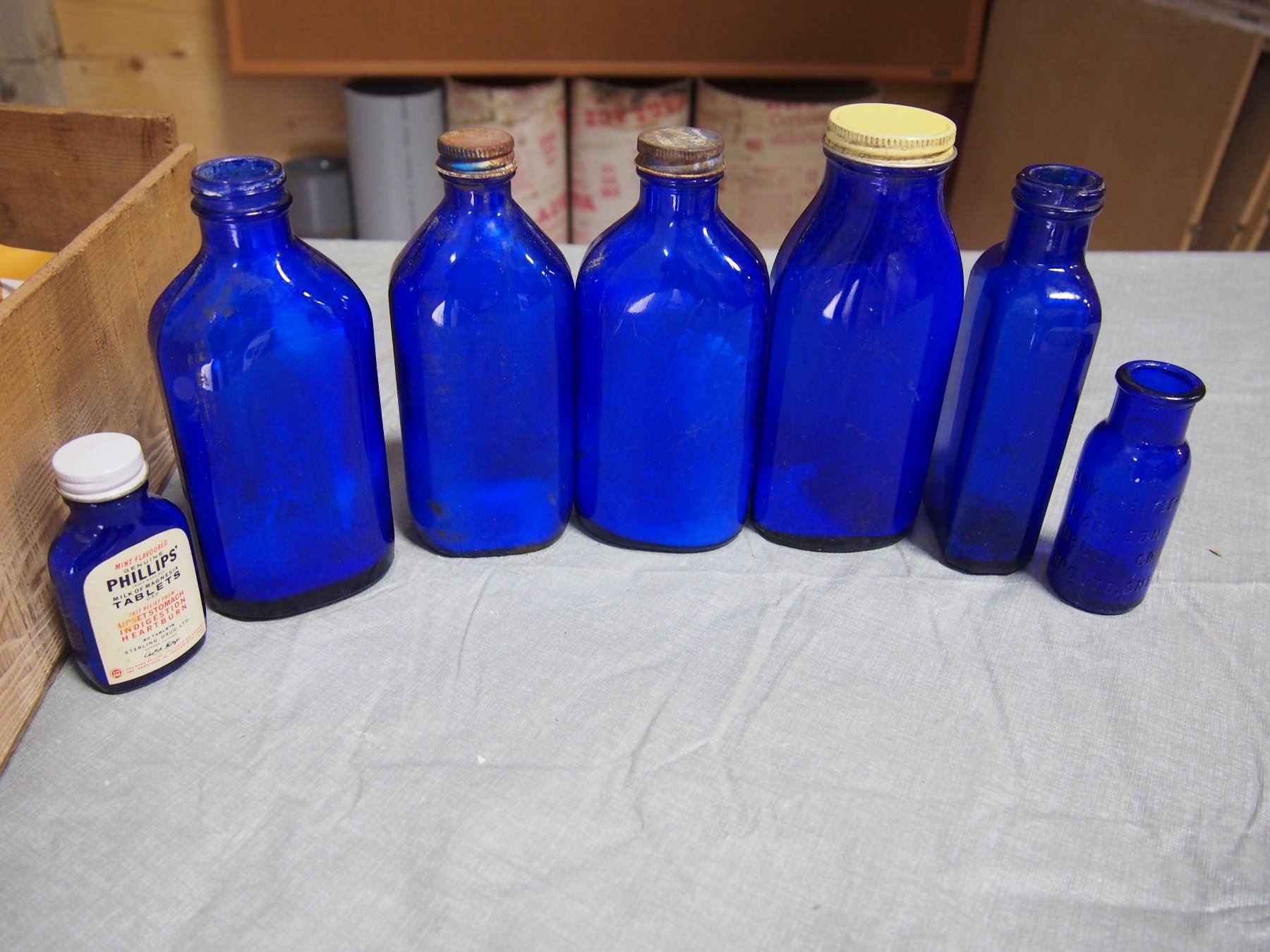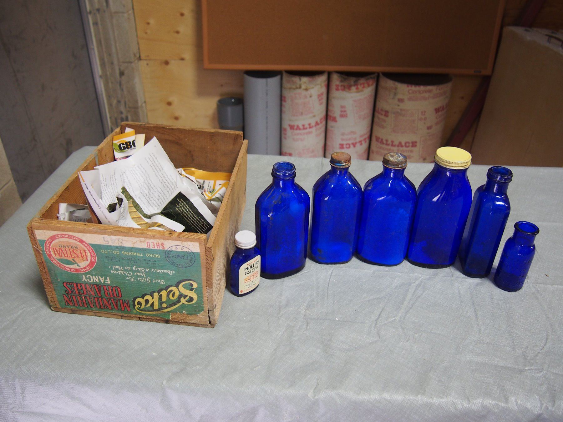 Lot of Vintage Cobalt Blue Bottles (1 embossed Bromo Seltzer Emerson Drug Co) plus wooden crate