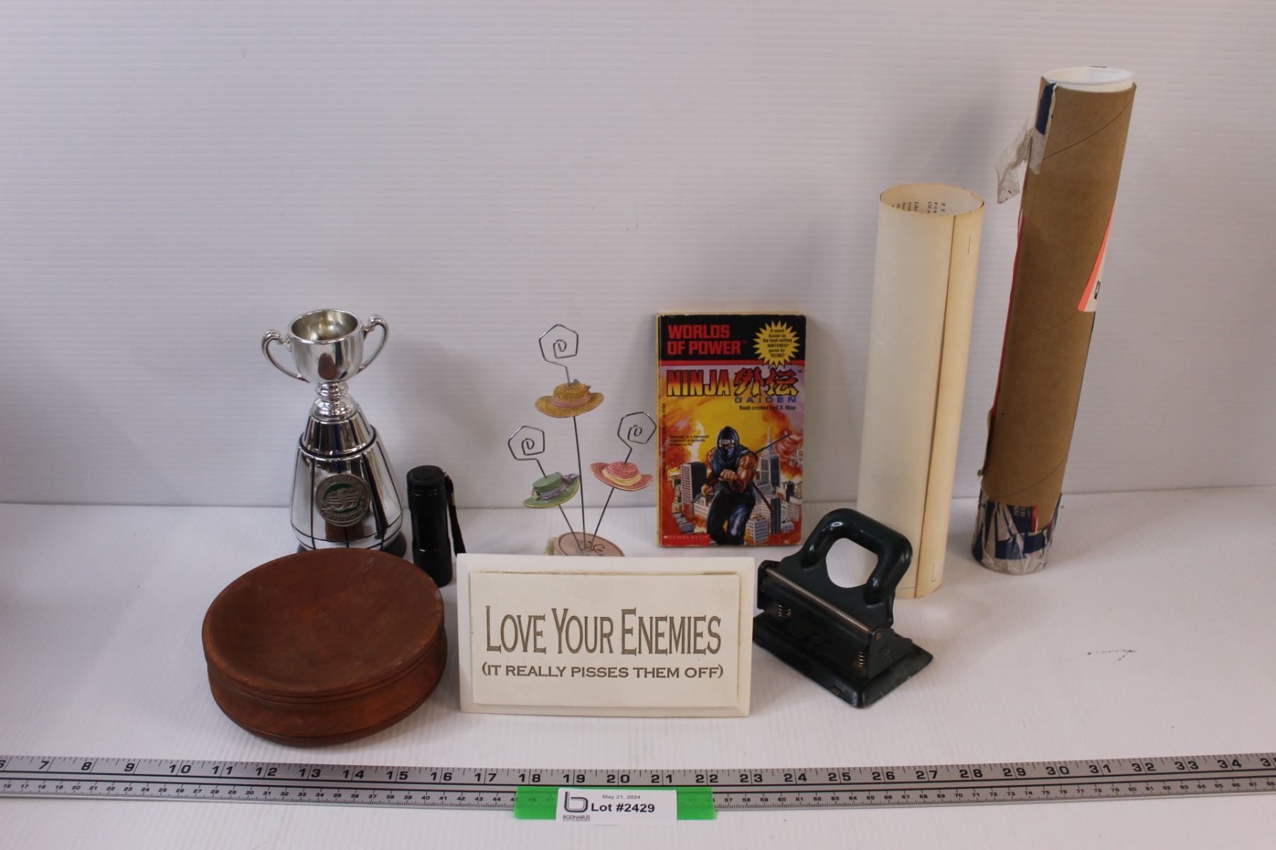 Lot of: Vintage Hole Punch, Love your enemies, French Painting Print in Roll, Misc.