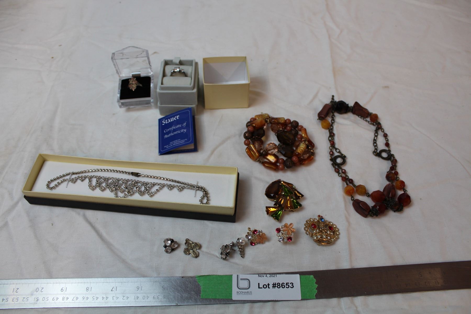 Lot of jewelry; Stauer Diamond aura ring, vintage necklaces, pins