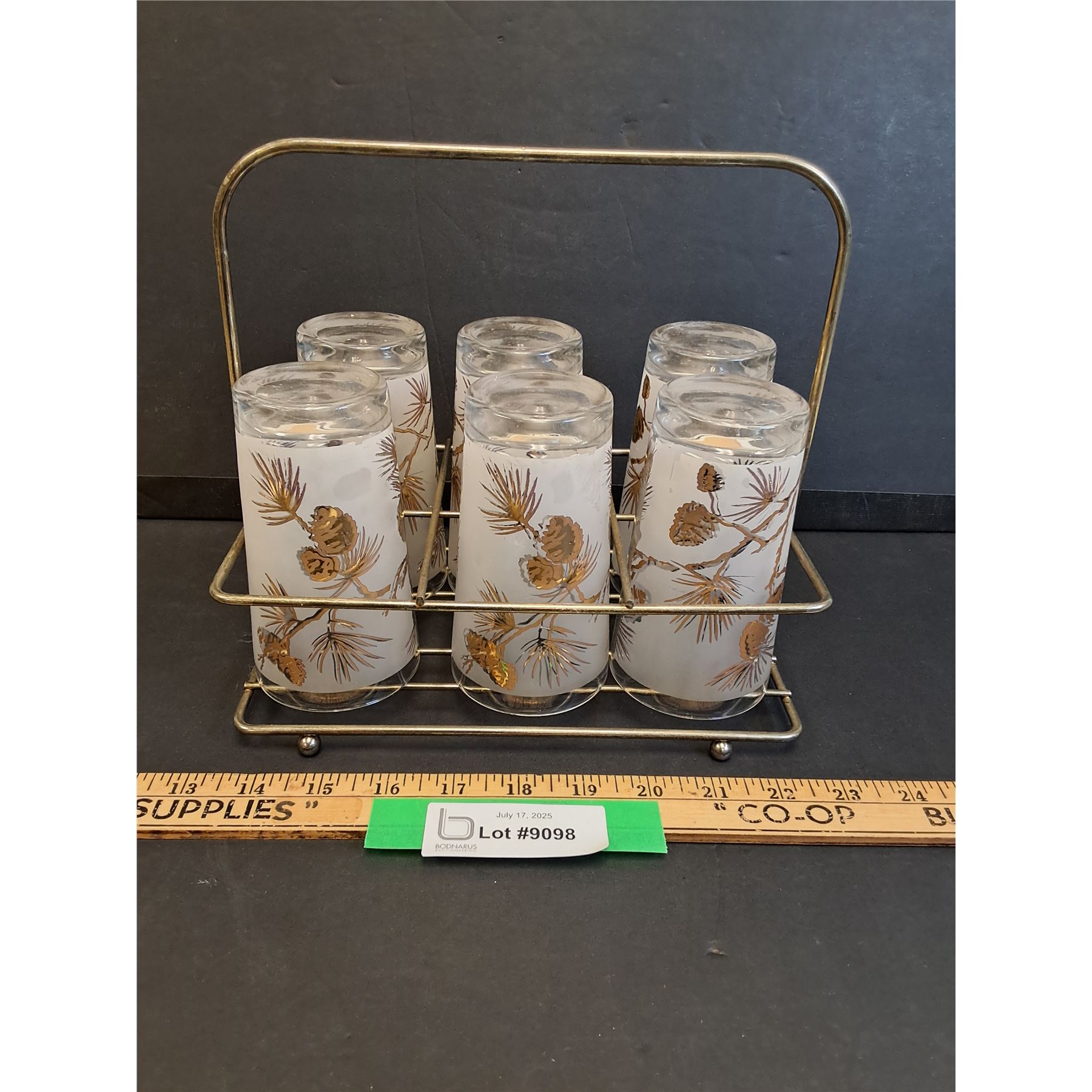 MCM Dominion Pine Cone Frosted Glasses Set w/ Metal Caddy