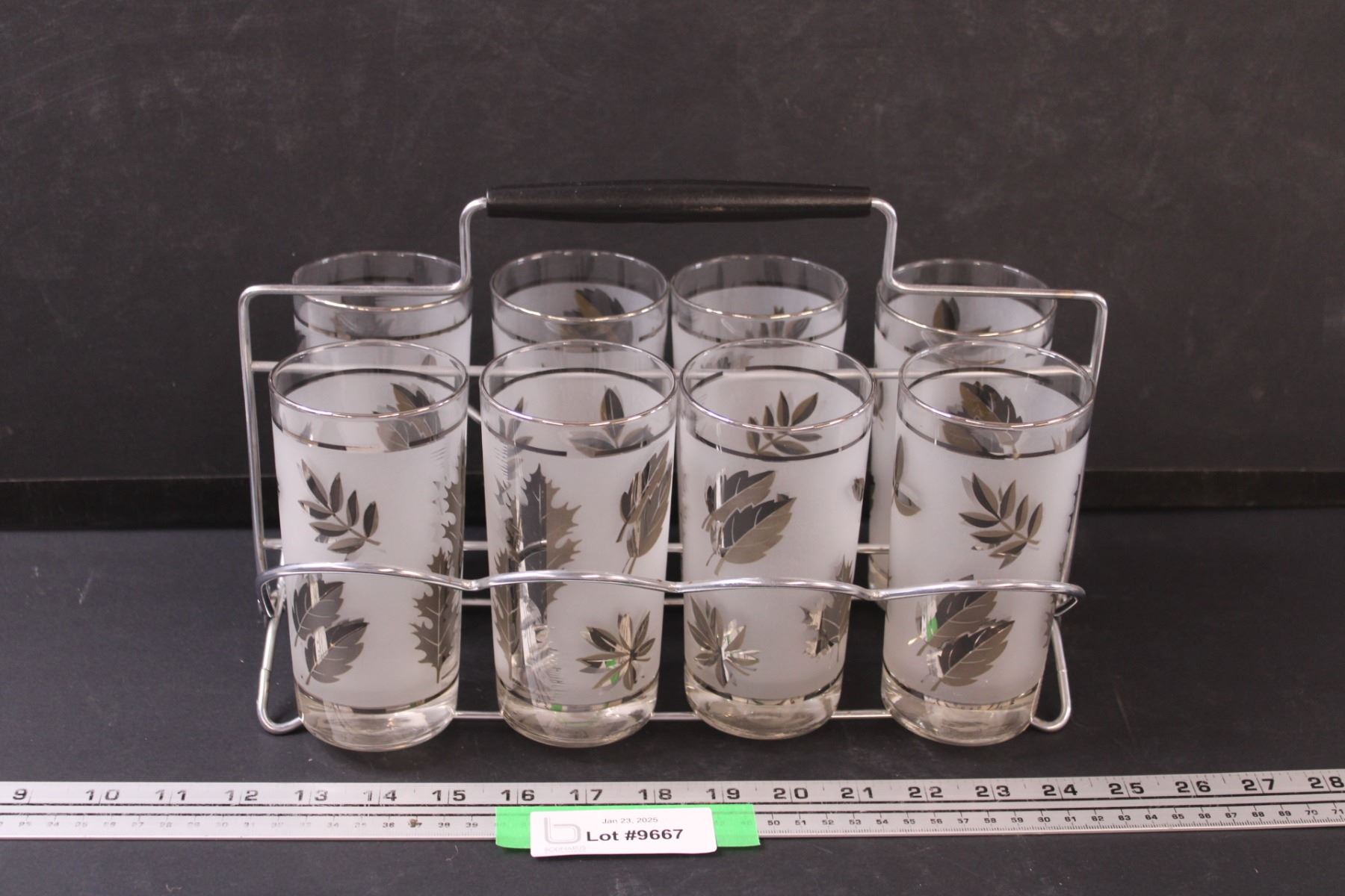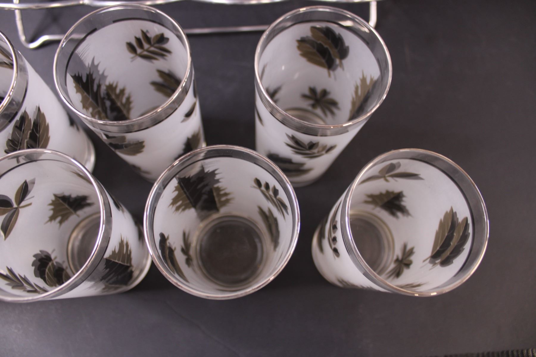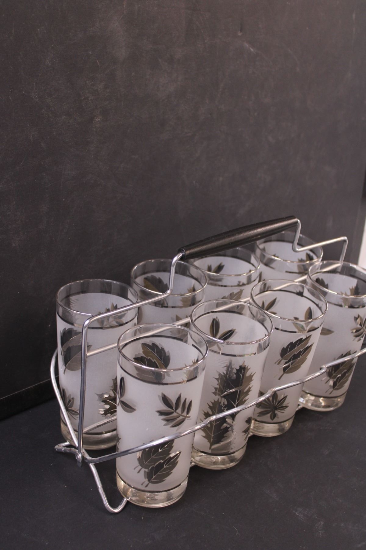 MCM Frosted Leaf Glass Set w/ Metal Caddy - Glasses (6" Tall) Holder (13" x 8" x 8")