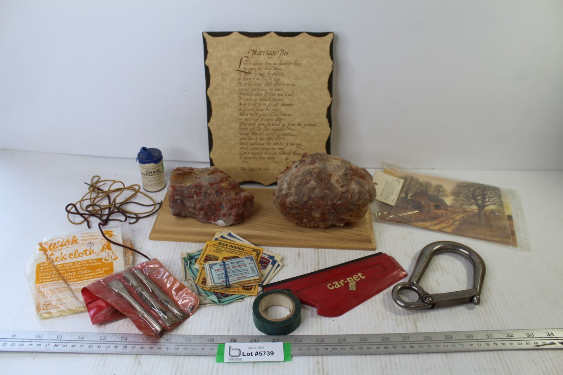 Marriage Ties Poem - (2) Potash Rocks - Large Metal Clip - Car-Pet Brush - Red Ribbon Coupons - Chisels - Misc. Items
