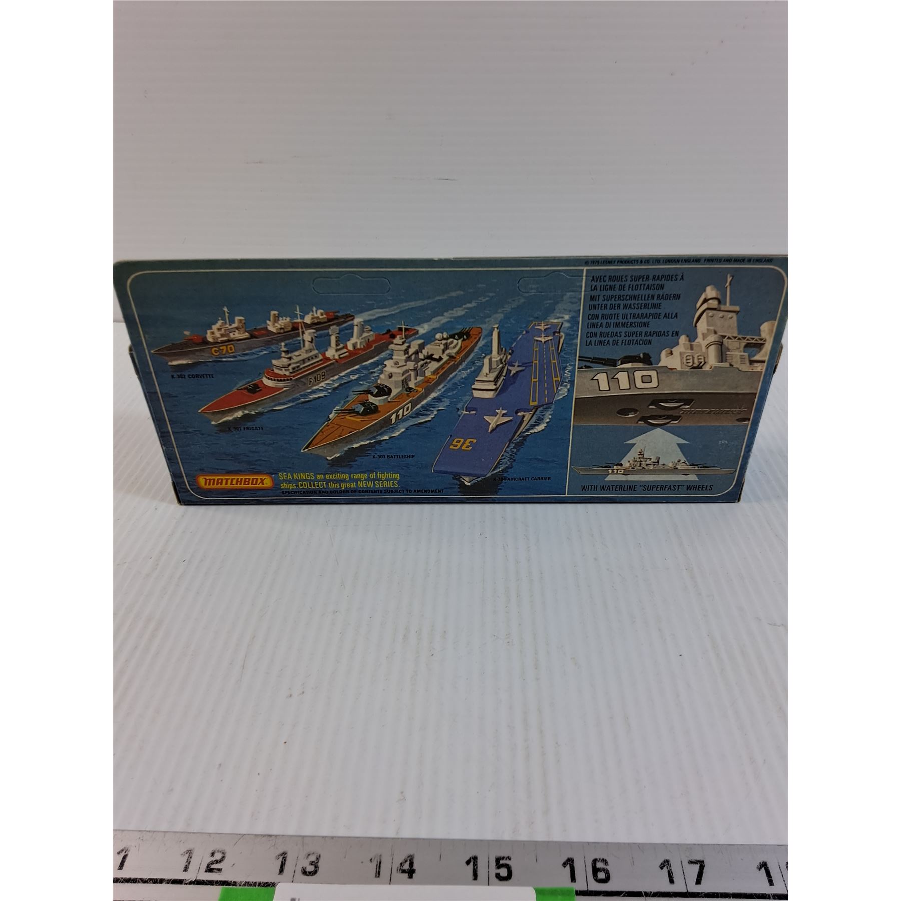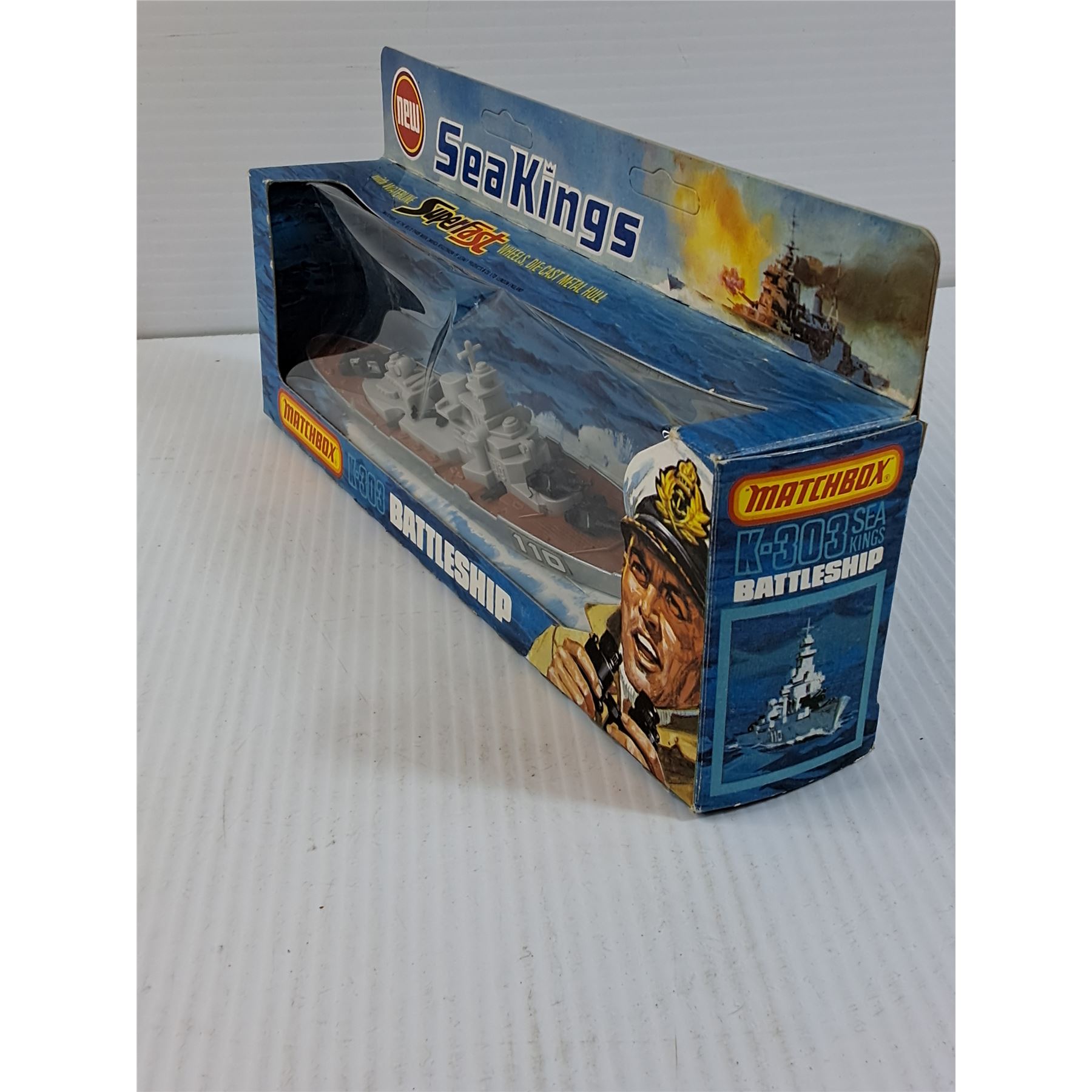 Matchbox K-303 Battleship (1975). Plastic on box is open on one side.