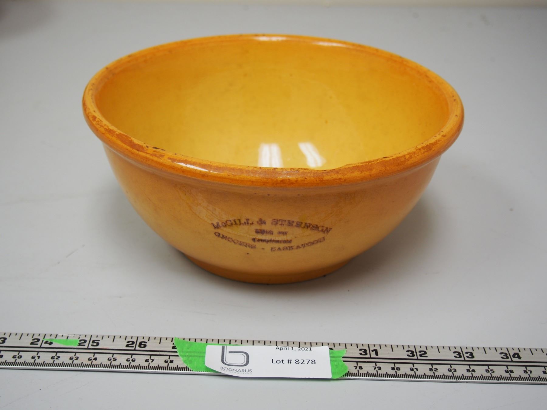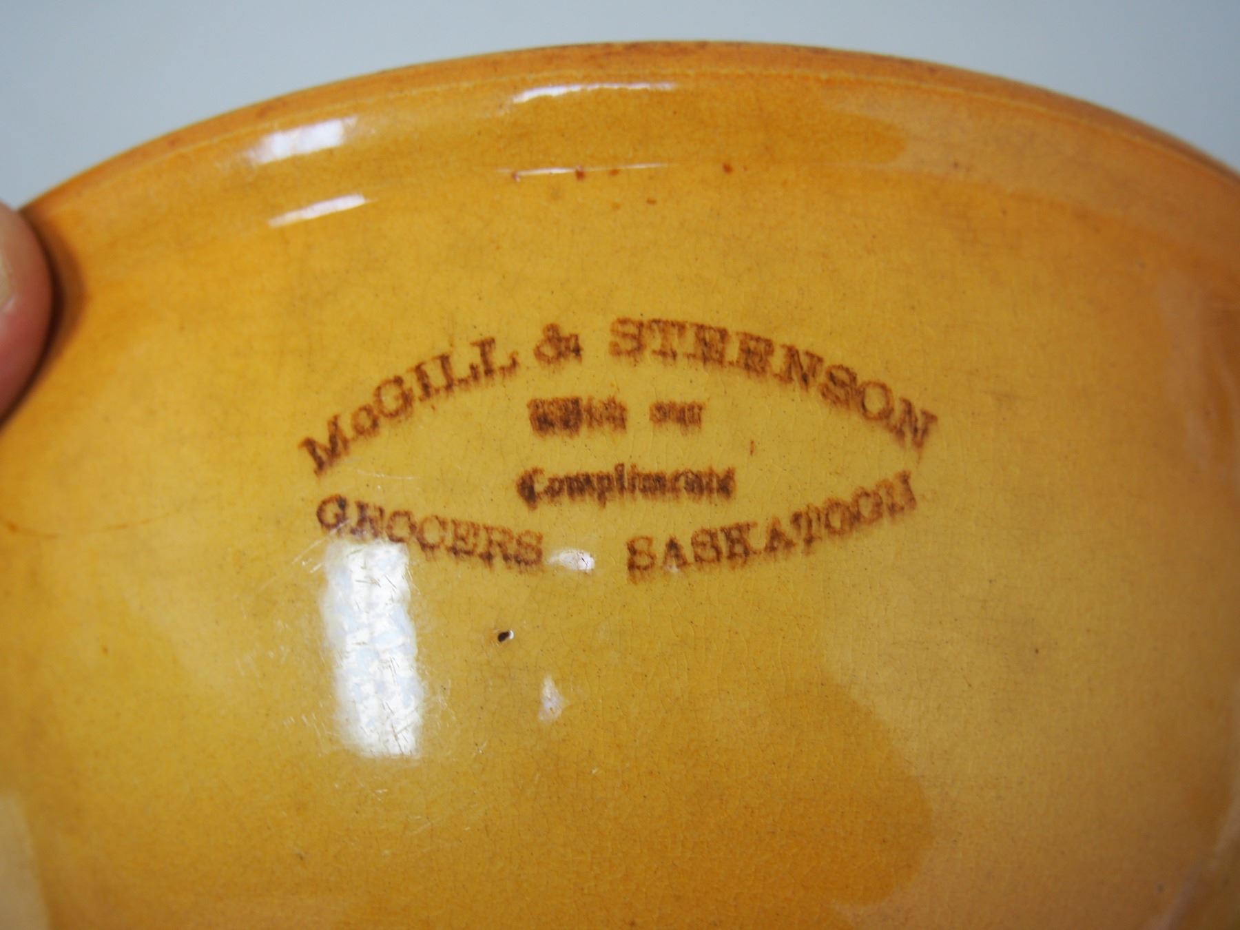 McGill and Steenson Grocers Saskatoon (Medalta Alberta) Stoneware Bowl 9in Diameter (chip on top) Advertising Bowl
