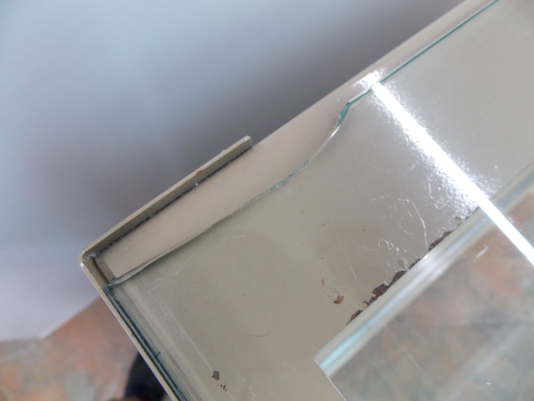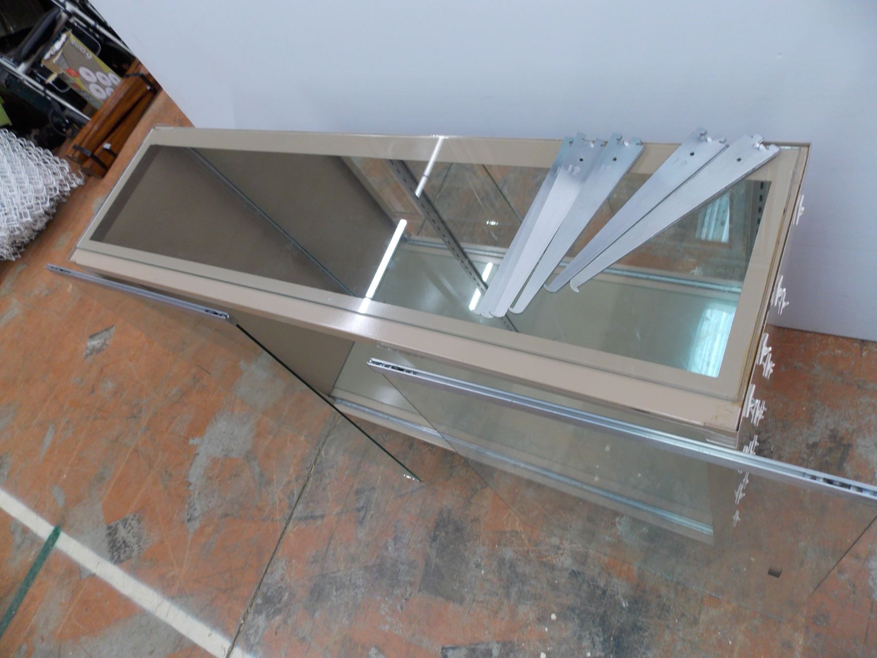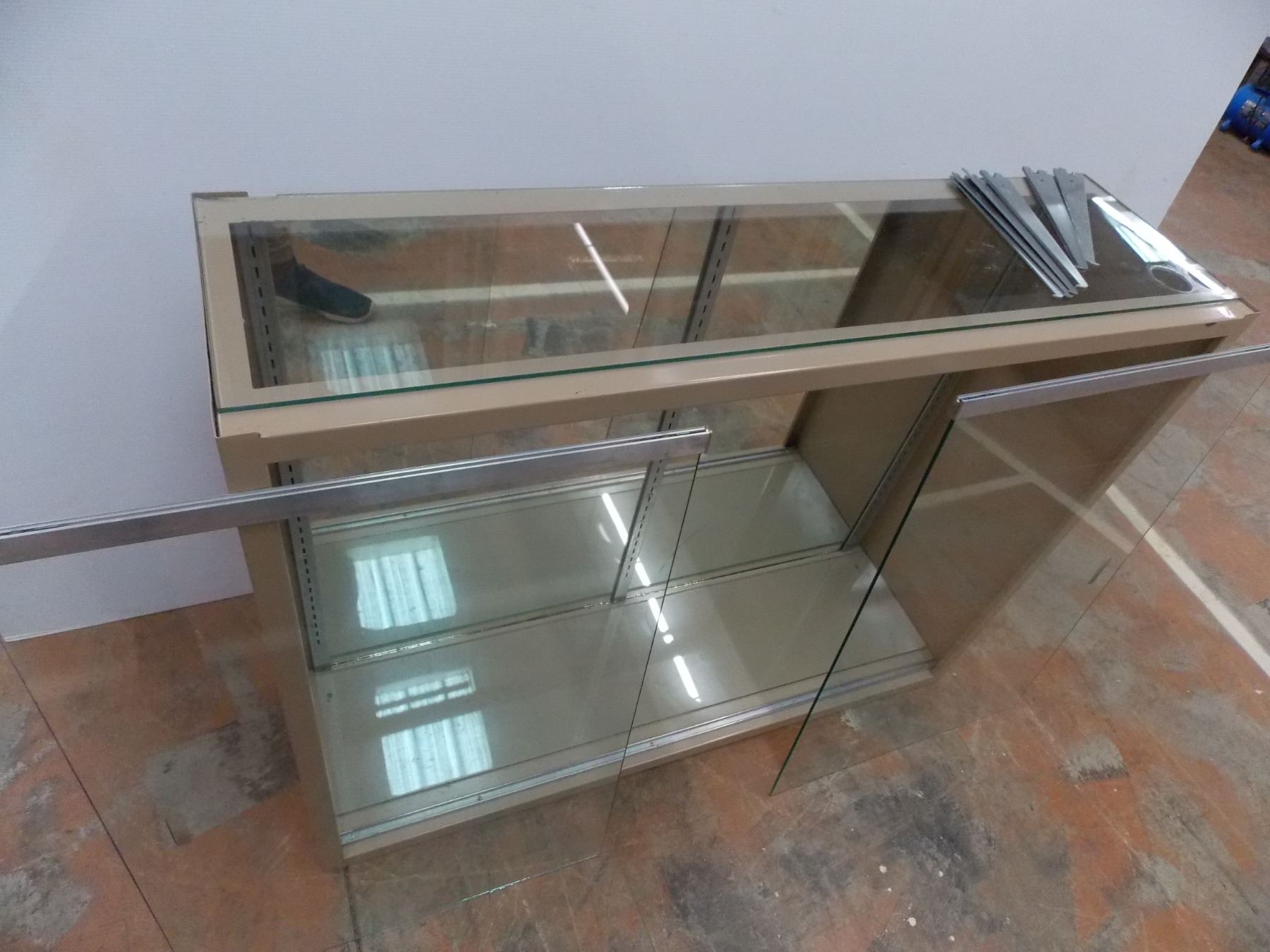 Metal Cabinet with 4 glass shelves and glass top + sliding glass doors - 4ft wide, 38" tall - 13" deep