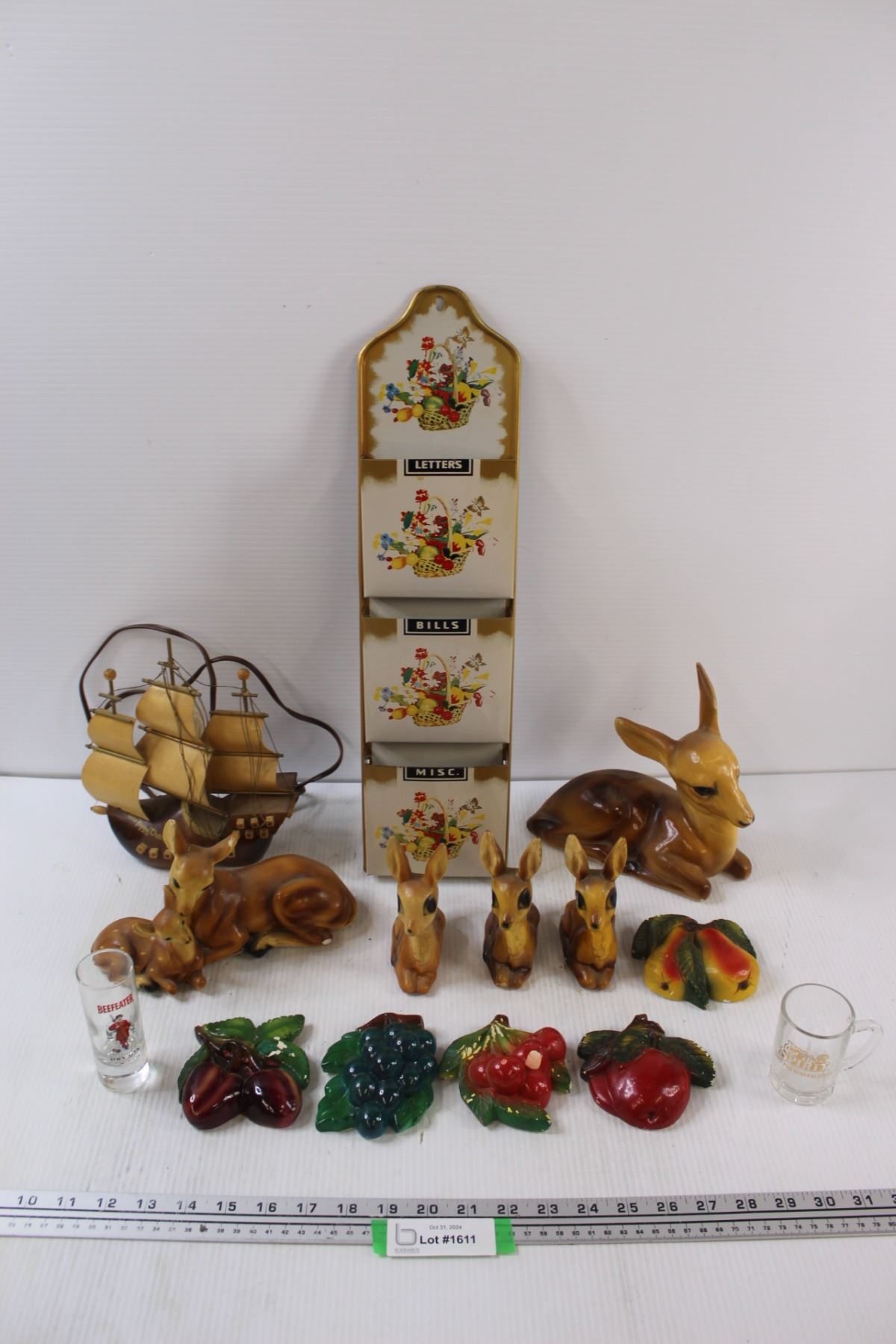 Metal Decorative Wall Mount Organizer, Wooden Shoe/Boat Lamp - Working, (6) Ceramic Deer Statuettes, (5) Enameled Fruit Wall Decorations, (2) Shot Glasses