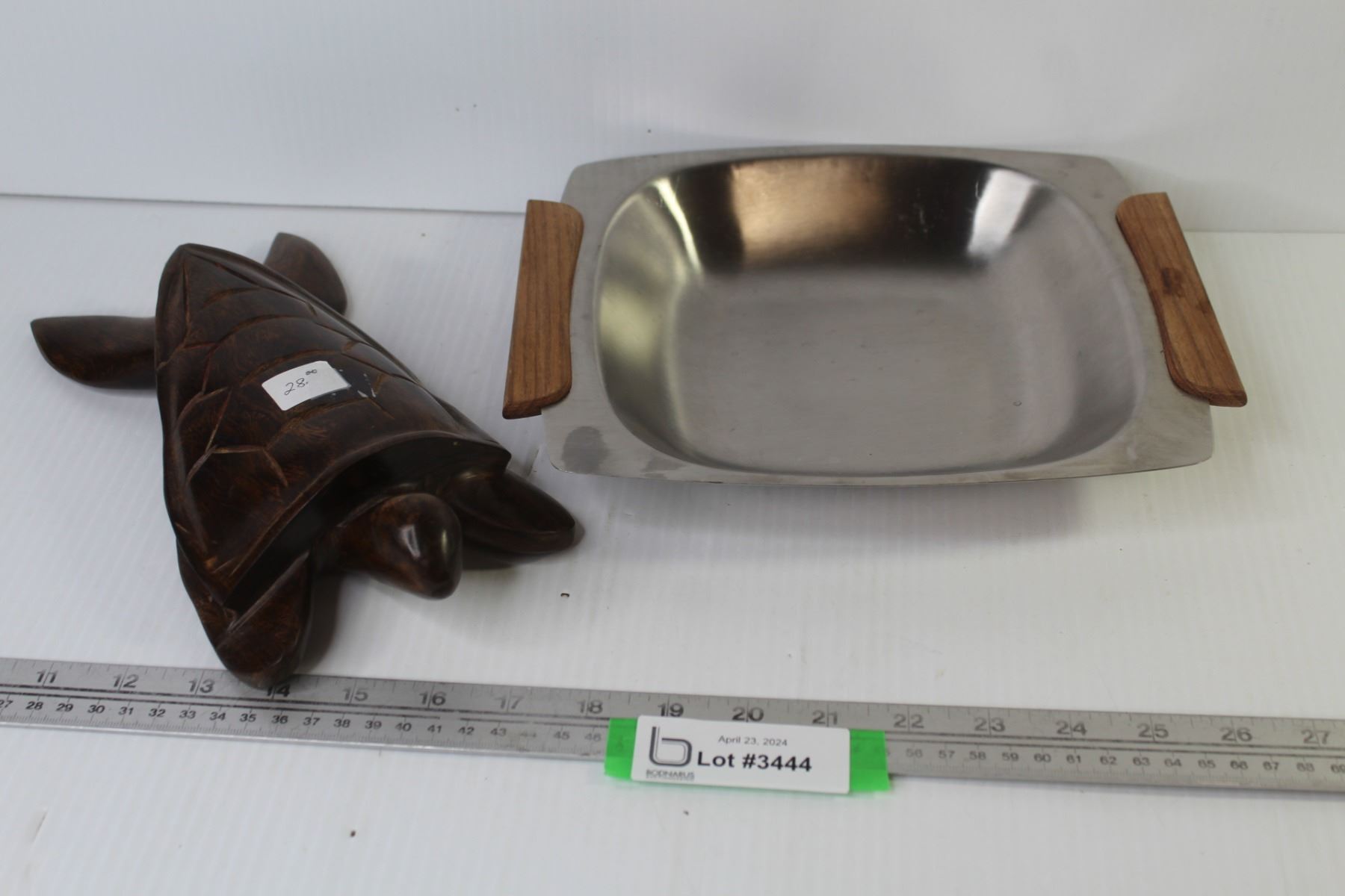 Metal Dish w/Wooden Handles - Carved Iron Wood Turtle
