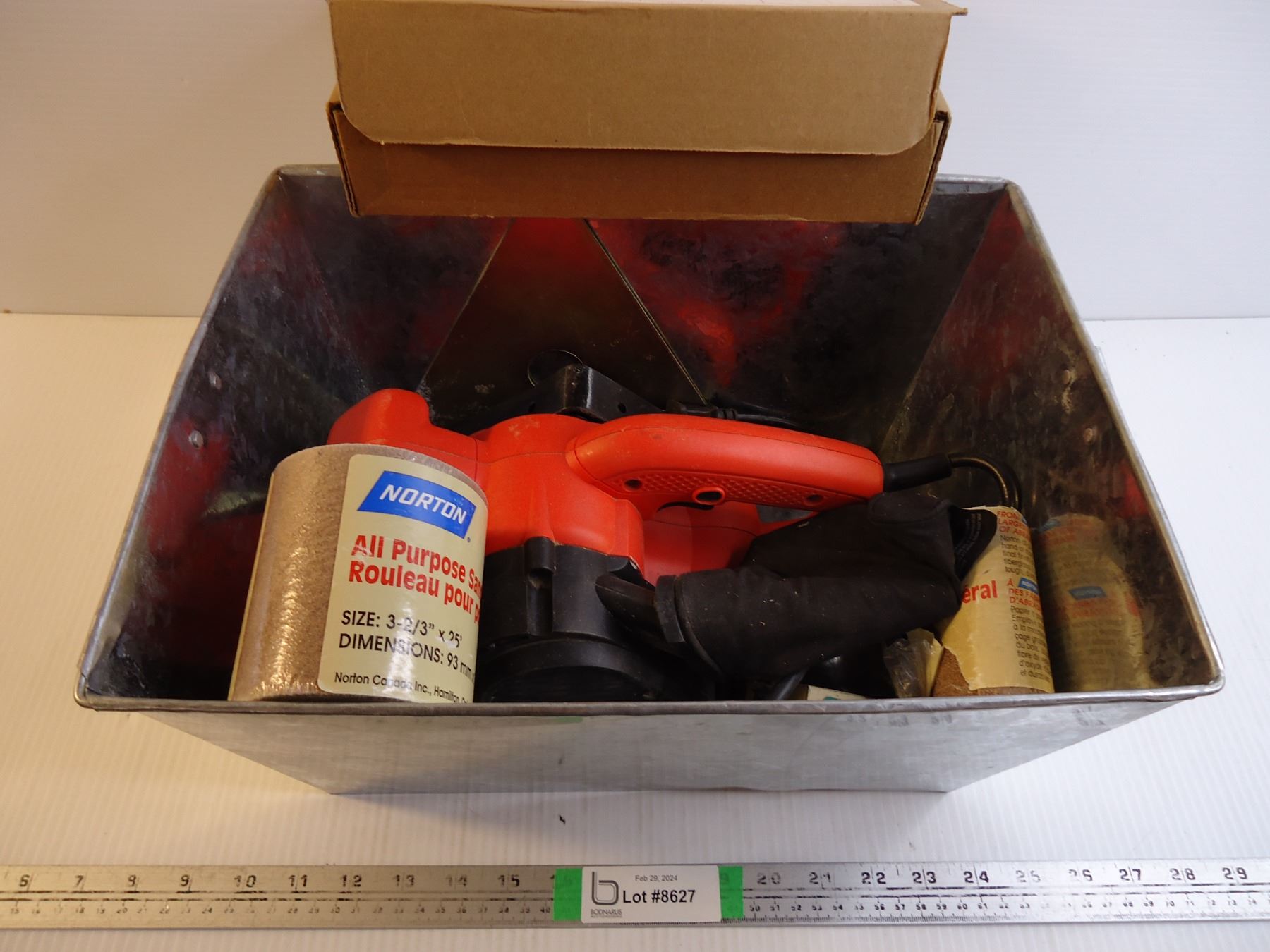 Metal Tote Containing Black and Decker Electric Sander (working) and lot of sanding supplies