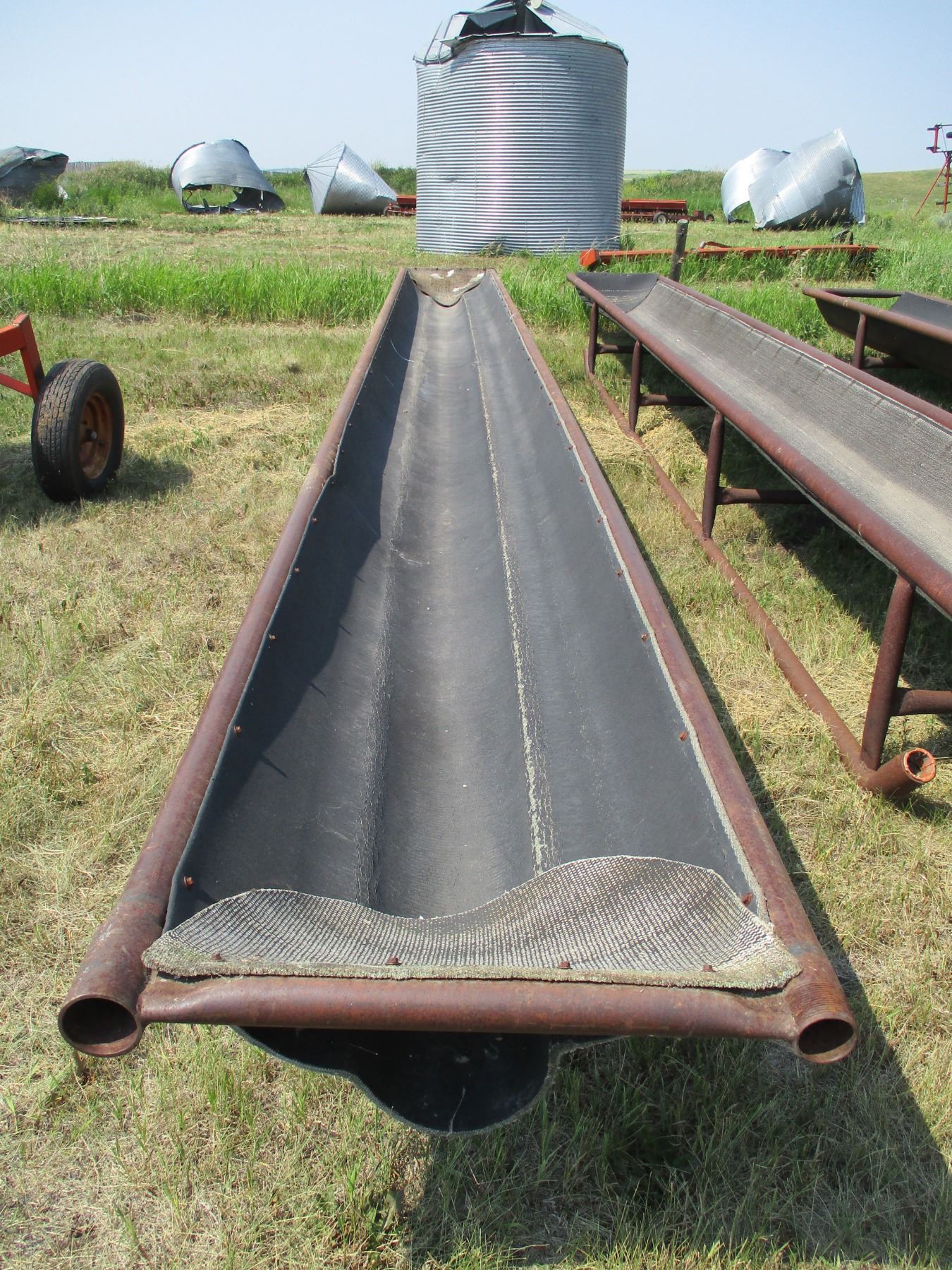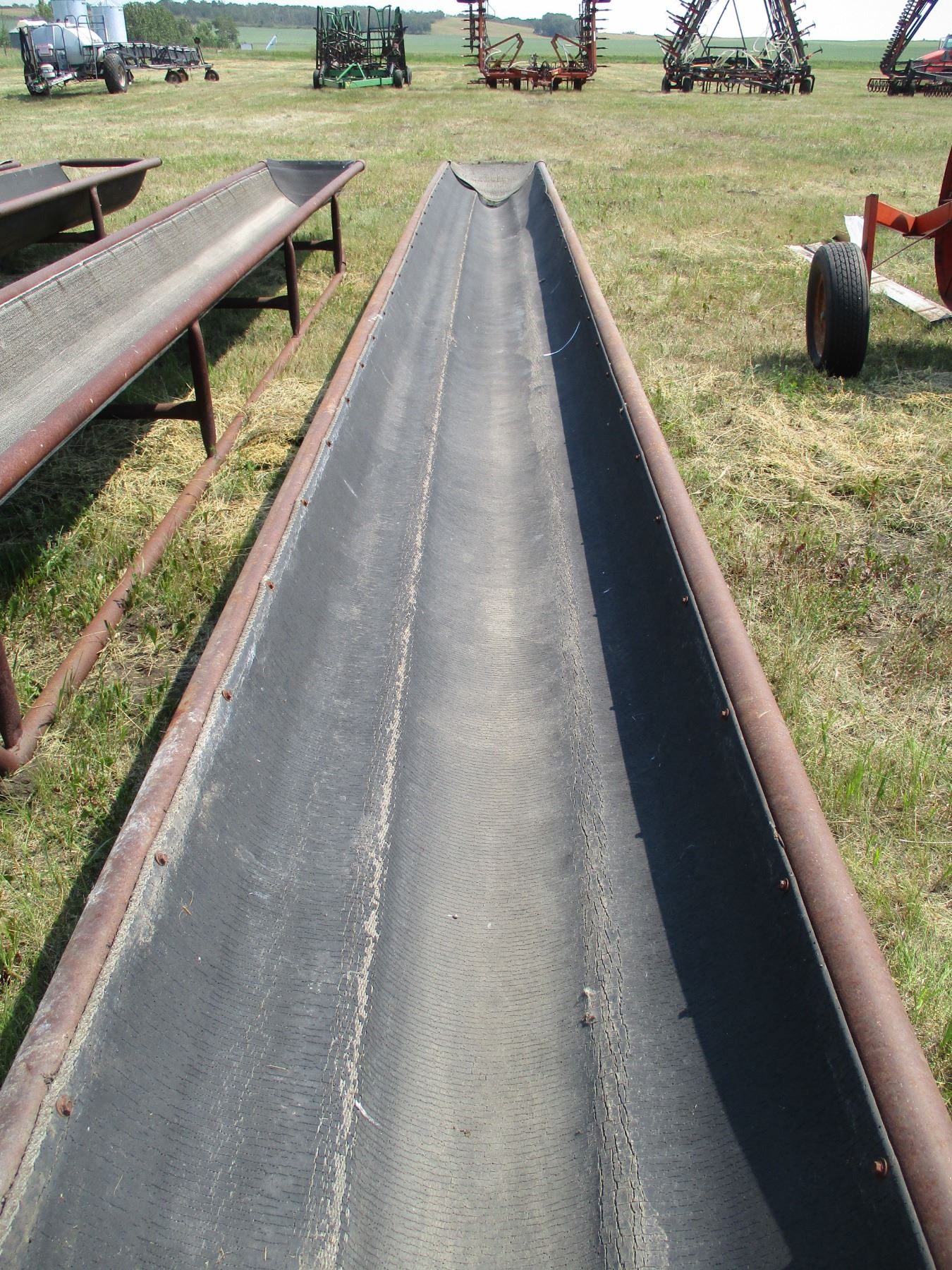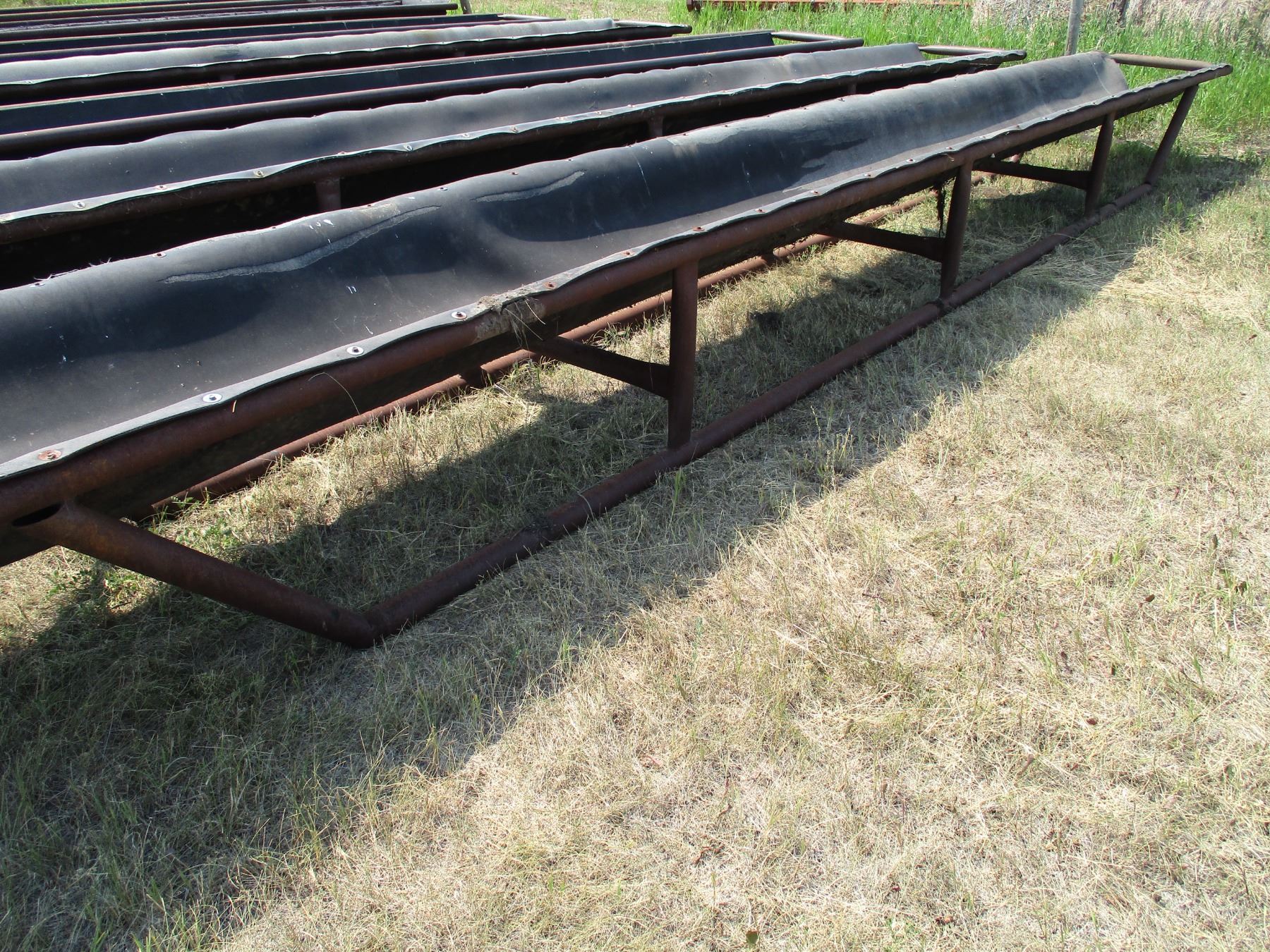 Metal livestock feeder with belted bottom 30' long