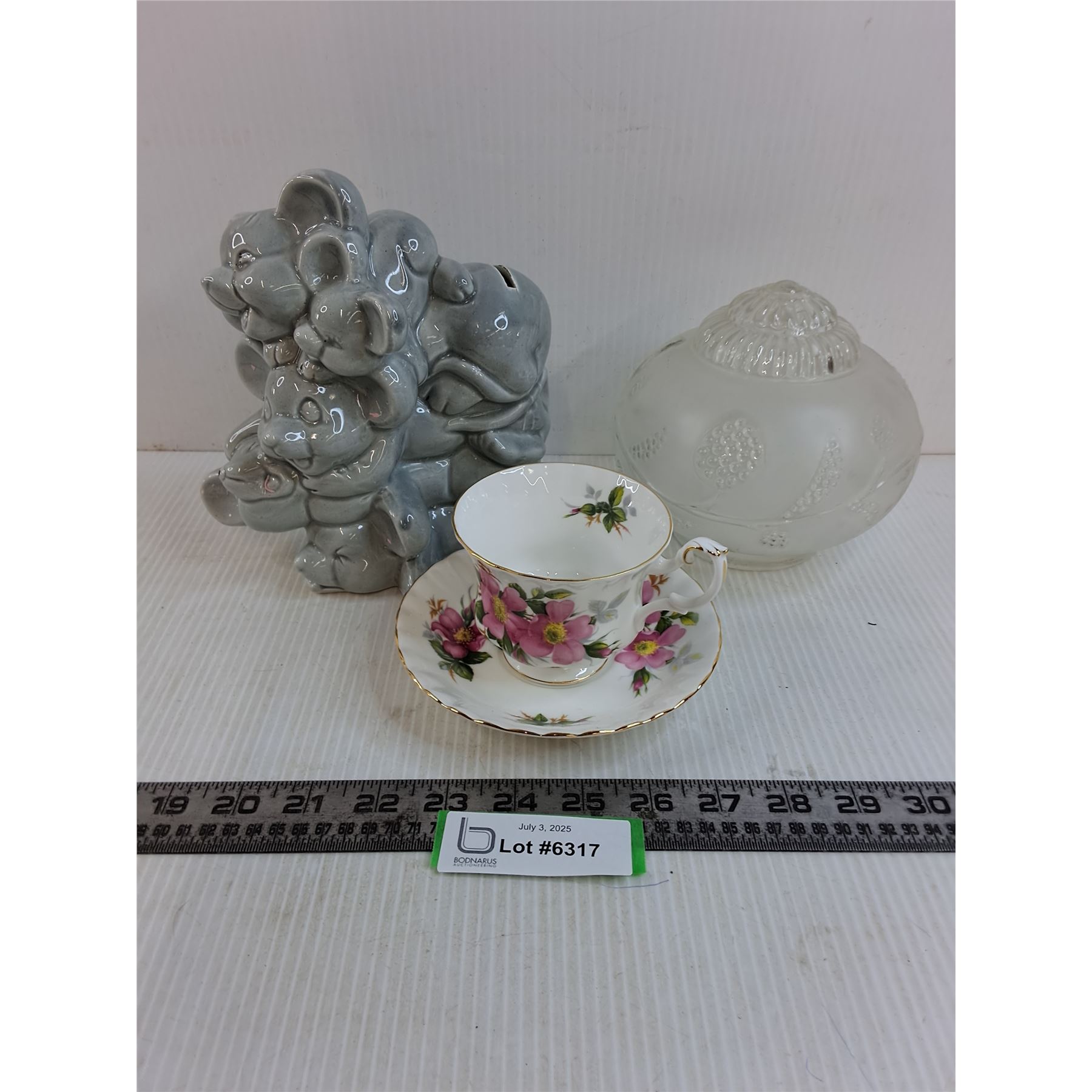 Mice Coin Bank, Glass Light Fixture, Royal Albert Fine China Teacup & Saucer