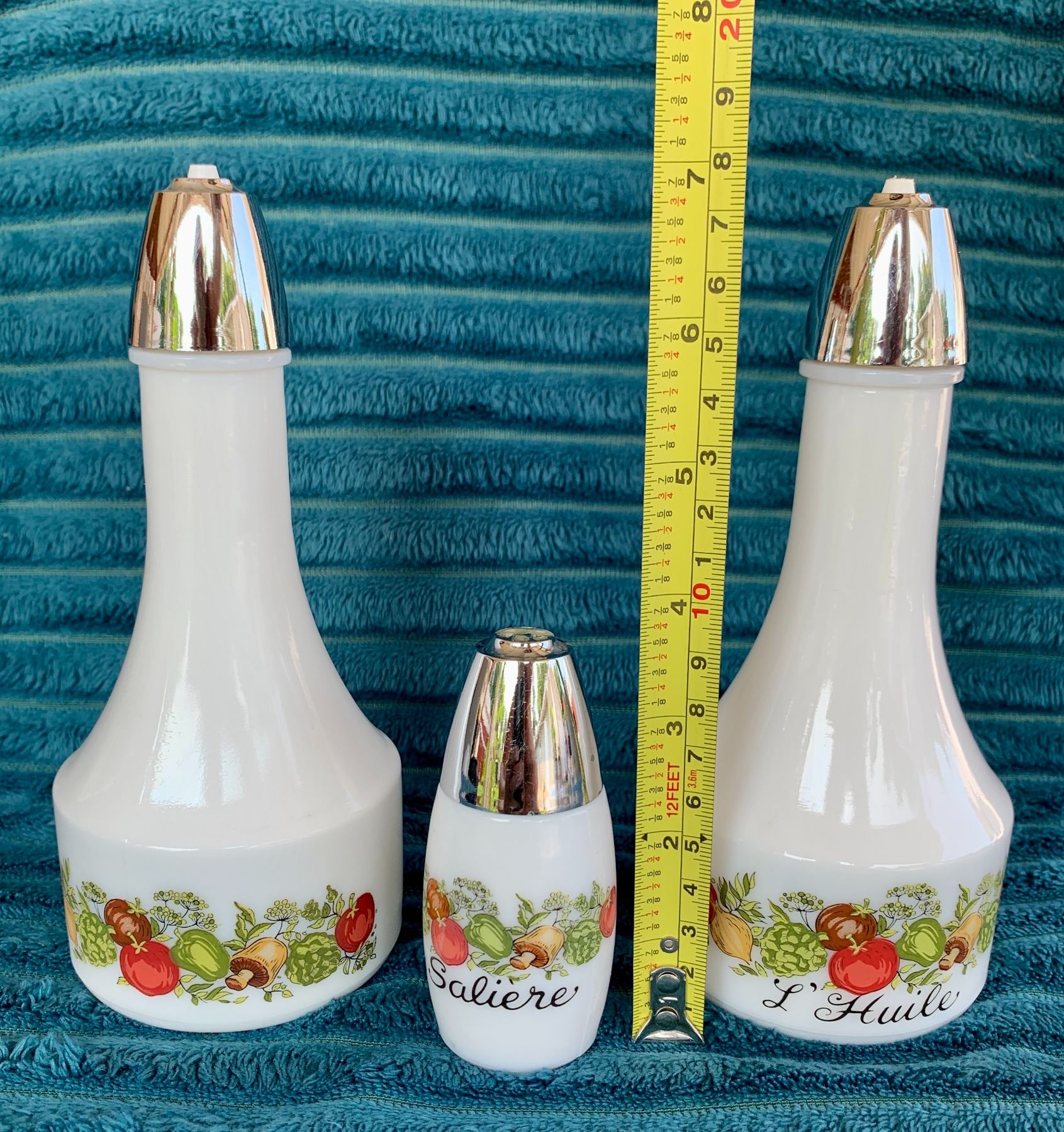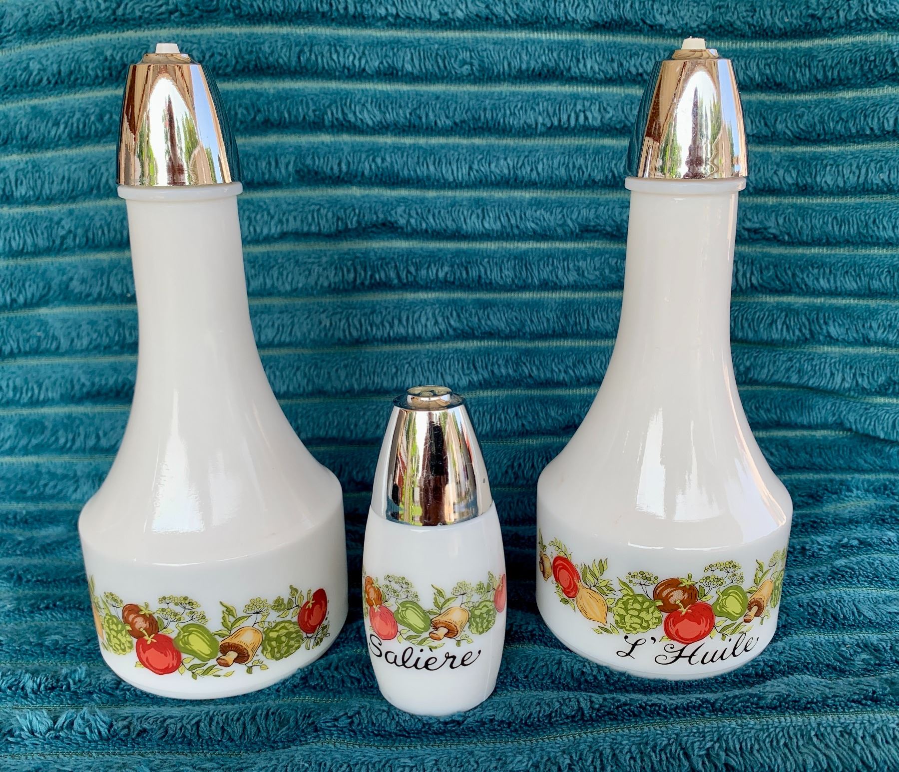 Mid Century Modern GEMCO USA "Spice of Life" Milk Glass Enamelled Oil/Vinegar/Salt Shaker Set - Rare