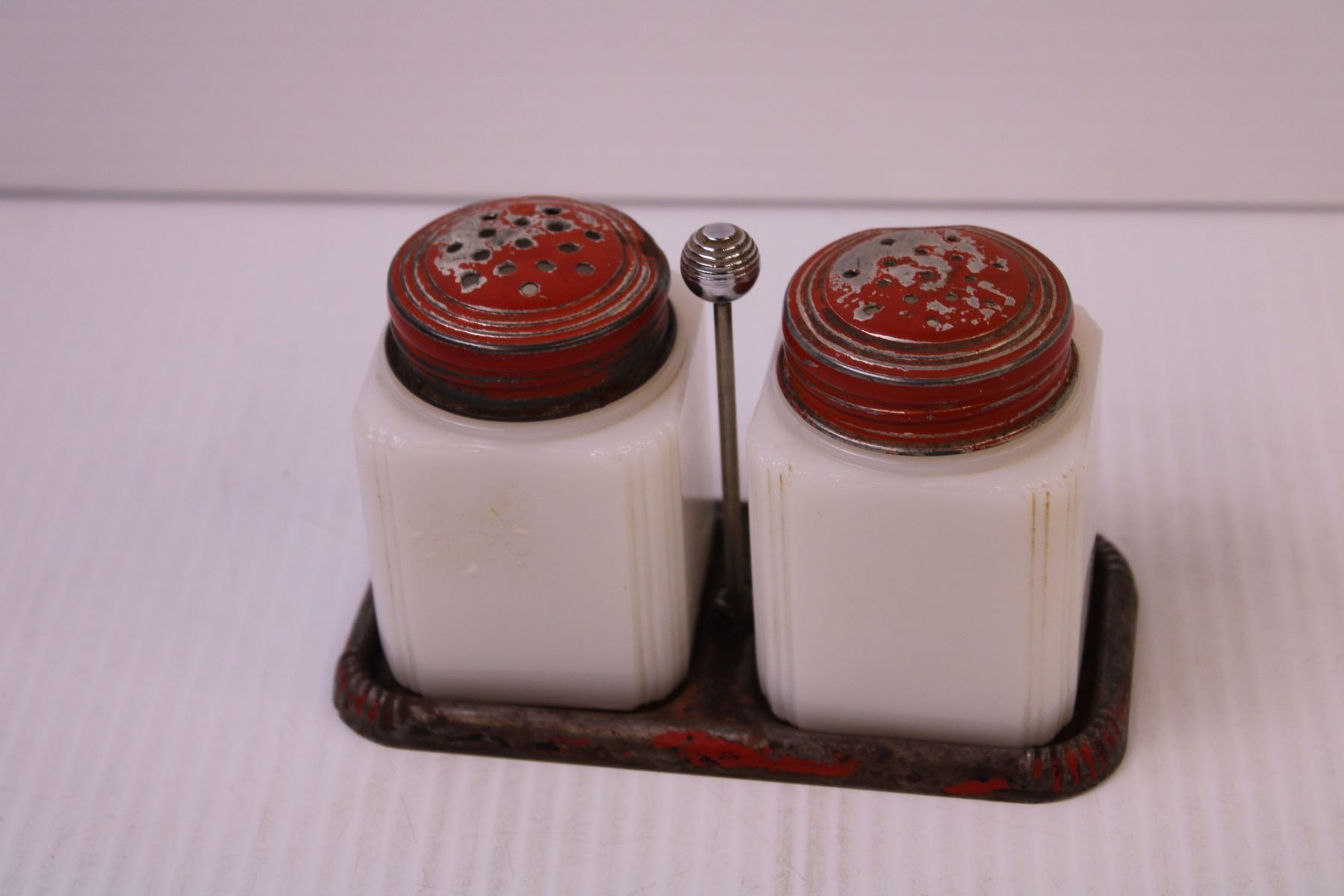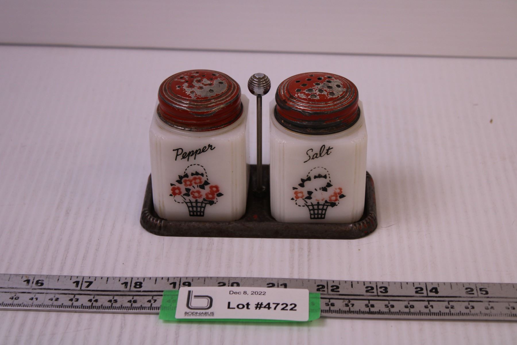 Milk Glass Salt & Pepper Shakers w/ Holder