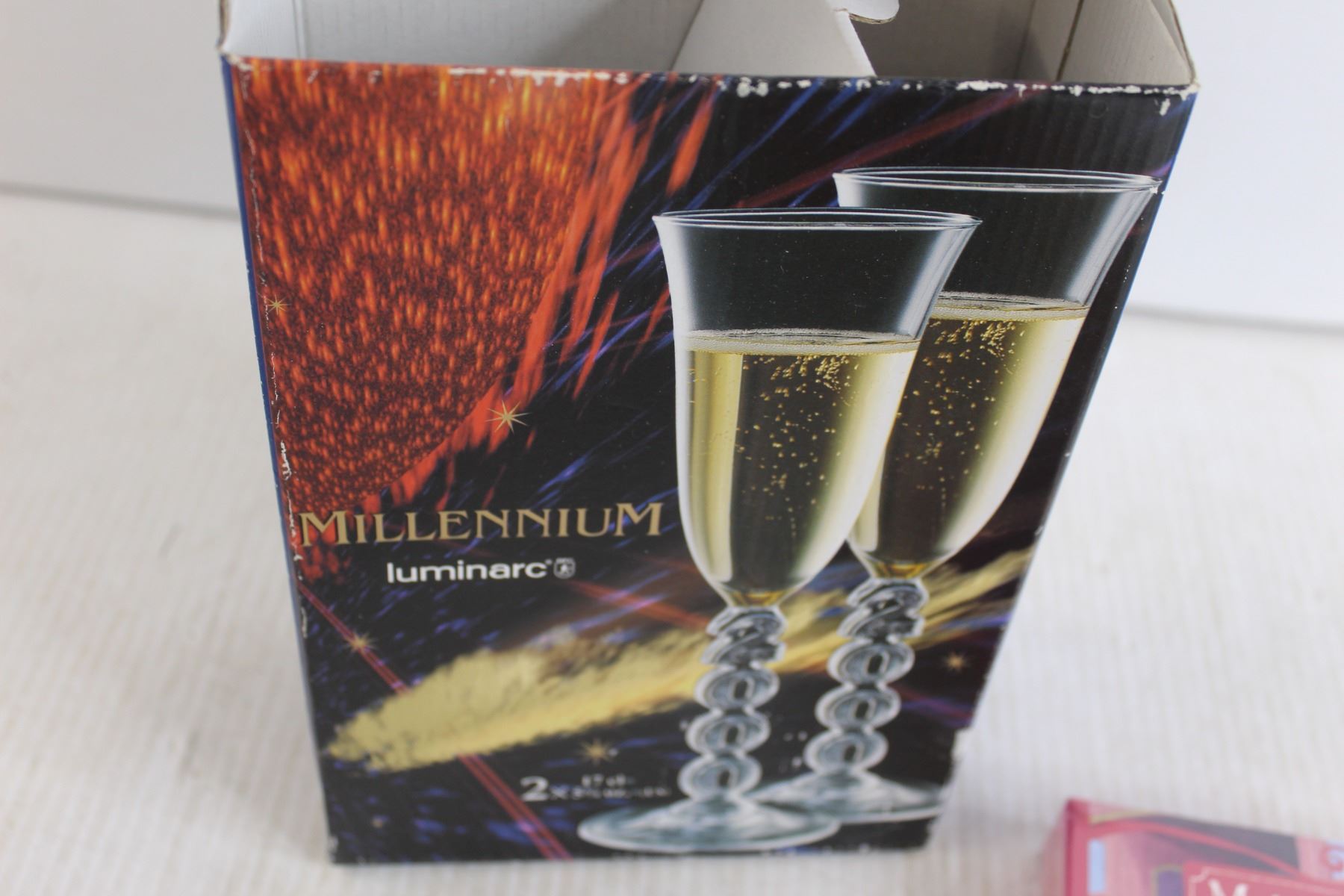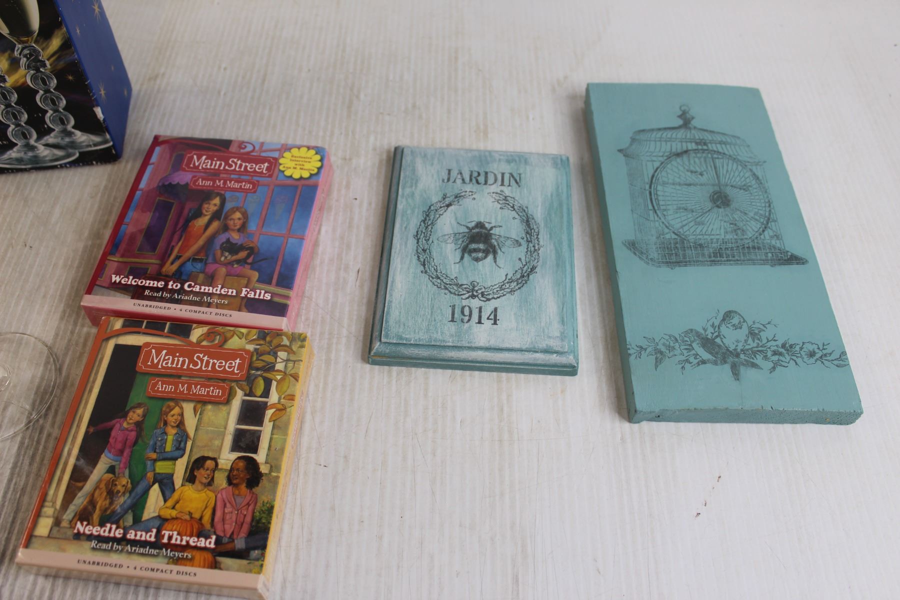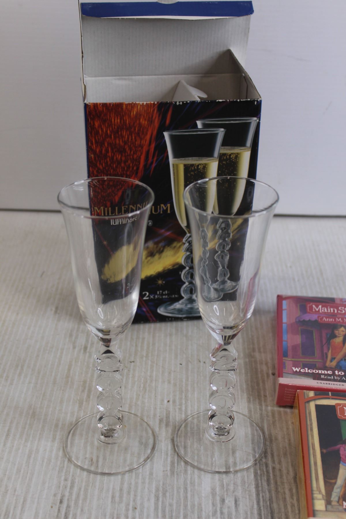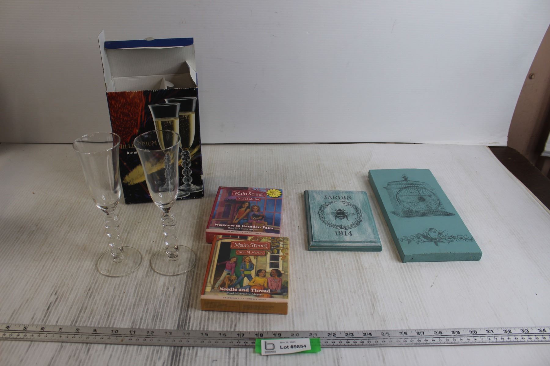 Millenium Luminarc Champagne Flutes, (2) Pieces Wooden Wall Art, (2) Main Street Books - Sealed