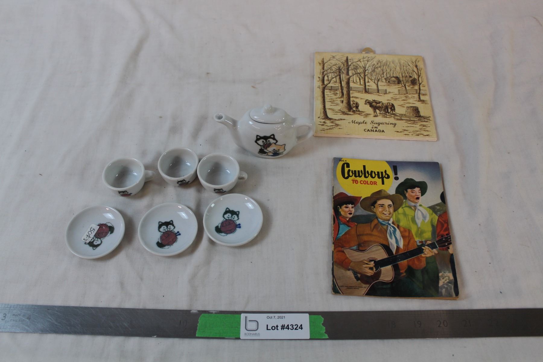 Mini tea set, used cowboy colouring book, and ceramic pot holder