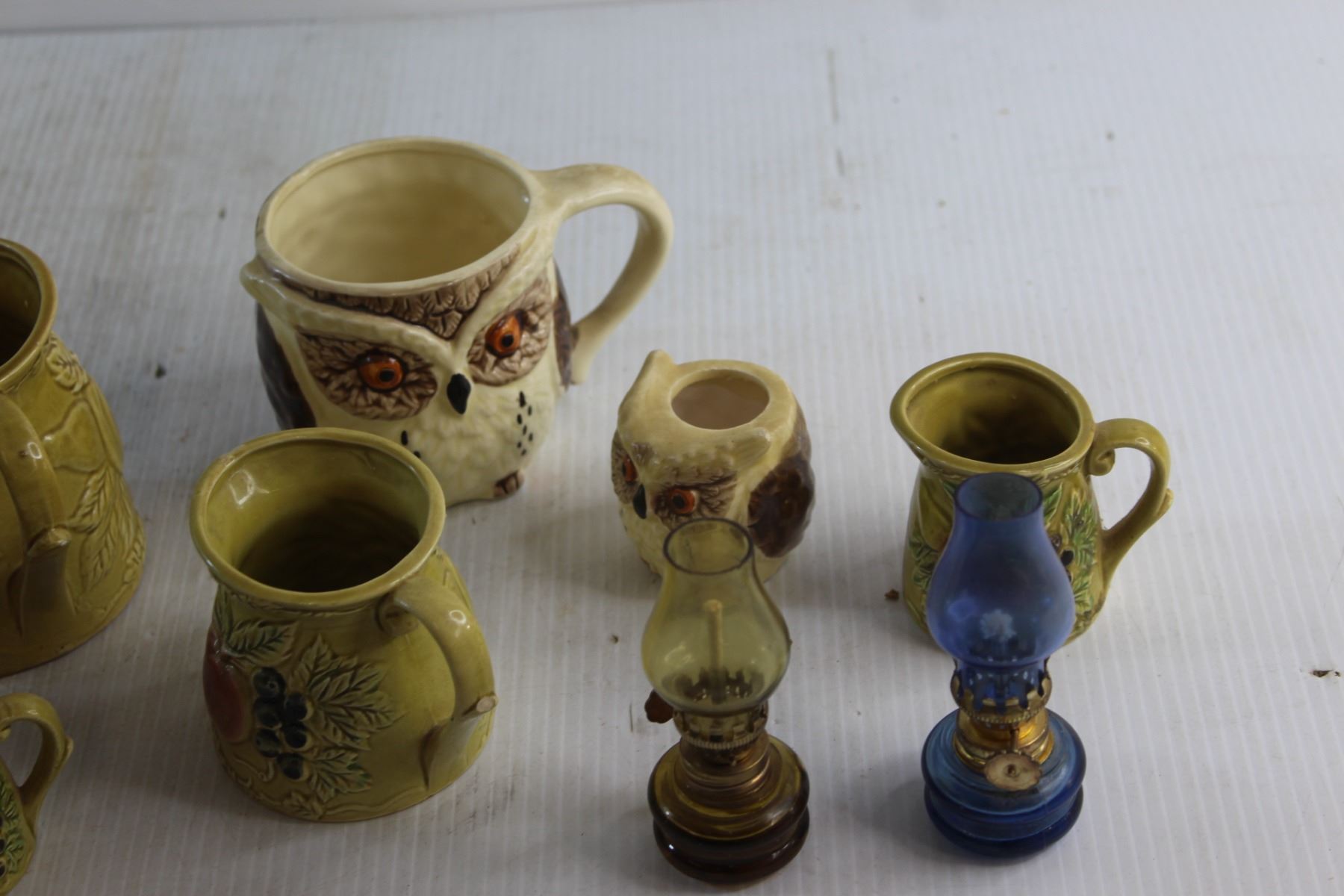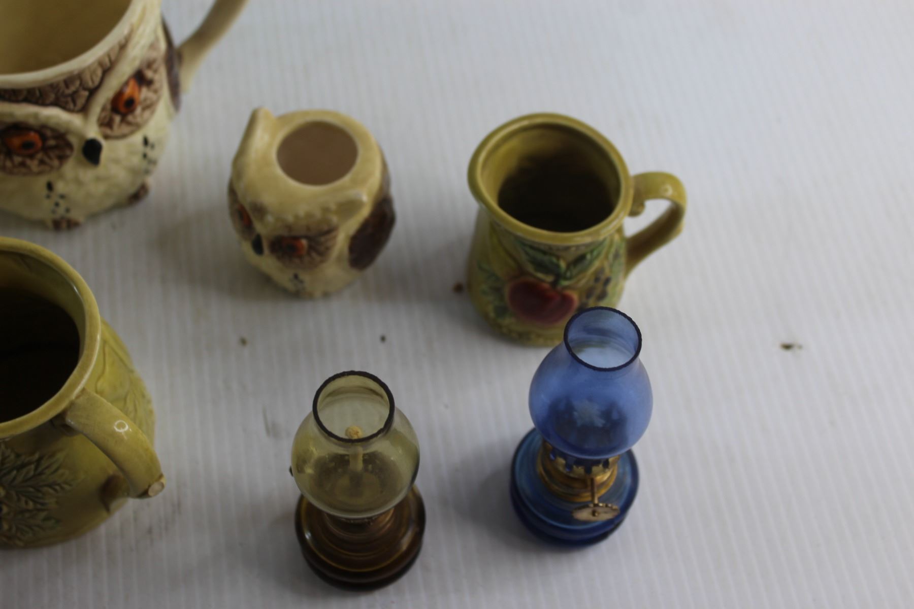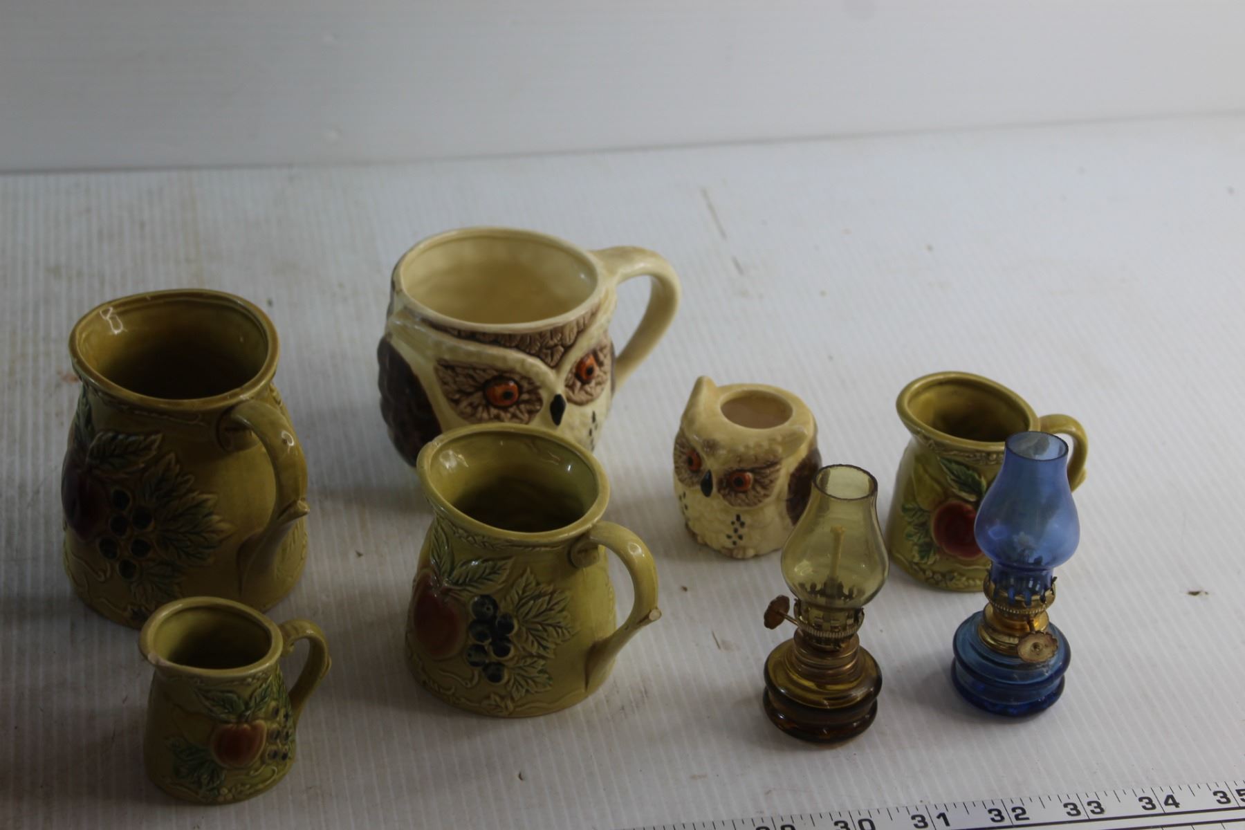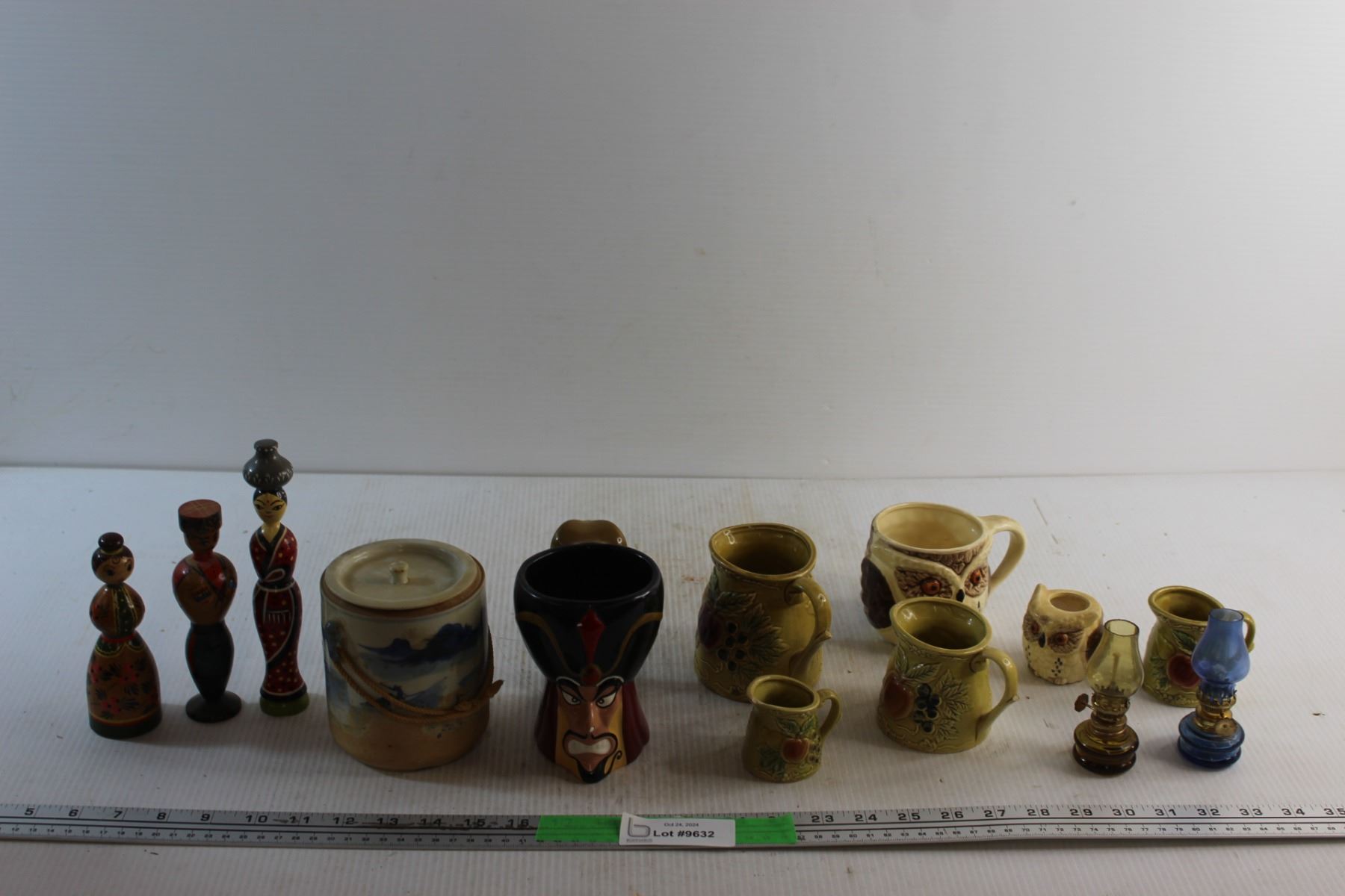 Miniature Kerosene Lamps, Creamers, Mugs and Wooden Statues