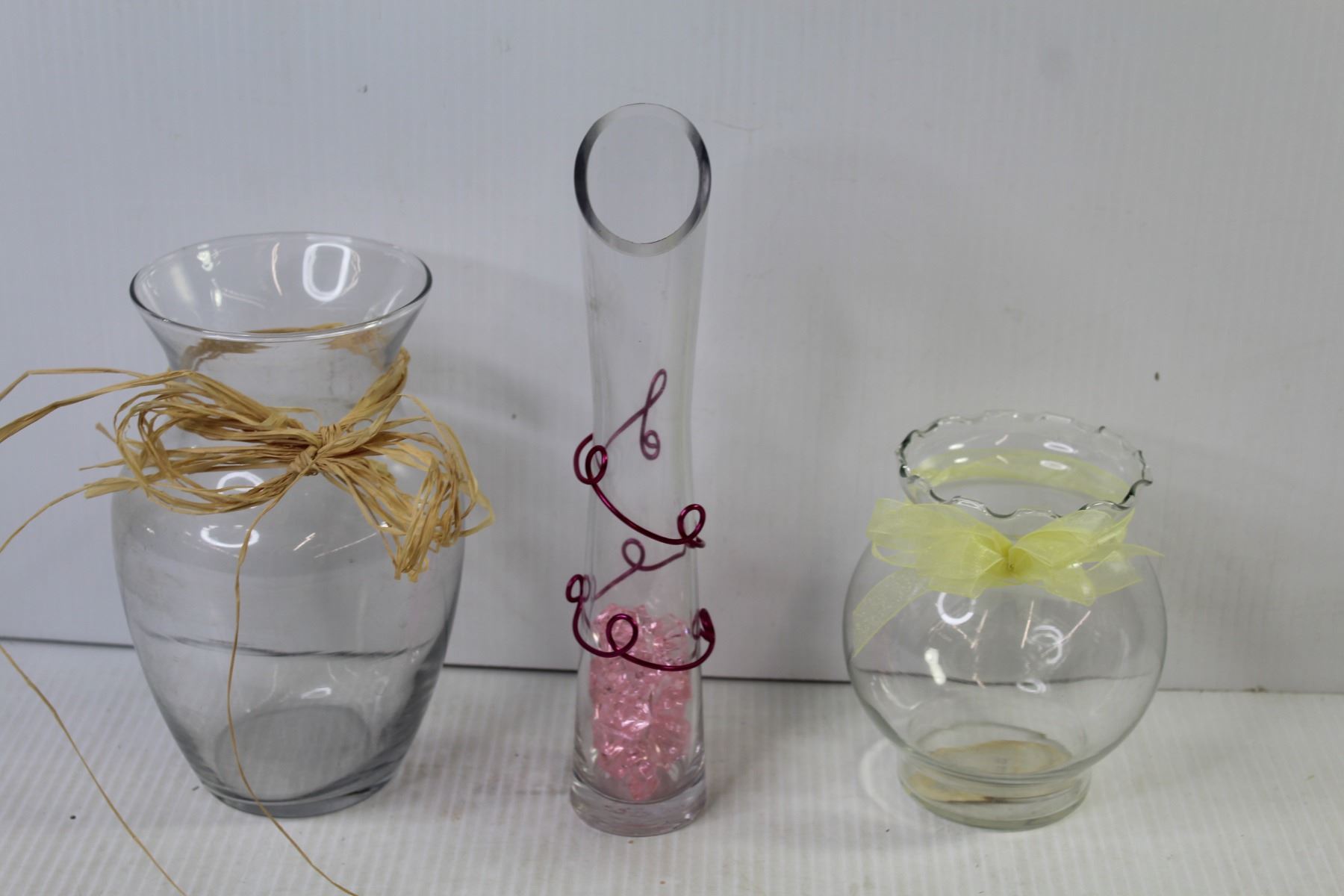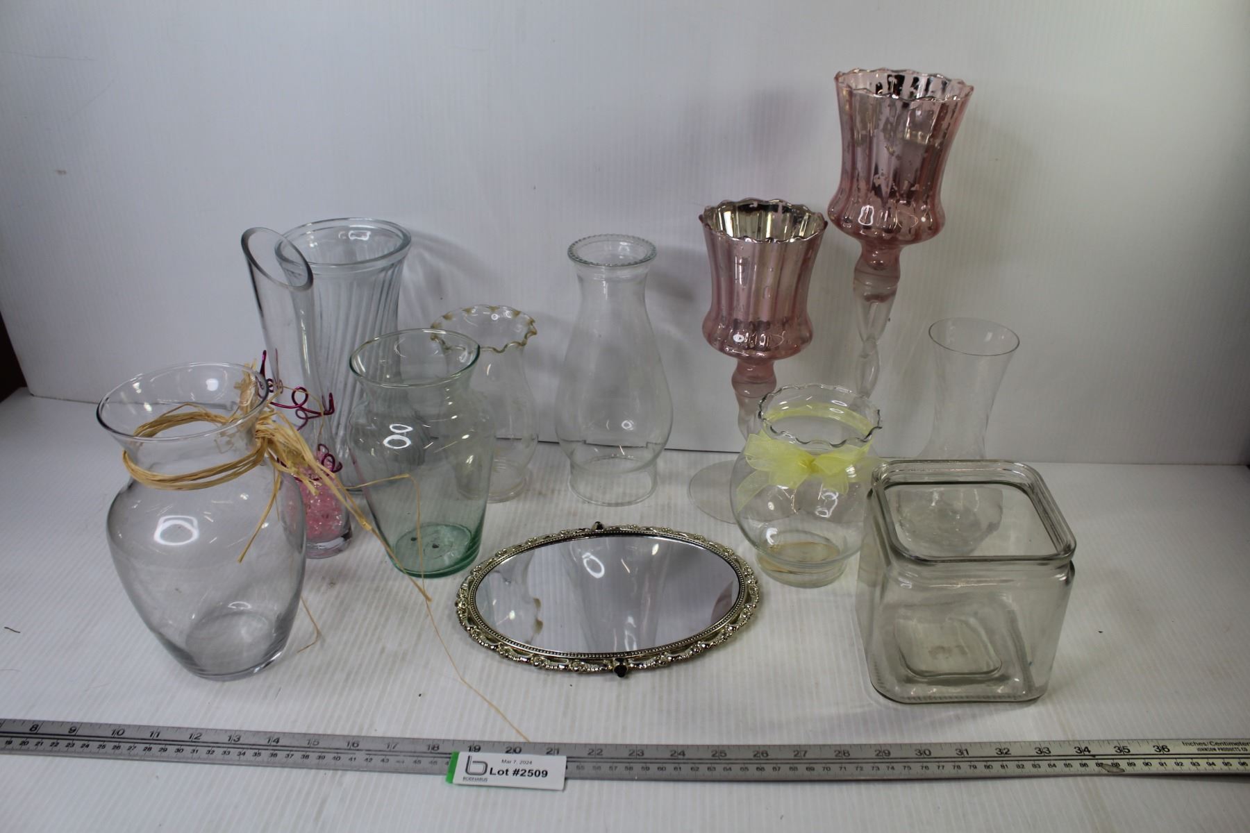 Mirror - (2) Pink Glass Candle Holders - (2) Oil Lamp Chimneys - (7) Glass Vases - Glass Jar