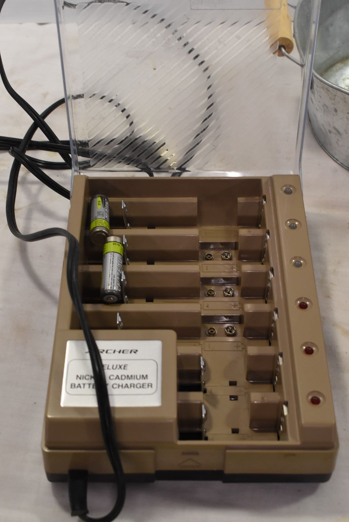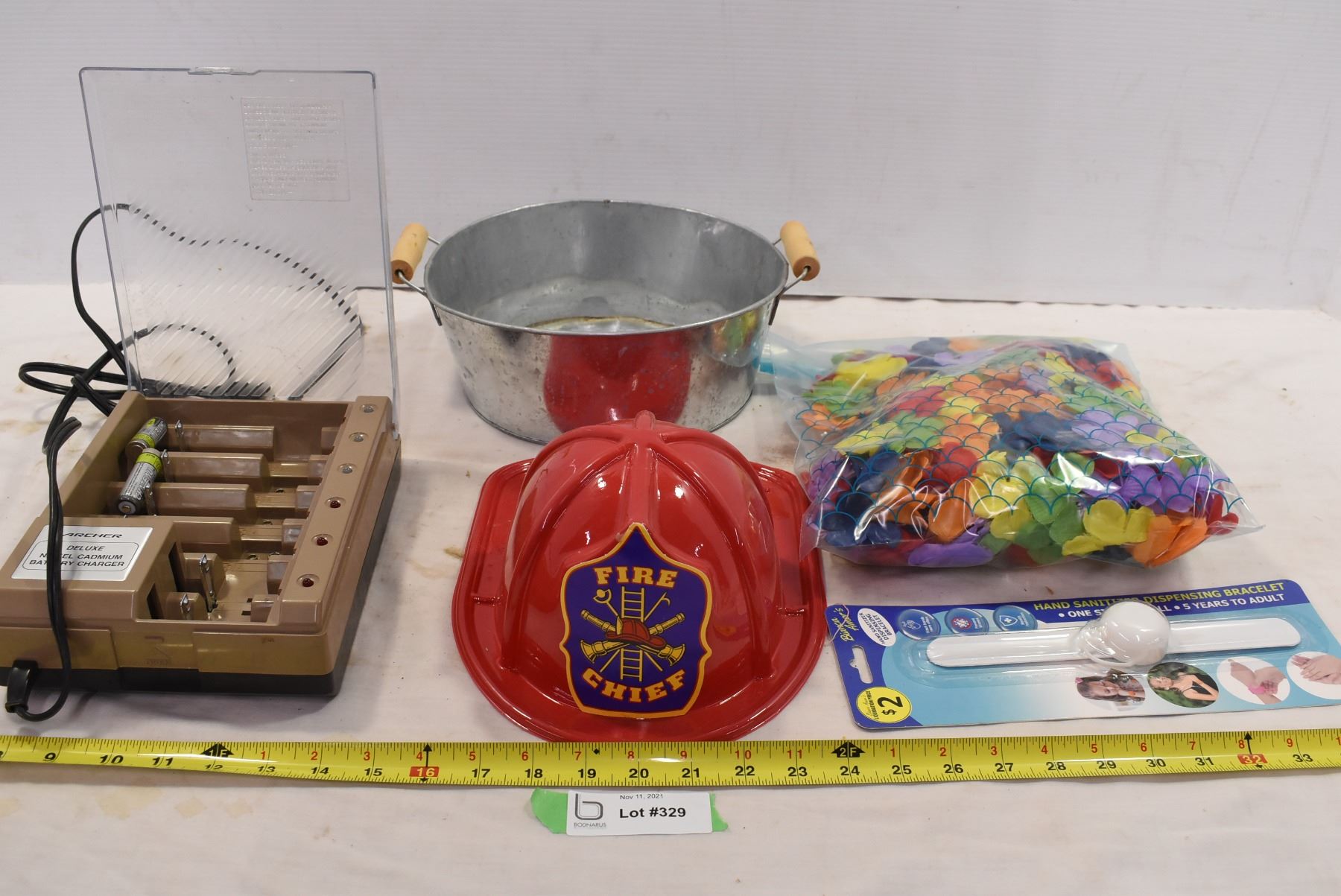 Misc. Lot w/ Battery Charger, Flowers, Plastic Fire Hat