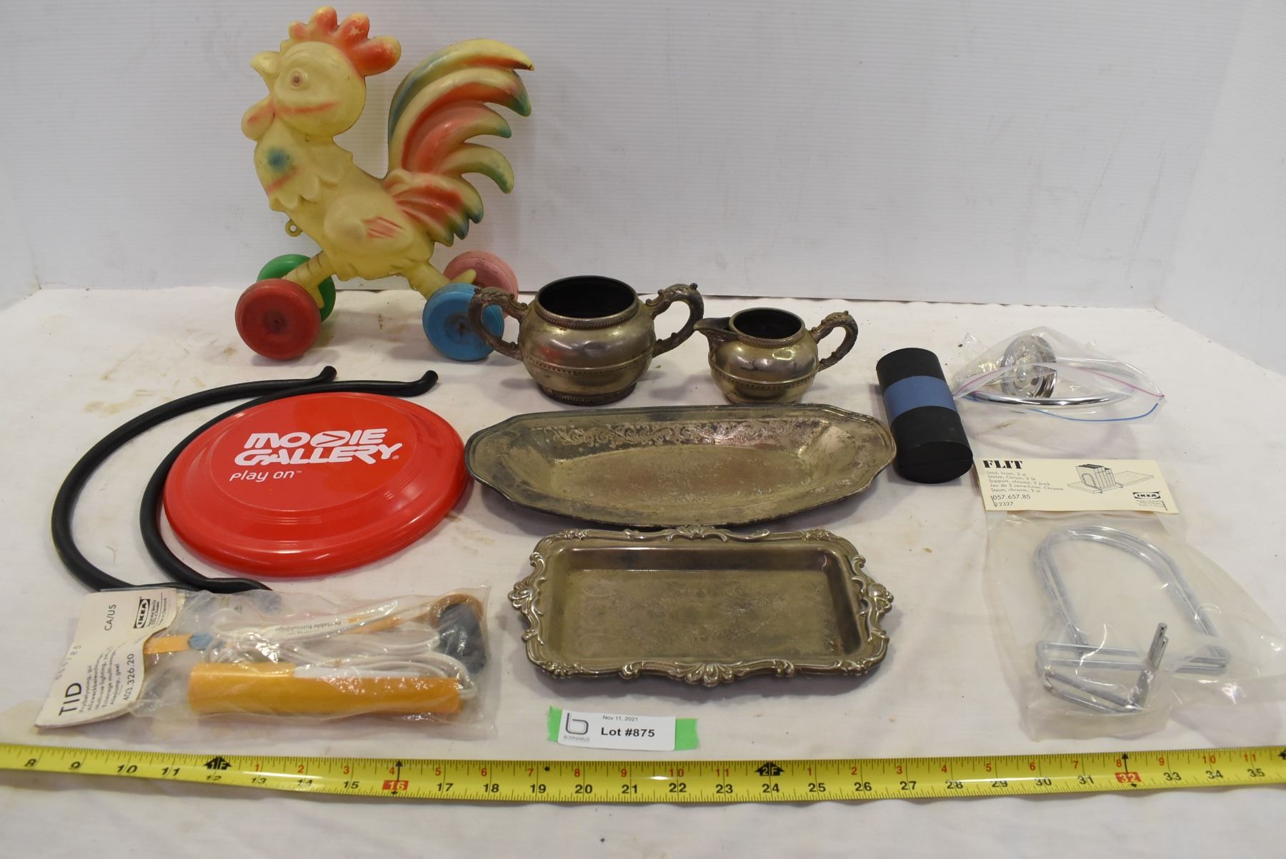 Misc. Lot w/ Silver Plates, Towel Holders, Chicken toy