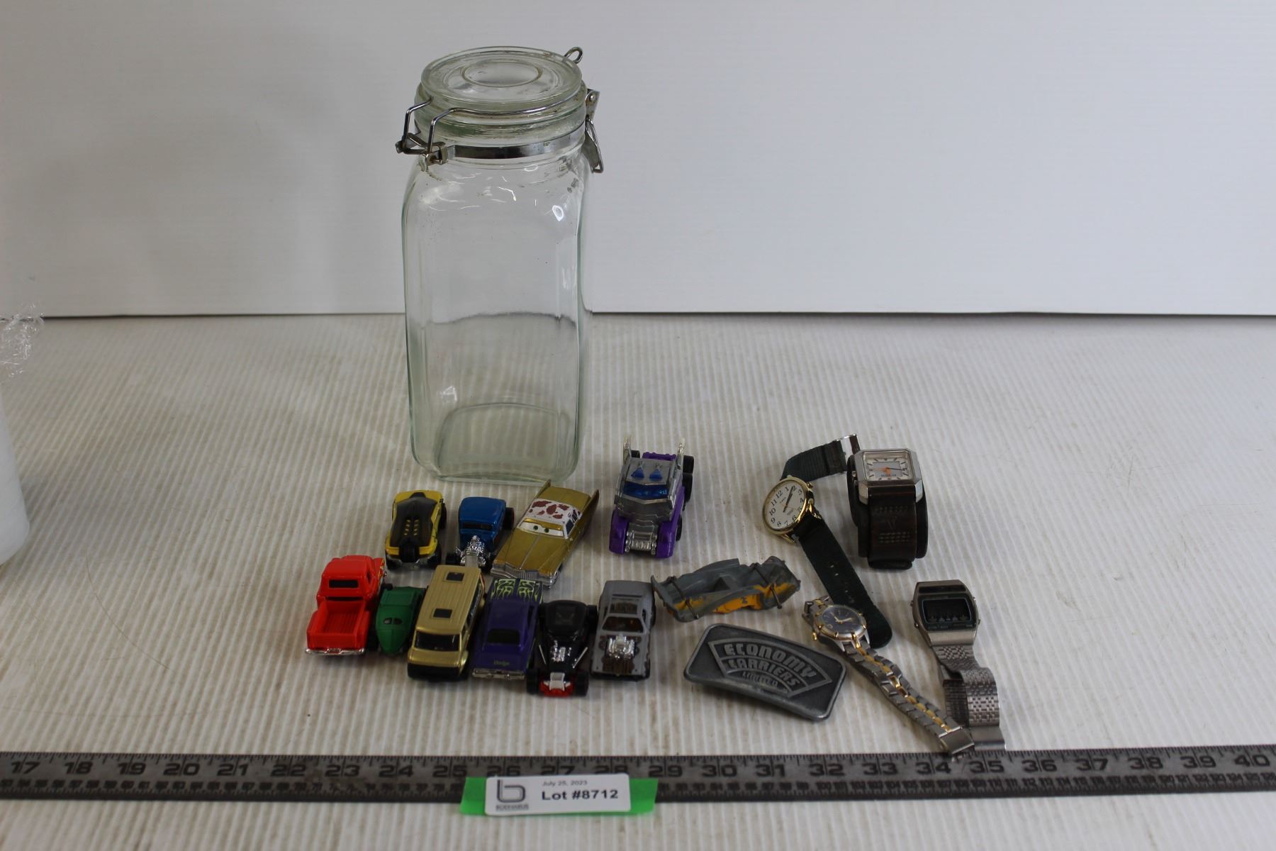 Misc. Toy Cars, Watches, Belt Buckle, Jar