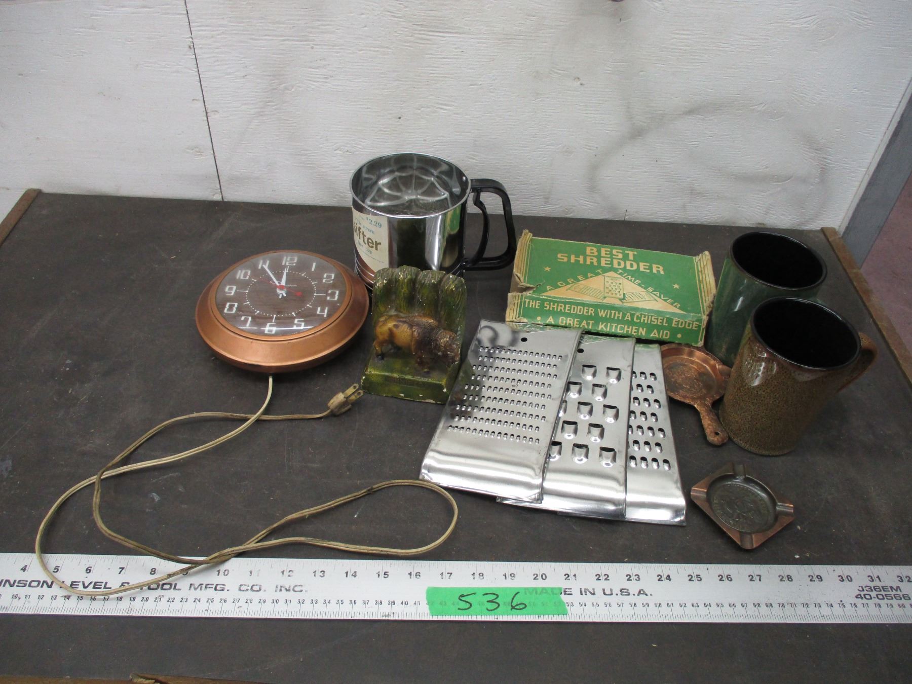 Mix lot - sifter, clock, buffalo book end, grater, tin ashtrays