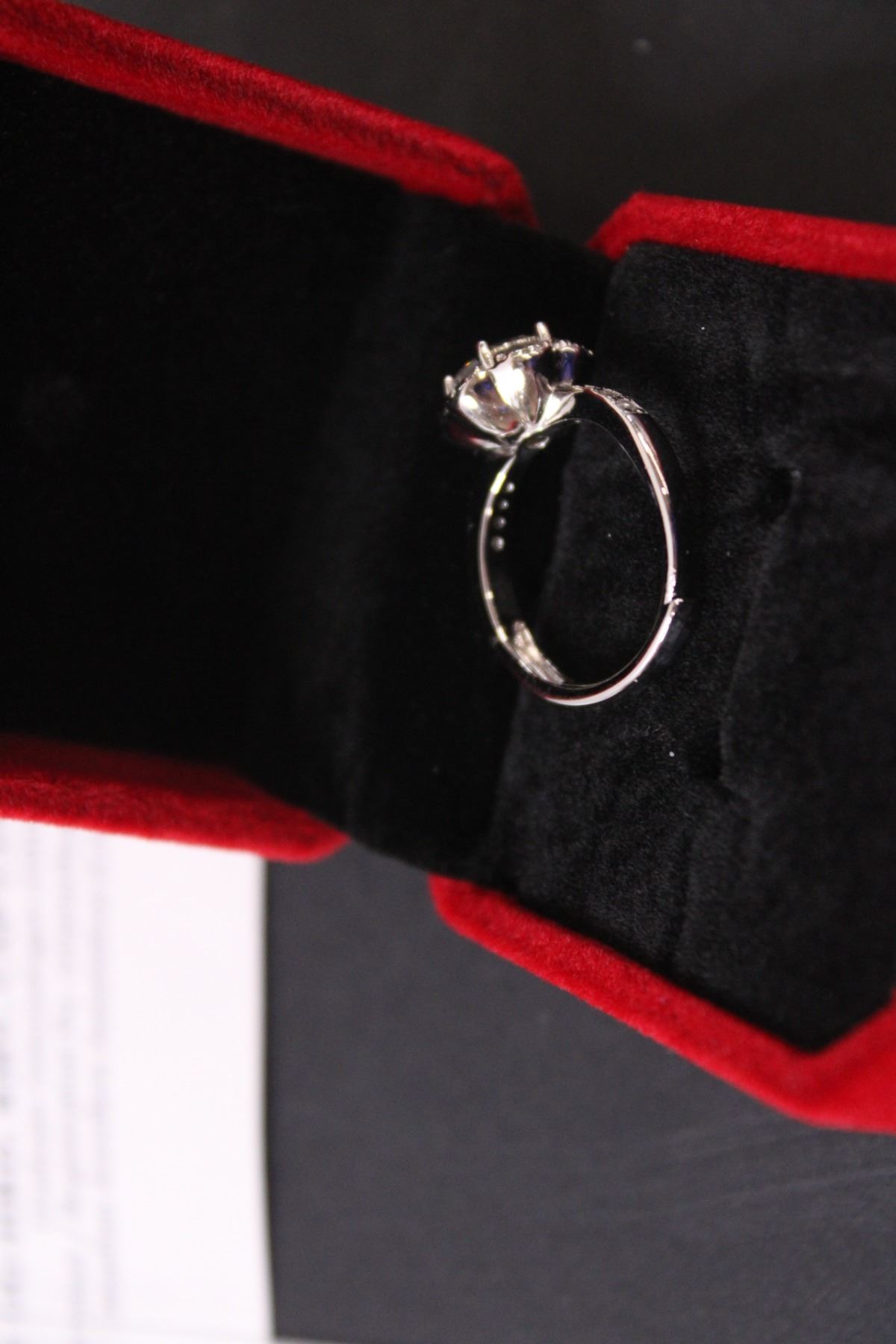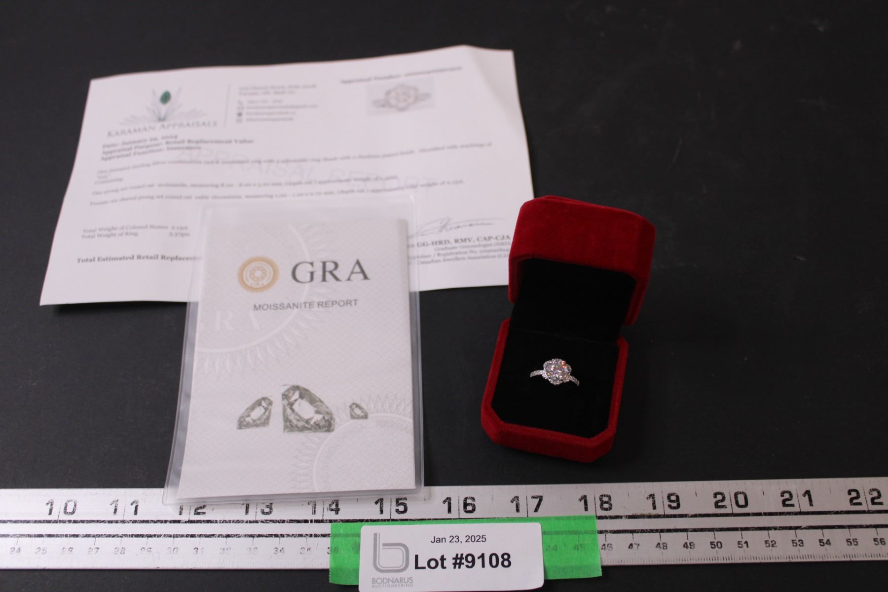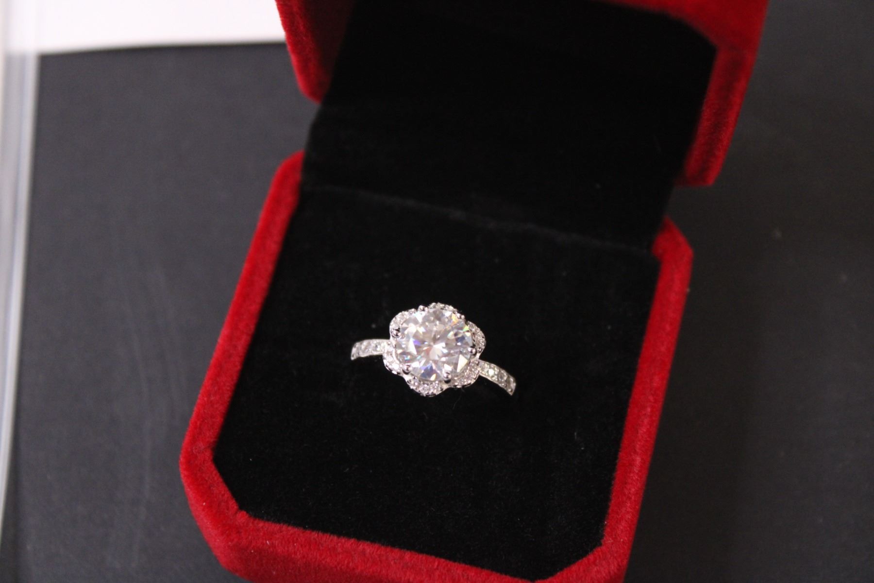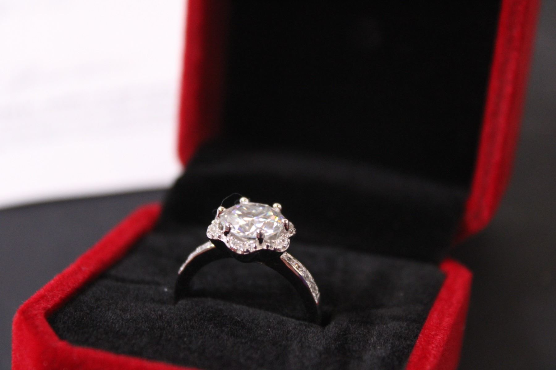 ^ Moissanite 2 Ct. GRA Certified Round Brilliant Cut VVS D COLOR w/ 26 Round Cut Cubic Zirconium Set Around Centre in Shank in Sterling Silver - Adjustable Size