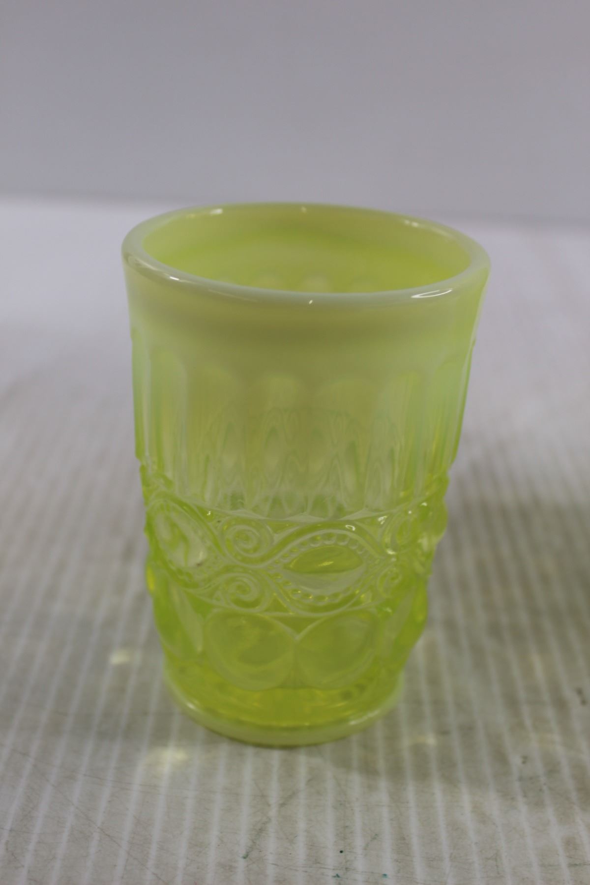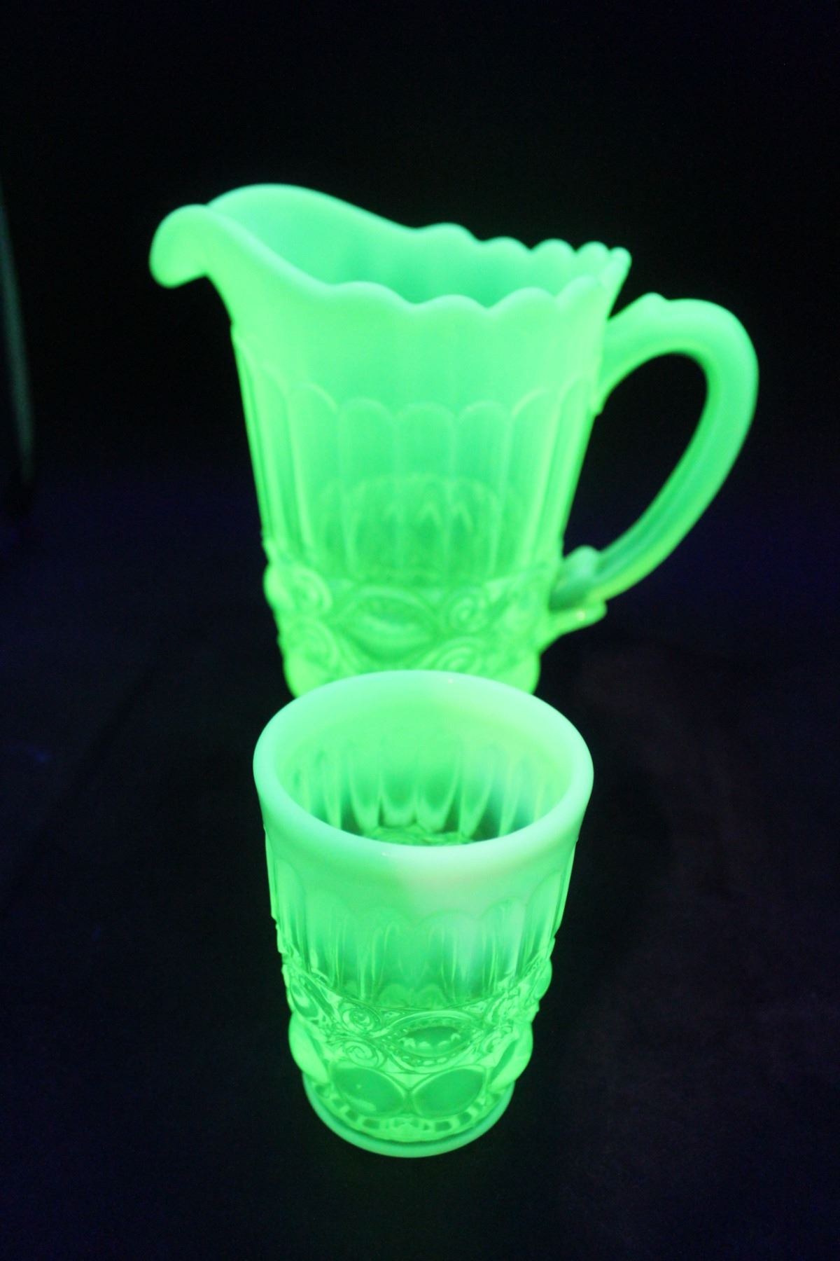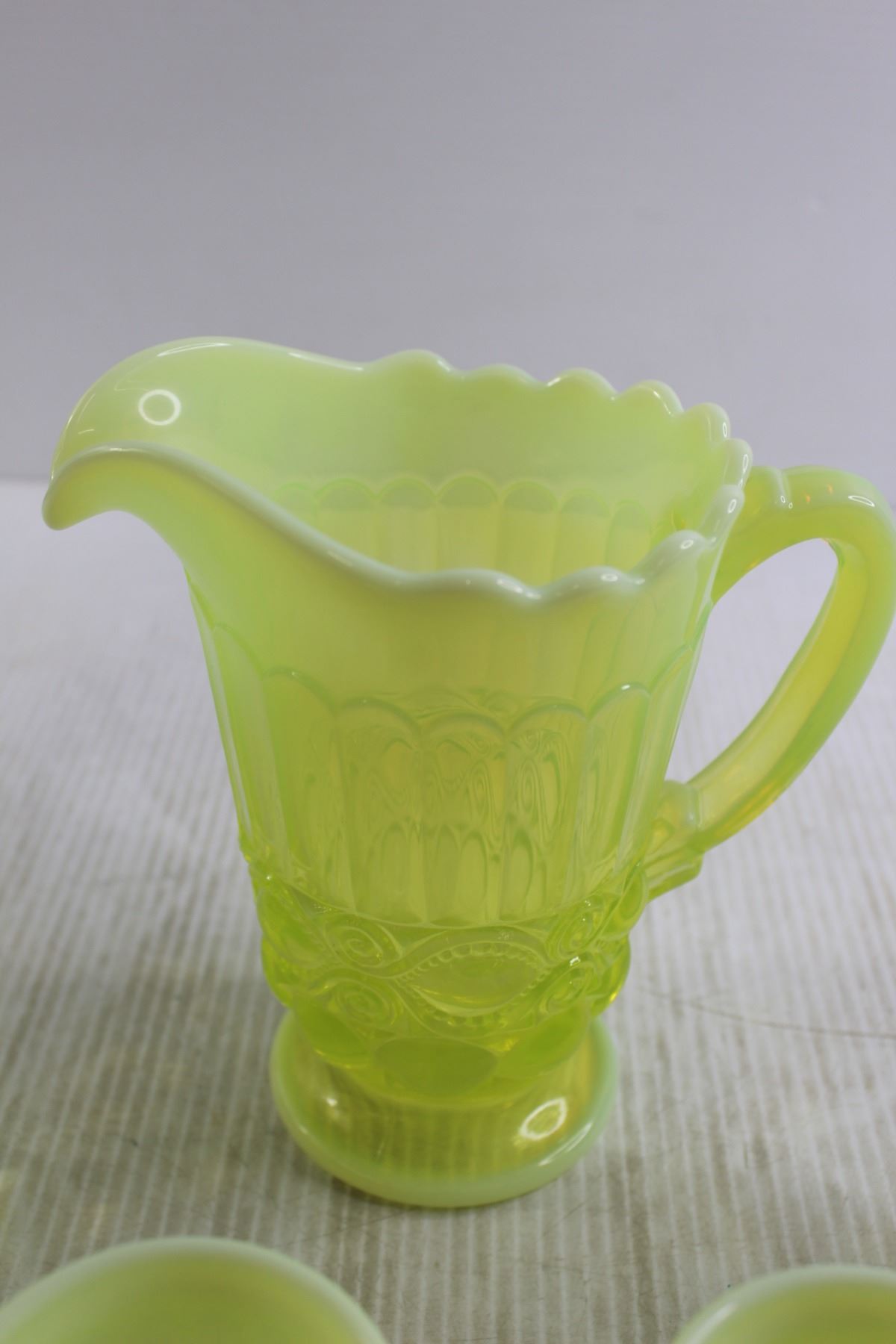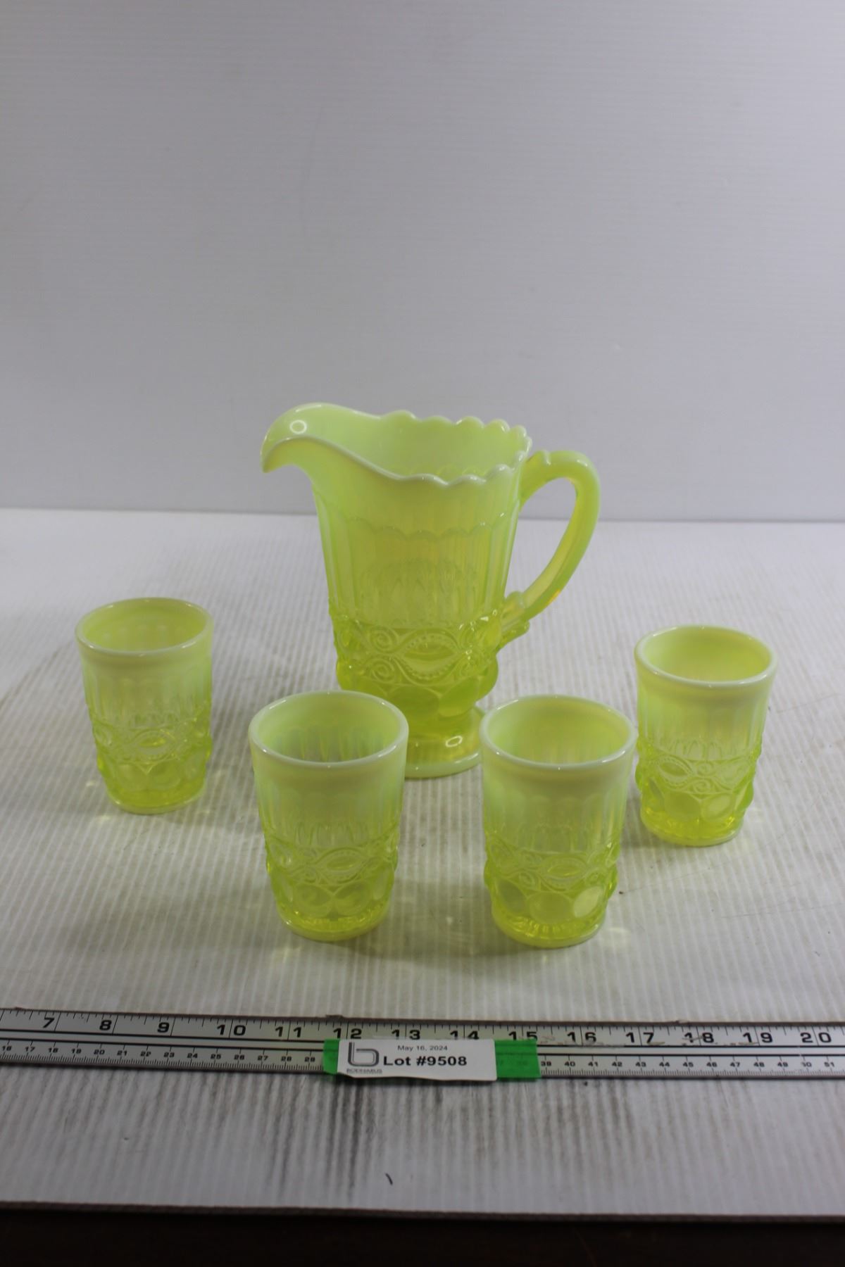 *Mosser Green Opalescent Eye Winker Uranium Vaseline Glass Pitcher Set