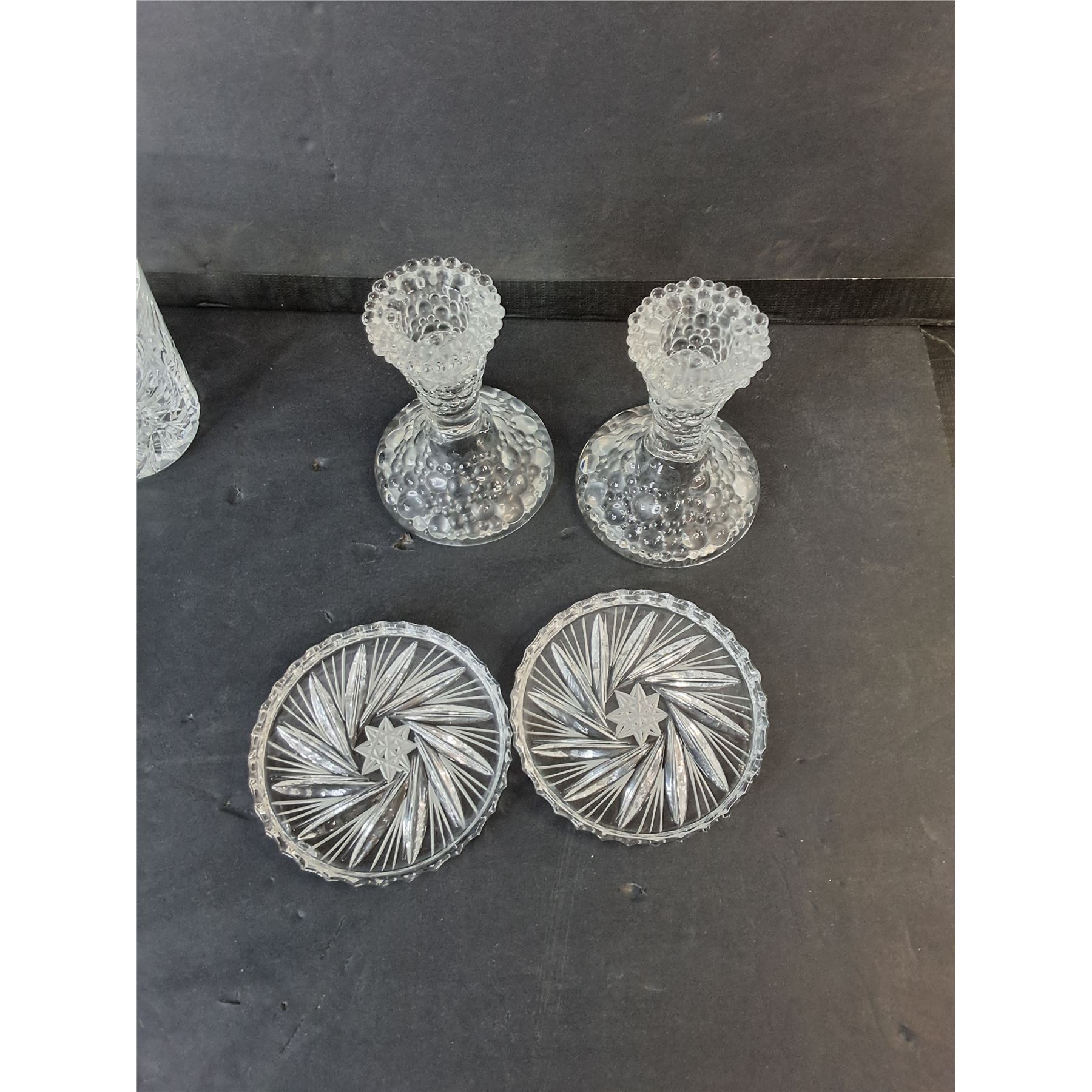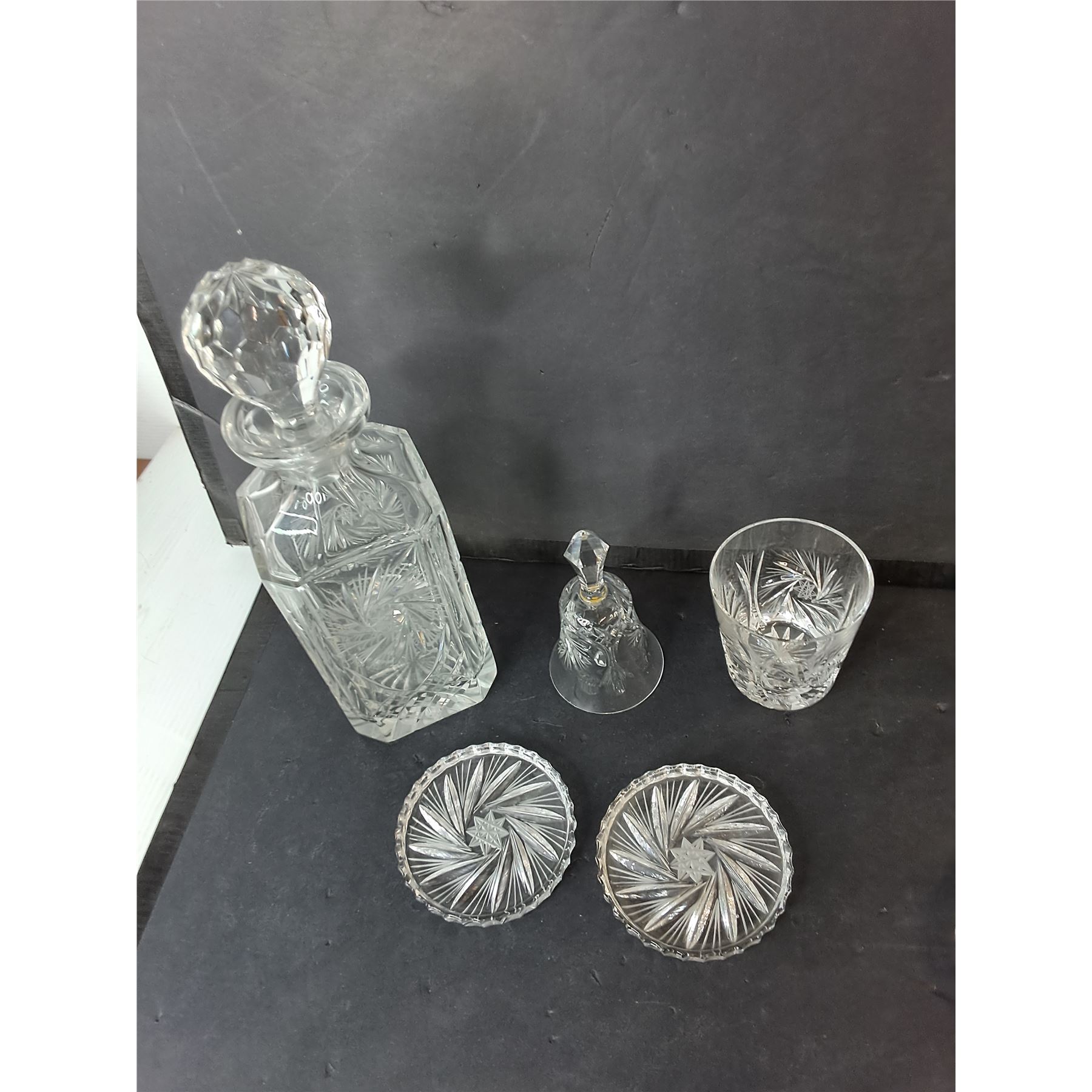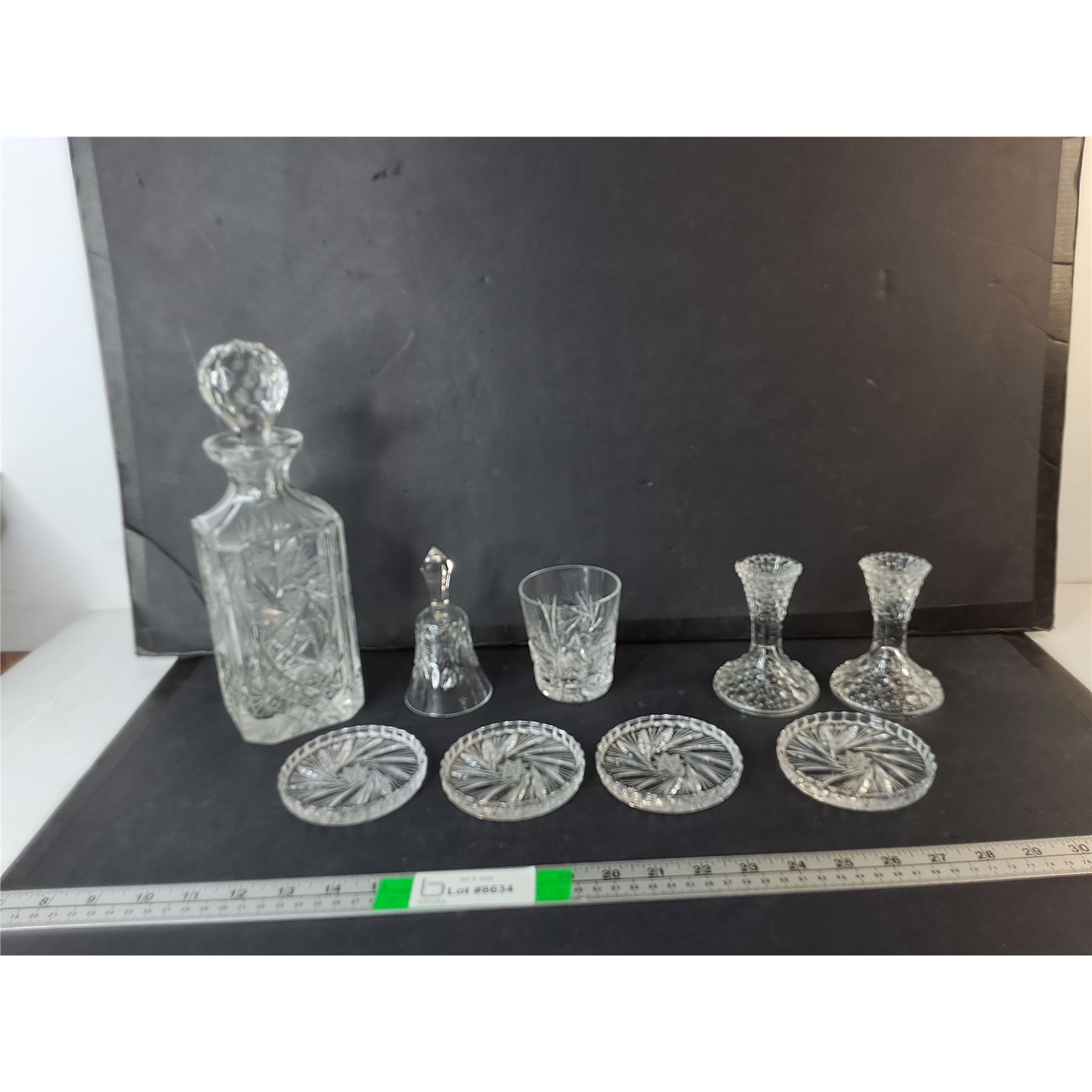 Mostly Crystal Set- Decanter, Bell, Coasters, Candleholders, Glass
