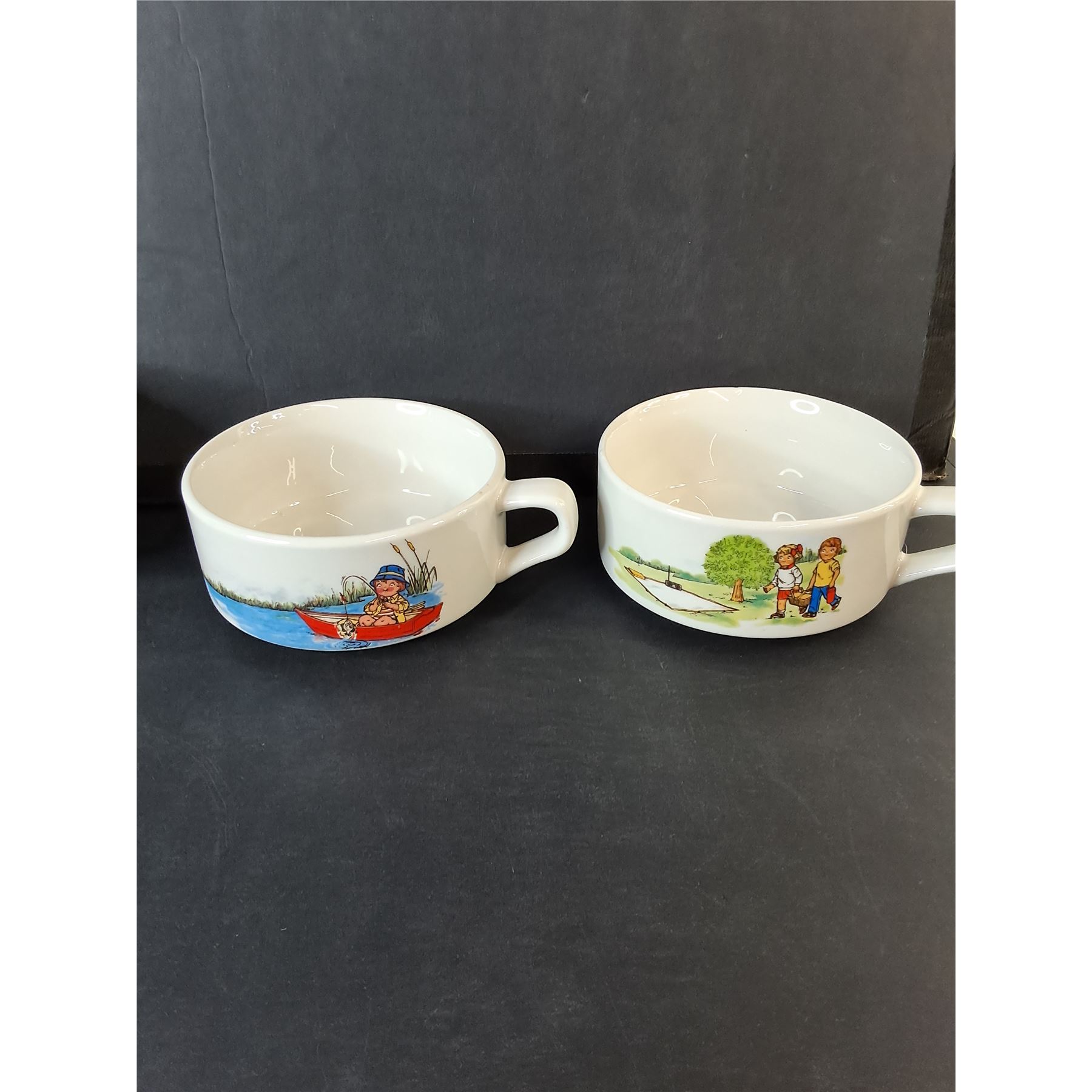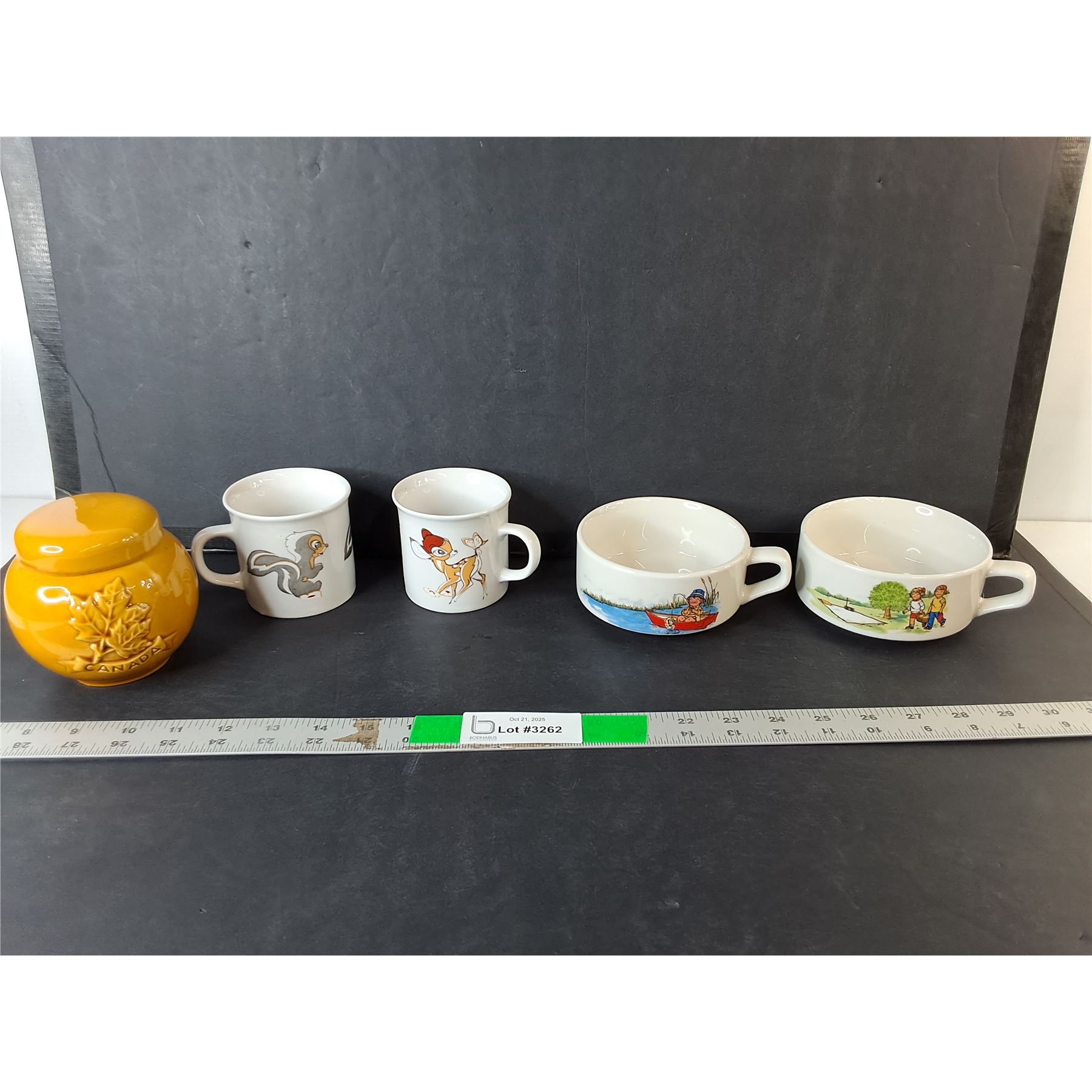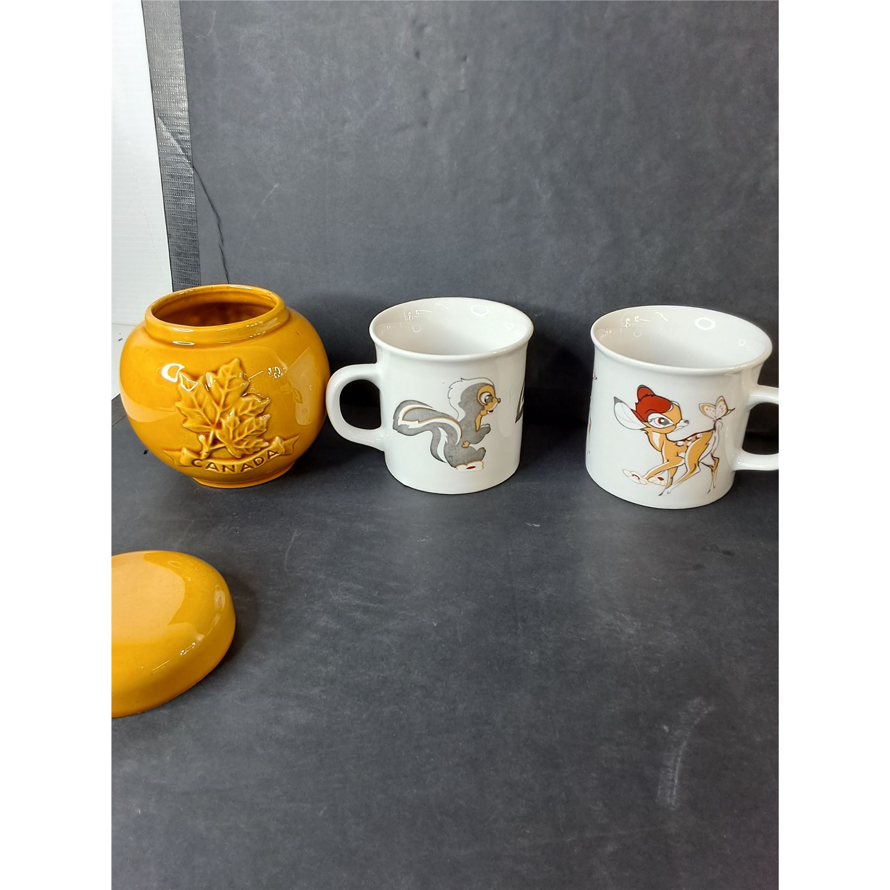 Mugs- Bambi & Flower Skunk,  Maple Leaf Jar, (2) Campbell's Soup Bowls