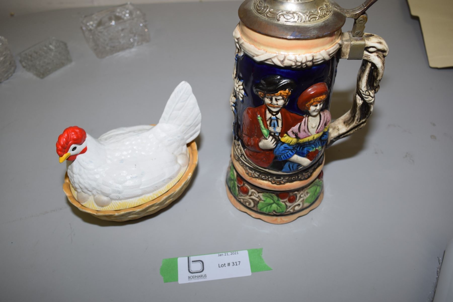 Musical Beer Stein & 1936-1960 Ceramic Chickens Nest