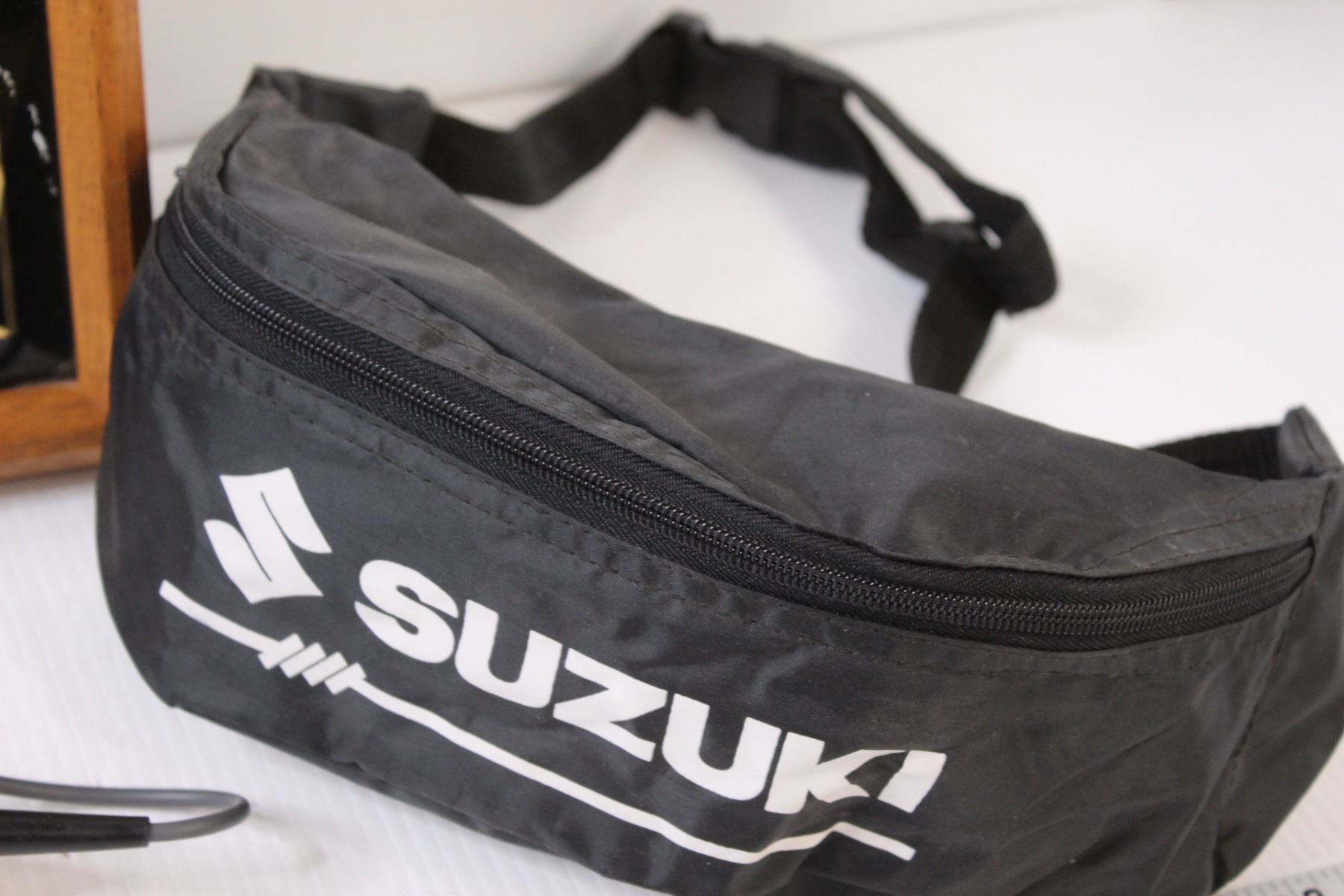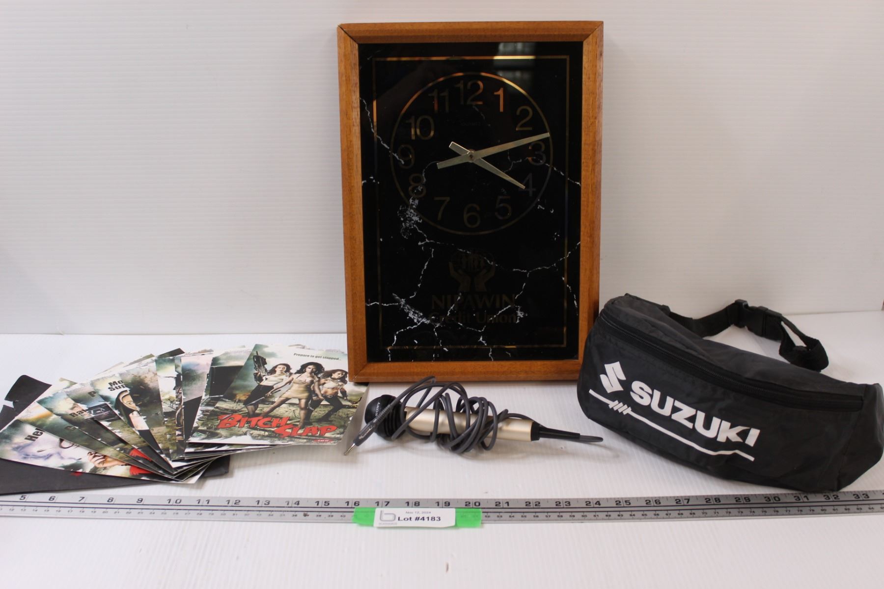 Nipawin Credit Union Clock, Suzuki Fanny Pack, Sony Microphone, "Bitch Slap" Photo Collector Cards Set